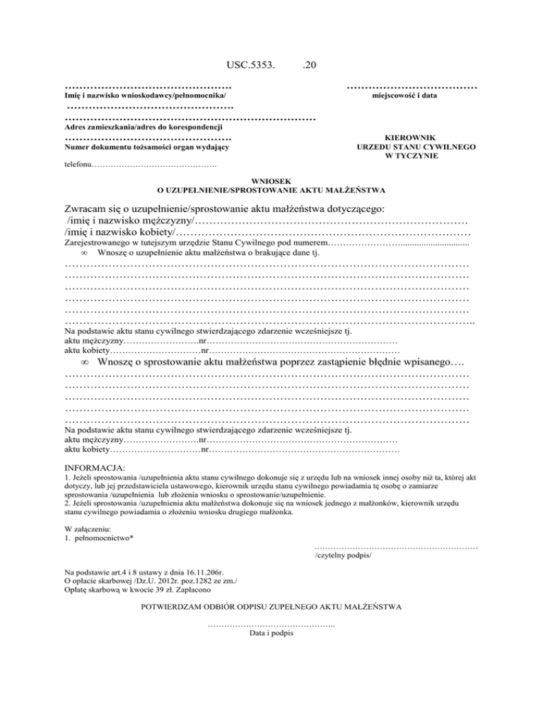USC.5353. .20 ………………………………………. ……………………………… Imię i nazwisko wnioskodawcy/pełnomocnika/ miejscowość i data ………………………………………. …………………………………………………………… Adres zamieszkania/adres do korespondencji ………………………………………. KIEROWNIK URZEDU STANU CYWILNEGO W TYCZYNIE Numer dokumentu tożsamości organ wydający telefonu………………………………………. WNIOSEK O UZUPEŁNIENIE/SPROSTOWANIE AKTU MAŁŻEŃSTWA Zwracam się o uzupełnienie/sprostowanie aktu małżeństwa dotyczącego: /imię i nazwisko mężczyzny/………………………………………………………………… /imię i nazwisko kobiety/……………………………………………………………………… Zarejestrowanego w tutejszym urzędzie Stanu Cywilnego pod numerem…………………….............................. • Wnoszę o uzupełnienie aktu małżeństwa o brakujące dane tj. ………………………………………………………………………………………………… ………………………………………………………………………………………………… ………………………………………………………………………………………………… ………………………………………………………………………………………………… ………………………………………………………………………………………………… ………………………………………………………………………………………………….. Na podstawie aktu stanu cywilnego stwierdzającego zdarzenie wcześniejsze tj. aktu mężczyzny…………………….nr……………………………………………………… aktu kobiety…………………………nr……………………………………………………… • Wnoszę o sprostowanie aktu małżeństwa poprzez zastąpienie błędnie wpisanego…. ………………………………………………………………………………………………… ………………………………………………………………………………………………… ………………………………………………………………………………………………… ………………………………………………………………………………………………… ………………………………………………………………………………………………… Na podstawie aktu stanu cywilnego stwierdzającego zdarzenie wcześniejsze tj. aktu mężczyzny…………………….nr……………………………………………………… aktu kobiety…………………………nr……………………………………………………… INFORMACJA: 1. Jeżeli sprostowania /uzupełnienia aktu stanu cywilnego dokonuje się z urzędu lub na wniosek innej osoby niż ta, której akt dotyczy, lub jej przedstawiciela ustawowego, kierownik urzędu stanu cywilnego powiadamia tę osobę o zamiarze sprostowania /uzupełnienia lub złożenia wniosku o sprostowanie/uzupełnienie. 2. Jeżeli sprostowania /uzupełnienia aktu małżeństwa dokonuje się na wniosek jednego z małżonków, kierownik urzędu stanu cywilnego powiadamia o złożeniu wniosku drugiego małżonka. W załączeniu: 1. pełnomocnictwo* …………………………………………………… /czytelny podpis/ Na podstawie art.4 i 8 ustawy z dnia 16.11.206r. O opłacie skarbowej /Dz.U. 2012r. poz.1282 ze zm./ Opłatę skarbową w kwocie 39 zł. Zapłacono POTWIERDZAM ODBIÓR ODPISU ZUPEŁNEGO AKTU MAŁŻEŃSTWA ……………………………………….. Data i podpis
