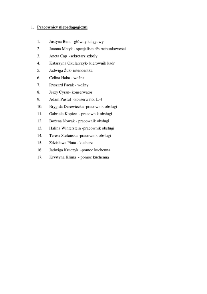 1. Pracownicy niepedagogiczni 1. Justyna Bem -główny księgowy 2. Joanna Metyk - specjalista d/s rachunkowości 3. Aneta Cap -sekretarz szkoły 4. Katarzyna Okularczyk- kierownik kadr 5. Jadwiga Żuk- intendentka 6. Celina Haba - woźna 7. Ryszard Pacak - woźny 8. Jerzy Cyran- konserwator 9. Adam Pustuł -konserwator L-4 10. Brygida Derewiecka -pracownik obsługi 11. Gabriela Kopiec - pracownik obsługi 12. Bożena Nowak - pracownik obsługi 13. Halina Winterstein -pracownik obsługi 14. Teresa Stefańska -pracownik obsługi 15. Zdzisława Pluta - kucharz 16. Jadwiga Kruczyk -pomoc kuchenna 17. Krystyna Klima - pomoc kuchenna