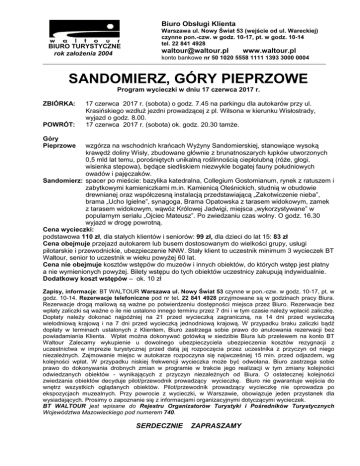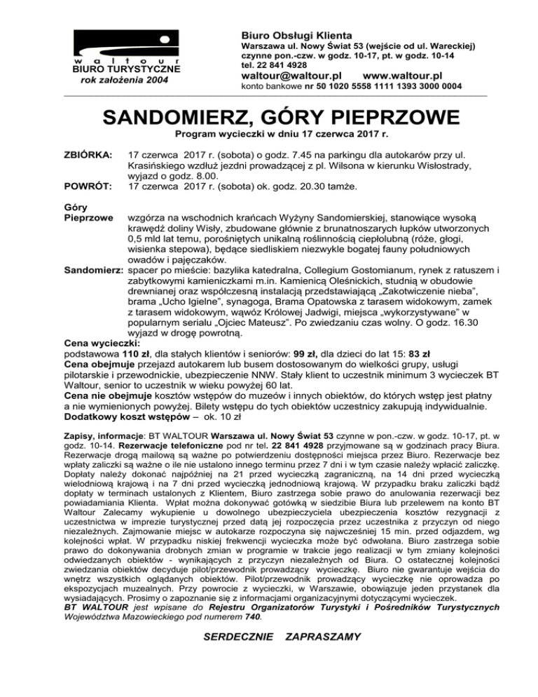 Biuro Obsługi Klienta BIURO TURYSTYCZNE rok założenia 2004 Warszawa ul. Nowy Świat 53 (wejście od ul. Wareckiej) czynne pon.-czw. w godz. 10-17, pt. w godz. 10-14 tel. 22 841 4928 [email protected] www.waltour.pl konto bankowe nr 50 1020 5558 1111 1393 3000 0004 ______________________________________________________________________________ SANDOMIERZ, GÓRY PIEPRZOWE Program wycieczki w dniu 17 czerwca 2017 r. ZBIÓRKA: POWRÓT: 17 czerwca 2017 r. (sobota) o godz. 7.45 na parkingu dla autokarów przy ul. Krasińskiego wzdłuż jezdni prowadzącej z pl. Wilsona w kierunku Wisłostrady, wyjazd o godz. 8.00. 17 czerwca 2017 r. (sobota) ok. godz. 20.30 tamże. Góry Pieprzowe wzgórza na wschodnich krańcach Wyżyny Sandomierskiej, stanowiące wysoką krawędź doliny Wisły, zbudowane głównie z brunatnoszarych łupków utworzonych 0,5 mld lat temu, porośniętych unikalną roślinnością ciepłolubną (róże, głogi, wisienka stepowa), będące siedliskiem niezwykle bogatej fauny południowych owadów i pajęczaków. Sandomierz: spacer po mieście: bazylika katedralna, Collegium Gostomianum, rynek z ratuszem i zabytkowymi kamieniczkami m.in. Kamienicą Oleśnickich, studnią w obudowie drewnianej oraz współczesną instalacją przedstawiającą „Zakotwiczenie nieba”, brama „Ucho Igielne”, synagoga, Brama Opatowska z tarasem widokowym, zamek z tarasem widokowym, wąwóz Królowej Jadwigi, miejsca „wykorzystywane” w popularnym serialu „Ojciec Mateusz”. Po zwiedzaniu czas wolny. O godz. 16.30 wyjazd w drogę powrotną. Cena wycieczki: podstawowa 110 zł, dla stałych klientów i seniorów: 99 zł, dla dzieci do lat 15: 83 zł Cena obejmuje przejazd autokarem lub busem dostosowanym do wielkości grupy, usługi pilotarskie i przewodnickie, ubezpieczenie NNW. Stały klient to uczestnik minimum 3 wycieczek BT Waltour, senior to uczestnik w wieku powyżej 60 lat. Cena nie obejmuje kosztów wstępów do muzeów i innych obiektów, do których wstęp jest płatny a nie wymienionych powyżej. Bilety wstępu do tych obiektów uczestnicy zakupują indywidualnie. Dodatkowy koszt wstępów – ok. 10 zł Zapisy, informacje: BT WALTOUR Warszawa ul. Nowy Świat 53 czynne w pon.-czw. w godz. 10-17, pt. w godz. 10-14. Rezerwacje telefoniczne pod nr tel. 22 841 4928 przyjmowane są w godzinach pracy Biura. Rezerwacje drogą mailową są ważne po potwierdzeniu dostępności miejsca przez Biuro. Rezerwacje bez wpłaty zaliczki są ważne o ile nie ustalono innego terminu przez 7 dni i w tym czasie należy wpłacić zaliczkę. Dopłaty należy dokonać najpóźniej na 21 przed wycieczką zagraniczną, na 14 dni przed wycieczką wielodniową krajową i na 7 dni przed wycieczką jednodniową krajową. W przypadku braku zaliczki bądź dopłaty w terminach ustalonych z Klientem, Biuro zastrzega sobie prawo do anulowania rezerwacji bez powiadamiania Klienta. Wpłat można dokonywać gotówką w siedzibie Biura lub przelewem na konto BT Waltour Zalecamy wykupienie u dowolnego ubezpieczyciela ubezpieczenia kosztów rezygnacji z uczestnictwa w imprezie turystycznej przed datą jej rozpoczęcia przez uczestnika z przyczyn od niego niezależnych. Zajmowanie miejsc w autokarze rozpoczyna się najwcześniej 15 min. przed odjazdem, wg kolejności wpłat. W przypadku niskiej frekwencji wycieczka może być odwołana. Biuro zastrzega sobie prawo do dokonywania drobnych zmian w programie w trakcie jego realizacji w tym zmiany kolejności odwiedzanych obiektów - wynikających z przyczyn niezależnych od Biura. O ostatecznej kolejności zwiedzania obiektów decyduje pilot/przewodnik prowadzący wycieczkę. Biuro nie gwarantuje wejścia do wnętrz wszystkich oglądanych obiektów. Pilot/przewodnik prowadzący wycieczkę nie oprowadza po ekspozycjach muzealnych. Przy powrocie z wycieczki, w Warszawie, obowiązuje jeden przystanek dla wysiadających. Prosimy o zapoznanie się z informacjami organizacyjnymi dotyczącymi wycieczek. BT WALTOUR jest wpisane do Rejestru Organizatorów Turystyki i Pośredników Turystycznych Województwa Mazowieckiego pod numerem 740. SERDECZNIE ZAPRASZAMY