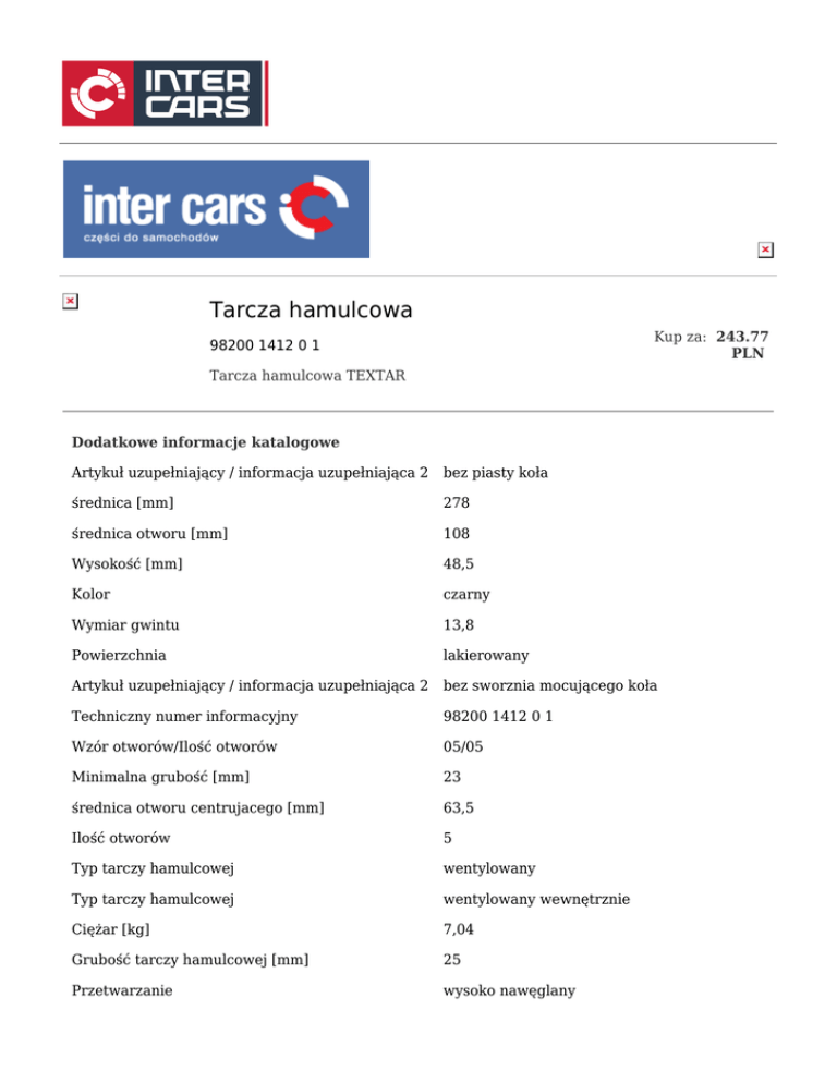Tarcza hamulcowa Kup za: 243.77 PLN 98200 1412 0 1 Tarcza hamulcowa TEXTAR Dodatkowe informacje katalogowe Artykuł uzupełniający / informacja uzupełniająca 2 bez piasty koła średnica [mm] 278 średnica otworu [mm] 108 Wysokość [mm] 48,5 Kolor czarny Wymiar gwintu 13,8 Powierzchnia lakierowany Artykuł uzupełniający / informacja uzupełniająca 2 bez sworznia mocującego koła Techniczny numer informacyjny 98200 1412 0 1 Wzór otworów/Ilość otworów 05/05 Minimalna grubość [mm] 23 średnica otworu centrujacego [mm] 63,5 Ilość otworów 5 Typ tarczy hamulcowej wentylowany Typ tarczy hamulcowej wentylowany wewnętrznie Ciężar [kg] 7,04 Grubość tarczy hamulcowej [mm] 25 Przetwarzanie wysoko nawęglany Infolinia: 801 80 20 20 08-03-2017 akcesoria.intercars.com.pl