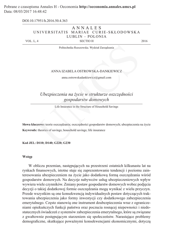 Pobrane z czasopisma Annales H - Oeconomia http://oeconomia.annales.umcs.pl Data: 08/03/2017 16:48:42 DOI:10.17951/h.2016.50.4.363 ANNALES U N I V E R S I TAT I S M A R I A E C U R I E - S K Ł O D O W S K A LU BLI N – P O L ONIA VOL. L, 4 SECTIO H 2016 CS Politechnika Rzeszowska. Wydział Zarządzania ANNA IZABELA OSTROWSKA-DANKIEWICZ [email protected] M Ubezpieczenia na życie w strukturze oszczędności gospodarstw domowych Life Insurance in the Structure of Household Savings U Słowa kluczowe: teorie oszczędzania; oszczędności gospodarstw domowych; ubezpieczenia na życie Keywrods: theories of savings; household savings; life insurance Kod JEL: D110; D140; G220; G230 Wstęp W obliczu przemian, następujących na przestrzeni ostatnich kilkunastu lat na rynkach finansowych, istotne staje się zaprezentowanie tendencji i poziomu zainteresowania ubezpieczeniem na życie jako dodatkową formą oszczędzania wśród gospodarstw domowych. Na decyzje nabywców usług ubezpieczeniowych wpływ wywiera wiele czynników. Zmiany postaw gospodarstw domowych wobec podjęcia decyzji o takiej dodatkowej formie oszczędzania mogą wynikać z wielu przyczyn. Przede wszystkim są one konsekwencją indywidualnych postaw dotyczących traktowania ubezpieczenia jako formy inwestycji czy dodatkowego zabezpieczenia emerytalnego. Często stanowią one instrument doubezpieczenia wraz z ograniczeniami opiekuńczych funkcji państwa oraz poczucia rosnącej niepewności i niedostatecznych świadczeń z systemów zabezpieczenia emerytalnego, które są związane z gwałtownie postępującym starzeniem się społeczeństw. Narastające problemy demograficzne, skutkujące poważnymi konsekwencjami ekonomicznymi, dotyczą Pobrane z czasopisma Annales H - Oeconomia http://oeconomia.annales.umcs.pl Data: 08/03/2017 16:48:42 364 ANNA IZABELA OSTROWSKA-DANKIEWICZ CS większości krajów, co wymusza konieczność zaznajomienia się z alternatywnymi programami ubezpieczeń emerytalnych oraz dokonania wyboru dodatkowych ubezpieczeń o charakterze oszczędnościowym w formie różnorodnie skonstruowanych produktów, które są oferowane przez większość ubezpieczycieli reagujących na zmieniające się zapotrzebowanie nabywców ubezpieczeń. Celem opracowania jest omówienie teoretycznych podstaw oszczędzania, wskazanie motywów oraz ekonomicznych czynników skłonności gospodarstw domowych do oszczędzania, wskazanie roli ubezpieczycieli na rynku finansowym i najistotniejszych ubezpieczeniowych produktów oszczędnościowych, a także zaprezentowanie poziomu i struktury oszczędności gospodarstw domowych w Polsce oraz z podziałem na regiony świata, ze szczególnym uwzględnieniem ubezpieczeń na życie i ubezpieczeń emerytalnych. M 1. Teoretyczne podstawy motywów oszczędzania U Podstawowymi czynnikami determinującymi zachowania człowieka są jego potrzeby, stąd bodźcem, który często przez całe życie kieruje zachowaniami ludzkimi, jest dążenie do zaspokojenia potrzeby ekonomicznego bezpieczeństwa. Do najbardziej znanych teorii, w których wyróżniono potrzebę bezpieczeństwa, należy zaliczyć hierarchię potrzeb A. Maslowa, który wyróżniając pięć grup potrzeb, uszeregował je od najważniejszych do mniej ważnych, wskazując potrzeby: 1) fizjologiczne, 2) bezpieczeństwa, 3) przynależności, 4) uznania i szacunku, 5) samorealizacji [Maslow, 1954]. Z punktu widzenia analiz dotyczących decyzji zakupu ubezpieczeń hierarchia Maslowa może stanowić użyteczne narzędzie do wyjaśnienia motywacji konsumenta w zakresie zaspokajania potrzeb bezpieczeństwa (zarówno osobistego, jak i finansowego) czy zabezpieczenia przyszłości jako jednej z podstawowych potrzeb człowieka, która może być bezpośrednio związana z potrzebą ubezpieczeniową. W czasach narastającej niepewności co do zaspokojenia potrzeby ekonomicznego bezpieczeństwa, zwłaszcza w sytuacjach kryzysowych na rynkach finansowych, szczególnego znaczenia nabierają modele, które stanowią o teoretycznych podstawach nowoczesnego planowania finansowego gospodarstw domowych, które zaczerpnięto z teorii konsumpcji i wypływającego z niej nurtu związanego z cyklem życia [Feldman, Pietrzyk, Rokita, 2014, s. 37]. Istotny wpływ na podjęcie decyzji o zakupie ubezpieczenia ma wysokość i możliwość rozdysponowania bieżących dochodów rozporządzalnych oraz przewidywanie ich kształtowania w przyszłości, z reguły do końca życia. Jest to tzw. hipoteza cyklu życia, której prekursorem był F. Modigliani [1957, s. 99–124]. Następnie teoria ta była rozwijana przez M.E. Yaariego [1965, s. 137–150], wnosząc, iż prawie każdy nabywca, planując swoje wydatki, uwzględnia dochody nie tylko w bliższej przyszłości, lecz w skali całego życia. Planowanie to musi bowiem dotyczyć uwzględnienia przyszłego, z reguły zmieniającego się w czasie, statusu społecznego [Bywalec, Rudnicki, 1999, s. 43]. Pobrane z czasopisma Annales H - Oeconomia http://oeconomia.annales.umcs.pl Data: 08/03/2017 16:48:42 Ubezpieczenia na życie w strukturze oszczędności gospodarstw domowych 365 Oszczędzanie, rozumiane jako odraczanie konsumpcji dochodów, oprócz hipotezy cyklu życia pojawiało się także w innych popularnych teoriach wyjaśniających motywy oszczędzania, do których należy zaliczyć: hipotezę dochodu permanentnego [Friedman, 1957, s. 20–37], teorie psychologiczno-socjologiczne [Duesenberry, 1949; Katon 1975] czy teorie behawioralne [Mulle, Tietzel, 2001]. CS 2. Determinanty decyzji oszczędnościowych w formie ubezpieczeń na życie U M Teorie dotyczące motywów oszczędzania pozwalają wysnuć wniosek, iż oszczędności gospodarstw domowych z reguły są związane z wyrzeczeniami będącymi konsekwencją dążenia do poprawy jakości życia w przyszłości, a także pozwalają przypuszczać, że oszczędzanie stanowi wypadkową wielu czynników. Realizacja potrzeby bezpieczeństwa finansowego, a co za tym idzi