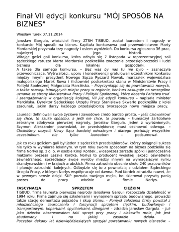 Finał VII edycji konkursu "MÓJ SPOSÓB NA BIZNES" Wiesław Turek 07.11.2014 Jarosław Gargula, właściciel firmy ZTSH TISBUD, został laureatem I nagrody w konkursie Mój sposób na biznes. Kapituła konkursowa pod przewodnictwem Marty Mordarskiej przyznała trzy nagrody i osiem wyróżnień. Do konkursu zgłoszono 36 prac, najwięcej w jego historii. Witając gości gali konkursu, która odbyła się 7 listopada w reprezentacyjnej sali sądeckiego ratusza Marta Mordarska podkreśliła znaczenie przedsiębiorczości i ludzi biznesu dla lokalnej gospodarki. A także dla samego konkursu. – Bez was by nas tu nie było – zaznaczyła przewodnicząca. Wytrwałości, uporu i konsekwencji gratulowali uczestnikom konkursu między innymi prezydent Nowego Sącza Ryszard Nowak, marszałek województwa małopolskiego Marek Sowa i (listownie) podsekretarz stanu w Ministerstwie Pracy i Polityki Społecznej Małgorzata Marcińska. – Przyczyniając się do powstawania nowych, a także rozwoju istniejących miejsc pracy w regionie, konkurs zasługuje na szczególne uznanie ze strony Ministerstwa Pracy i Polityki Społecznej, które docenia Państwa trud i zaangażowanie w organizację kolejnej, VII już edycji konkursu – napisała minister Marcińska. Dyrektor Sądeckiego Urzędu Pracy Stanisława Skwarło podkreśliła z kolei szacunek, jakim darzy każdego przedsiębiorcę tworzącego nowe miejsca pracy. Laureaci definiowali swoje życiowe i zawodowe credo bardzo prosto. – Jeśli człowiekowi się chce, to szuka sposobu, a jeśli nie chce, to powodu – tłumaczył żartobliwie zebranym zdobywca pierwszej nagrody, Jarosław Gargula. Jeden z wyróżnionych, Szymon Aleksander powiedział, że przedsiębiorcę musi cechować odwaga. – Chcieliśmy uczynić Nowy Sącz bardziej odważnym i dlatego gratuluję wszystkim uczestnikom, nie tylko laureatom – podsumował. Jak co roku gościem gali był jeden z sądeckich przedsiębiorców, którzy osiągnęli sukces nie tylko w wymiarze lokalnym. W tym roku swoim sposobem na biznes podzieliła się firma Norlys sp. z o. o. w osobie Kingi Kordek , wiceprezes zarządu spółki i jednocześnie małżonki prezesa Leszka Kordka. Norlys to producent wysokiej jakości oświetlenia zewnętrznego, sprzedający swoje wyroby między innymi na wymagającym rynku skandynawskim i w krajach arabskich. Firma zatrudnia obecnie około 240 pracowników i planuje zatrudnić kolejnych. Odbędzie się to z pewnością z udziałem Sądeckiego Urzędu Pracy, z którym Norlys współpracuje od dawna. Pani Kordek zdradziła nawet, że w pewnym sensie dzięki SUP poznała swojego męża, bo skierował przyszłą panią prezes do pracy właśnie w firmie Norlys. FASCYNACJA SPRZĘTEM CIĘŻKIM TISBUD, firma laureata pierwszej nagrody Jarosława Garguli rozpoczęła działalność w 1994 roku. Firma zajmuje się szkoleniami i wynajmem sprzętu budowlanego, prowadzi także stację demontażu pojazdów i skup złomu. - Pomysł założenia firmy powstał z młodzieńczego zauroczenia i fascynacji sprzętem ciężkim, budowlanym i transportowym: koparkami, spycharkami, dźwigami – zdradza Jarosław Gargula. – Już jako dziecko obserwowałem taki sprzęt przy pracy i ciekawiło mnie, jak jest zbudowany i na jakiej zasadzie działa. Początek dekady lat dziewięćdziesiątych sprzyjał powstawaniu nowych biznesów. – Lech Wałęsa mówił wtedy o powszechnej prywatyzacji i to było moje natchnienie – uśmiecha się Jarosław Gargula. Zaczynał praktycznie od zera. Na początku jego firma miała na stanie zaledwie dwie jednostki, podnośnik i koparko-ładowarkę. Teraz TISBUD oferuje wynajem około 50 jednostek sprzętu wiodących producentów. Zajmuje się także kasacją pojazdów oraz skupem złomu stalowego i metali kolorowych. Rozszerzenie oferty firmy zostało wymuszone potrzebami rynku. W latach 2010 – 2012 z powodu dużych inwestycji związanych z organizacją EURO 2012 zaczęło brakować operatorów sprzętu ciężkiego. – Zrodził się pomysł, żeby szkolić operatorów na miejscu w naszej firmie. Po wielu trudnościach związanych z uzyskaniem akredytacji, licencji i innych pozwoleń w roku 2012 otworzyliśmy ośrodek szkolenia zawodowego dla operatorów sprzętu ciężkiego i spawaczy – wspomina Jarosław Gargula. – Do każdego kursanta podchodzimy w sposób indywidualny. Każdemu już w dniu zapisu tworzymy indywidualny harmonogram zajęć dostosowany do jego potrzeb i możliwości – zapewnia. W bieżącym roku firma zamierza przeszkolić w Ośrodku Szkoleń ponad 1000 osób. Warto wspomnieć, że firma prowadzi kursy dla osób z umiarkowanym stopniem niepełnosprawności. - Moja firma to moja pasja. Ciągle wyznaczam sobie nowe cele i je realizuję – podsumowuje laureat. GRY ŁĄCZĄ LUDZI Zupełnie odmiennym rodzajem działalności zajmuje się Marek Przepiórka i jego firma GRAAL. Laureat II miejsca w konkursie Mój sposób na biznes jest właścicielem wydawnictwa gier Hobbity.eu i sklepu z grami planszowymi i łamigłówkami Hobbity.pl. Z poprzednikiem łączy go pasja do tego, co robi. – Zakładając firmę, chcieliśmy połączyć nasze wieloletnie hobby z pracą – wspomina Marek Przepiórka. – Zawsze podobało nam się, że gry są rozrywką, która łączy ludzi. Do stołu z planszą może zasiąść dziadek z wnuczkiem, cała rodzina, przyjaciele i znajomi. Ponadto gry są świetną alternatywą dla spędzania wolnego czasu przed telewizorem czy przy komputerze – dodaje. Marek Przepiórka nie chciał prowadzić tylko kolejnego „sklepu z zabawkami", dlatego zdecydował się na rozpoczęcie działalności wydawniczej. Poprzeczkę zawiesił sobie wysoko. – Nie chcieliśmy iść na kompromis. Nasze gry musiały się cechować wysoką jakością wydania i niebanalną mechaniką; nigdy nie chcieliśmy konkurować ceną – przekonuje laureat. Miarą sukcesu wydawnictwa jest współpraca z partnerami zagranicznymi i obecność na targac