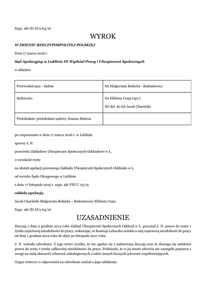 Sygn. akt III AUa 64/16 WYROK W IMIENIU RZECZYPOSPOLITEJ POLSKIEJ Dnia 17 marca 2016 r. Sąd Apelacyjny w Lublinie III Wydział Pracy i Ubezpieczeń Społecznych w składzie: Przewodniczący - Sędzia SA Małgorzata Rokicka - Radoniewicz Sędziowie: SA Elżbieta Czaja (spr.) SO del. do SA Jacek Chaciński Protokolant: protokolant sądowy Joanna Malena po rozpoznaniu w dniu 17 marca 2016 r. w Lublinie sprawy J. N. przeciwko Zakładowi Ubezpieczeń Społecznych Oddziałowi w L. o wysokość renty na skutek apelacji pozwanego Zakładu Ubezpieczeń Społecznych Oddziału w L. od wyroku Sądu Okręgowego w Lublinie z dnia 17 listopada 2015 r. sygn. akt VIII U 23/15 oddala apelację. Jacek Chaciński Małgorzata Rokicka – Radoniewicz Elżbieta Czaja Sygn. akt III AUa 64/16 UZASADNIENIE Decyzją z dnia 2 grudnia 2014 roku Zakład Ubezpieczeń Społecznych Oddział w L. przyznał J. N. prawo do renty z tytułu częściowej niezdolności do pracy, wskazując, że Komisja Lekarska orzekła u niej częściową niezdolność do pracy od dnia 1 grudnia 2014 roku do dnia 30 listopada 2017 roku. J. N. wniosła odwołanie. Z jego treści wynika, że nie zgadza się z zaskarżoną decyzją oraz że domaga się ustalenia prawa do renty z tytułu całkowitej niezdolności do pracy. Podniosła, że w jej stanie zdrowia nie nastąpiła poprawa z uwagi na stałą obecność schorzeń onkologicznych a także innych licznych schorzeń współistniejących. Organ rentowy w odpowiedzi na odwołanie wniósł o jego oddalenie. Wyrokiem z dnia 7 listopada 2015 roku Sąd Okręgowy w Lublinie zmienił zaskarżoną decyzje i ustalił J. N. prawo do renty z tytułu całkowitej niezdolności do pracy od dnia 1 grudnia 2014 roku do 28 lutego 2017 roku. Podstawą wyroku były następujące ustalenia: J. N. urodziła się w dniu (...). Ma wykształcenie zasadnicze zawodowe, z zawodu jest tokarzem, w latach 1978-2012 była zatrudniona na stanowiskach tłoczarza, pomocy lakiernika oraz woźnej oddziałowej w przedszkolu. Decyzją z dnia 11 stycznia 2012 roku Zakład Ubezpieczeń Społecznych przyznał J. N. rentę z tytułu całkowitej niezdolności do pracy od dnia 19 grudnia 2011 roku do dnia 31 grudnia 2012. Następnie decyzją z dnia 4 grudnia 2012 roku okres uprawnienia do powyższego świadczenia przedłużono do dnia 30 listopada 2014 roku, a decyzją z dnia 8 lutego 2013 roku ustalono jej prawo do dodatku pielęgnacyjnego do dnia 30 listopada 2014 roku. Podstawą wydania decyzji z dnia 4 grudnia 2012 roku, po raz ostatni ustalającej prawo do renty z tytułu całkowitej niezdolności do pracy było orzeczenie Lekarza Orzecznika z dnia 19 listopada 2012 roku stwierdzające całkowitą niezdolność do pracy wynikającą z: chłoniaka H., nowotworu mieloproliferacyjnego z nadpłytkowością, zmian zwyrodnieniowych i dyskopatycznych kręgosłupa z zespołem bólowym odcinka C i L-S oraz wieloogniskowego uszkodzenia ośrodkowego układu nerwowego. Orzekając o niezdolności do samodzielnej egzystencji wnioskodawczyni lekarz orzecznik w dniu 24 stycznia 2013 roku dodatkowo rozpoznał u niej przebytą chemioterapię i radioterapię, wznowę nowotworu i ponowną radioterapię. W dniu 21 października 2014 roku J. N. wniosła o ponowne ustalenie prawa do renty z tytułu niezdolności do pracy. Lekarz Orzecznik rozpoznał u niej: chłoniaka H. w remisji, stan po chemioterapii i radioterapii, wieloogniskowe naczyniowe uszkodzenie centralnego układu nerwowego, zmiany zwyrodnieniowe i dyskopatyczne kręgosłupa szyjnego i L-S oraz przewlekłe zapalenie dróg moczowych. Uznał, że jest ona częściowo niezdolna do pracy do dnia 30 listopada 2017 roku oraz że nie jest całkowicie niezdolna do pracy i nie jest niezdolna do samodzielnej egzystencji. Komisja Lekarska Zakładu Ubezpieczeń Społecznych, podtrzymała to orzeczenie. Biegli sądowi lekarze specjaliści: urolog, hematolog, neurolog oraz onkolog w łącznej opinii z dnia 9 lutego 2015 roku rozpoznali u wnioskodawczyni: zespół mieloproliferacyjny, chłoniaka H. w st. IV B pierwotnie oporny na leczenie, stan po radioterapii i chemioterapii, chorobę zwyrodnieniową kręgosłupa z dyskopatią C4-C5-C6-C7 i nawracającym zespołem bólowym bez objawów korzeniowych, nieliczne drobne ogniska w sekwencjach T2 i FLAIR w MRI z dnia 31 stycznia 2014 roku - klinicznie nieme, naczyniopochodny zawrót głowy, napięciowy ból głowy, wysiłkowe nietrzymanie moczu, nawrotowe infekcje dróg moczowych oraz torbiele dolnego bieguna nerki prawej. Uznali ją za nadal całkowicie niezdolną do pracy od dnia 1 grudnia 2014 roku do dnia 28 lutego 2017 roku oraz za zdolną do samodzielnej egzystencji. W uzasadnieniu wskazali, że u wnioskodawczyni występują dwie choroby nowotworowe: zespół mieloproliferacyjny leczony H. od 2010 roku oraz chłoniak H. w st. IV B pierwotnie oporny na leczenie i bez możliwości wykonania autoprzeszczepu i alloprzeszczepu z powodu obecności drugiej choroby nowotworowej. Analizując dotychczasowy i obecny przebieg chorób nowotworowych, biegli sądowi lekarze specjaliści hematolog i onkolog uznali, że u wnioskodawczyni przeciwwskazana jest jakakolwiek praca fizyczna. Wnioskodawczyni powinna prowadzić oszczędny tryb życia i w szczególności unikać narażenia na przeciążenia fizyczne oraz przeciążenia sfery psychicznej. Analizując dotychczasowy staż pracy oraz kwalifikacje zawodowe zgodnie uznali, że skarżąca jest nadal całkowicie niezdolna do pracy, pozostaje jest jednak zdolna do samodzielnej egzystencji. Biegły sądowy lekarz specjalista neurolog wskazał, ze wnioskodawczyni na przełomie stycznia i lutego 2014 roku była hospitalizowana neurologicznie. Do neurologa zgłasza się z powodu zawrotów i bólów głowy oraz dolegliwości bólowych szyi i karku. Przyjmuje systematycznie leki naczynioaktywne. Przeprowadzone obecnie badanie neurologiczne, nie ujawniło obecności u cech czynnego drażnienia korzeni nerwowych oraz istotnego up