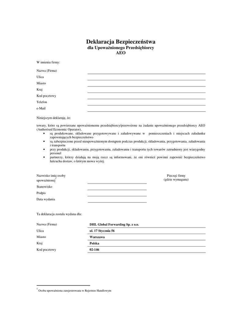 Deklaracja Bezpieczeństwa dla Upoważnionego Przedsiębiorcy AEO W imieniu firmy: Nazwa (Firma) Ulica Miasto Kraj Kod pocztowy Telefon e-Mail Niniejszym deklaruję, że: towary, które są powierzane upoważnionemu przedsiębiorcy/przewożone na żadanie upoważnionego przedsiębiorcy AEO (Authorised Economic Operator), • są produkowane, składowane przygotowywane i załadowywane w pomieszczeniach i miejscach załadunku zapewniających bezpieczeństwo • są zabezpieczone przed nieupoważnionym dostępem podczas produkcji, składowania, przygotowania, załadowania i transportu • przy produkcji, składowaniu, przygotowaniu, załadowaniu i transportu tych towarów zatrudniony jest wiarygodny personel • partnerzy, którzy działają na moją rzecz są informowani, że oni również powinni zapewnić bezpieczeństwo łańcucha dostaw, o którym mowa wyżej. Nazwisko imię osoby 1 upoważnionej Pieczęć firmy (gdzie wymagana) Stanowisko Podpis Data wydania Ta deklaracja została wydana dla: Nazwa (Firma) DHL Global Forwarding Sp. z o.o. Ulica ul. 17 Stycznia 56 Miasto Warszawa Kraj Polska Kod pocztowy 02-146 1 Osoba upoważniona zarejestrowana w Rejestrze Handlowym