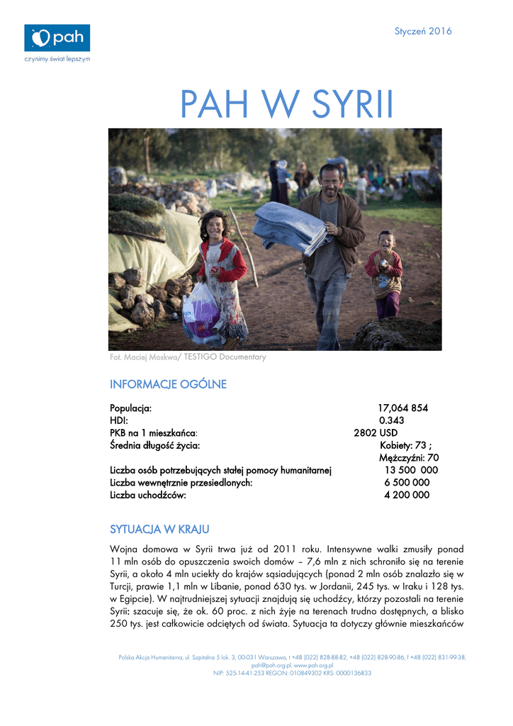 Styczeń 2016 PAH W SYRII Fot. Maciej Moskwa/ TESTIGO Documentary INFORMACJE OGÓLNE Populacja: HDI: PKB na 1 mieszkańca: Średnia długość życia: Liczba osób potrzebujących stałej pomocy humanitarnej Liczba wewnętrznie przesiedlonych: Liczba uchodźców: 17,064 854 0.343 2802 USD Kobiety: 73 ; Mężczyźni: 70 13 500 000 6 500 000 4 200 000 SYTUACJA W KRAJU Wojna domowa w Syrii trwa już od 2011 roku. Intensywne walki zmusiły ponad 11 mln osób do opuszczenia swoich domów – 7,6 mln z nich schroniło się na terenie Syrii, a około 4 mln uciekły do krajów sąsiadujących (ponad 2 mln osób znalazło się w Turcji, prawie 1,1 mln w Libanie, ponad 630 tys. w Jordanii, 245 tys. w Iraku i 128 tys. w Egipcie). W najtrudniejszej sytuacji znajdują się uchodźcy, którzy pozostali na terenie Syrii: szacuje się, że ok. 60 proc. z nich żyje na terenach trudno dostępnych, a blisko 250 tys. jest całkowicie odciętych od świata. Sytuacja ta dotyczy głównie mieszkańców Polska Akcja Humanitarna, ul. Szpitalna 5 lok. 3, 00-031 Warszawa, t +48 (022) 828-88-82, +48 (022) 828-90-86, f +48 (022) 831-99-38, [email protected], www.pah.org.pl NIP: 525-14-41-253 REGON: 010849302 KRS: 0000136833 miasta Yarmouk i Homs. Według szacunków ONZ, co najmniej połowa uchodźców wewnętrznych w Syrii to dzieci. POMOC HUMANITARNA UDZIELANA PRZEZ PAH Polska Akcja Humanitarna realizuje projekty kierowane do mieszkańców syryjskich prowincji Idlib i Hama, docierając z pomocą do 640 tysięcy ludzi. Niosąc wsparcie w regionie, PAH zatrudnia do pracy Syryjczyków. Obecnie realizujemy projekty: wodno-sanitarne (dostarczamy wodę, odbudowujemy stacje pompujące, wodociągi oraz toalety w szkołach), żywnościowe (dostarczamy żywność oraz współpracujemy z miejscowymi piekarniami), nieżywnościowe (dystrybucja koców, materaców i namiotów) oraz medyczne (dystrybucja leków). PROGRAM WODNO-SANITARNY PAH dostarcza wodę, odbudowuje stacje pompujące, buduje zbiorniki, ujęcia wodne oraz sanitariaty. Dostęp do wody pitnej jest niezbędnym warunkiem dla rozwoju społeczeństwa i walki z ubóstwem – bez zaspokojenia tej potrzeby rozwój edukacji i opieki zdrowotnej nie jest możliwy. W październiku i listopadzie 2015 roku przywróciliśmy działanie 2 wysypisk śmieci, rozdystrybuowaliśmy 2678 pakietów higienicznych z których skorzystało około 13 000 osób oraz przeprowadziliśmy 116 sesji z promocji higieny dla 3196 kobiet oraz dzieci w wieku szkolnym. Obecnie w prowincji Idlib (północno-zachodnia Syria) poprawimy również dostęp do higieny i warunków sanitarnych dla prawie 10 000 osób (mieszkańców obszarów wiejskich, w tym uczniów oraz osób wewnętrznie przesiedlonych) poprzez naprawę sanitariatów, toalet. PROGRAM ŻYWNOŚCIOWY W związku z trwającym konfliktem produkcja żywności wewnątrz Syrii jest bardzo niewielka i ograniczona (zniszczone systemy nawadniające, magazyny i uprawy). Dodatkowo w 2014 roku Syrię dotknęła susza, w związku z czym Światowy Program Żywnościowy ONZ alarmuje, iż kraj zagrożony jest kryzysem żywnościowym. W samej Syrii dostarczanie pomocy dla uchodźców jest utrudnione, a czasem nawet niemożliwe z powodu starć, ostrzałów czy zagrożenia porwaniem. Od początku 2014 roku PAH prowadzi w Syrii projekty związane z dostępem do żywności: dystrybuuje pakiety żywnościowe i współpracuje z lokalnymi piekarniami. Polska Akcja Humanitarna, ul. Szpitalna 5 lok. 3, 00-031 Warszawa, t +48 (022) 828-88-82, +48 (022) 828-90-86, f +48 (022) 831-99-38, [email protected], www.pah.org.pl NIP: 525-14-41-253 REGON: 010849302 KRS: 0000136833 Pakiety żywnościowe: PAH dystrybuuje pakiety z żywnością, każdy pakiet zawiera ok. 80 kg produktów i wystarcza na miesiąc. W jego skład wchodzą m.in: zapas oleju, ryżu, soczewicy, soli, cukru, herbaty, kawy, mąki, konserw. Co miesiąc dystrybuujemy od 9000 do 12 000 koszy żywnościowych, które trafiają do 5000-7000 najbardziej potrzebujących rodzin. W listopadzie pomogliśmy w ten sposób 41608 osobom. Wspieramy piekarnie w prowincjach Idlib i Hama poprzez dostawę mąki. Dzięki temu piekarnie wypiekają chleb i sprzedają po ustalonej cenie 80 syryjskich funtów (ok. 1 zł) za 1 paczkę chleba (około 1,5 kg). Od marca 2015 roku współpracujemy z 11 piekarniami - każda z nich otrzymuje miesięcznie 50 ton mąki i drożdże. OPIEKA MEDYCZNA Z powodu intensywnych walk oraz strat ludzkich i zniszczeń materialnych dostęp do opieki medycznej jest bardzo ograniczony i kosztowny. Wstrzymanie produkcji leków i brak ich dostaw zwiększyły śmiertelność nawet z powodu chorób, które w normalnych warunkach można byłoby uleczyć. Szczególnie dramatyczna jest sytuacja matek karmiących, które z powodu stresu i niedożywienia nie są w stanie karmić niemowląt. Od listopada 2013 w partnerstwie z Fundacją Golden Tulip, a następnie we współpracy z Caritas Czech Republic prowadziliśmy projekt tzw. mobilnej kliniki zapewniającej pomoc medyczną mieszkańcom prowincji Idlib i Hama. Klinika obsługiwała dorosłych i dzieci, ze szczególnym uwzględnieniem kobiet i niemowląt. Zakupiliśmy w Turcji odpowiedni samochód razem z wymaganymi lekami i środkami medycznymi oraz zatrudniliśmy wykwalifikowany personel medyczny. Wszyscy pacjenci objęci pomocą kliniki mobilnej otrzymywali również za darmo lekarstwa. Klinika obsługiwała średnio 300 osób tygodniowo. W lipcu 2015 PAH rozpoczął projekt polegający na dostarczaniu leków do dwóch punktów medycznych na terenie Syrii przez okres 5 miesięcy. Pod koniec 2015 r. rozdystrybowaliśmy lekarstwa dla około 16 000 osób. PRZYKŁADOWE KOSZTY Program wodno-sanitarny: Koszt dostarczenia wody dla rodziny przez jeden dzień w przypadku dostarczania wody cysternami to 1 zł. Za 7 zł można zapewnić pięcioosobowej rodzinie wodę na cały tydzień, a na cały miesiąc – za 31 zł. Koszt dostarczenia wody dla rodziny przez jeden dzień