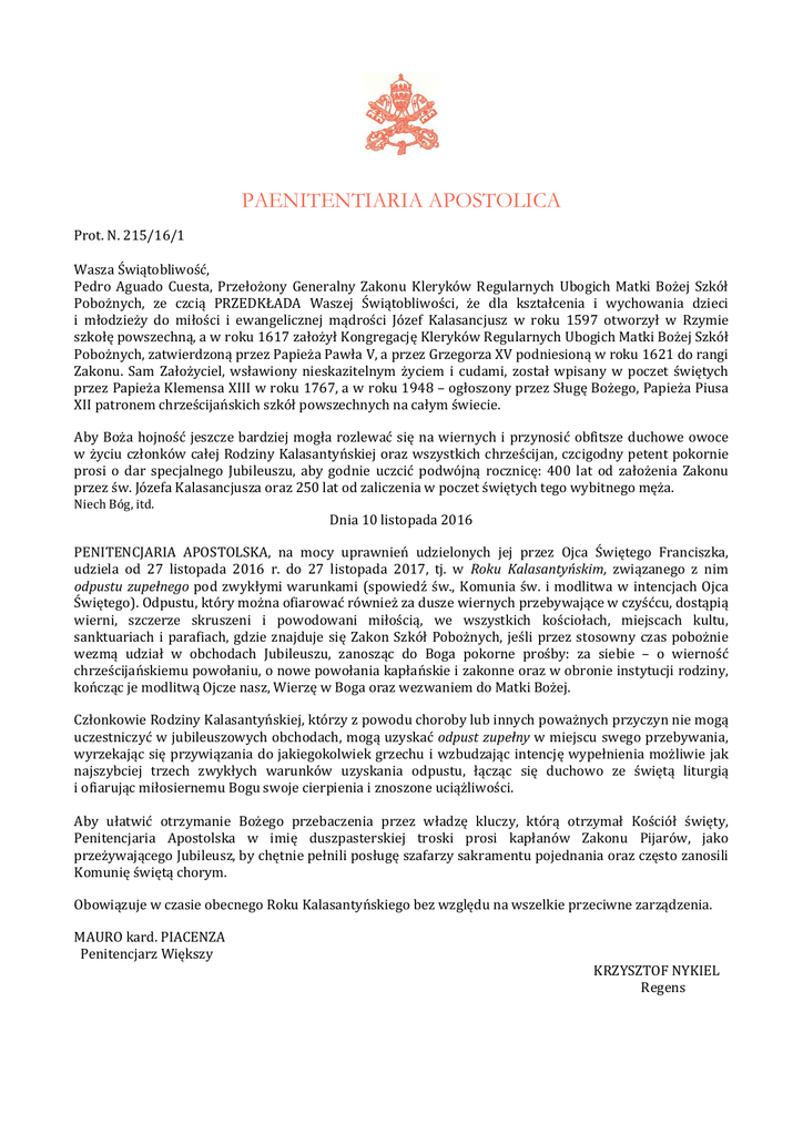 PAENITENTIARIA APOSTOLICA Prot. N. 215/16/1 Wasza Świątobliwość, Pedro Aguado Cuesta, Przełożony Generalny Zakonu Kleryków Regularnych Ubogich Matki Bożej Szkół Pobożnych, ze czcią PRZEDKŁADA Waszej Świątobliwości, że dla kształcenia i wychowania dzieci i młodzieży do miłości i ewangelicznej mądrości Józef Kalasancjusz w roku 1597 otworzył w Rzymie szkołę powszechną, a w roku 1617 założył Kongregację Kleryków Regularnych Ubogich Matki Bożej Szkół Pobożnych, zatwierdzoną przez Papieża Pawła V, a przez Grzegorza XV podniesioną w roku 1621 do rangi Zakonu. Sam Założyciel, wsławiony nieskazitelnym życiem i cudami, został wpisany w poczet świętych przez Papieża Klemensa XIII w roku 1767, a w roku 1948 – ogłoszony przez Sługę Bożego, Papieża Piusa XII patronem chrześcijańskich szkół powszechnych na całym świecie. Aby Boża hojność jeszcze bardziej mogła rozlewać się na wiernych i przynosić obfitsze duchowe owoce w życiu członków całej Rodziny Kalasantyńskiej oraz wszystkich chrześcijan, czcigodny petent pokornie prosi o dar specjalnego Jubileuszu, aby godnie uczcić podwójną rocznicę: 400 lat od założenia Zakonu przez św. Józefa Kalasancjusza oraz 250 lat od zaliczenia w poczet świętych tego wybitnego męża. Niech Bóg, itd. Dnia 10 listopada 2016 PENITENCJARIA APOSTOLSKA, na mocy uprawnień udzielonych jej przez Ojca Świętego Franciszka, udziela od 27 listopada 2016 r. do 27 listopada 2017, tj. w Roku Kalasantyńskim, związanego z nim odpustu zupełnego pod zwykłymi warunkami (spowiedź św., Komunia św. i modlitwa w intencjach Ojca Świętego). Odpustu, który można ofiarować również za dusze wiernych przebywające w czyśćcu, dostąpią wierni, szczerze skruszeni i powodowani miłością, we wszystkich kościołach, miejscach kultu, sanktuariach i parafiach, gdzie znajduje się Zakon Szkół Pobożnych, jeśli przez stosowny czas pobożnie wezmą udział w obchodach Jubileuszu, zanosząc do Boga pokorne prośby: za siebie – o wierność chrześcijańskiemu powołaniu, o nowe powołania kapłańskie i zakonne oraz w obronie instytucji rodziny, kończąc je modlitwą Ojcze nasz, Wierzę w Boga oraz wezwaniem do Matki Bożej. Członkowie Rodziny Kalasantyńskiej, którzy z powodu choroby lub innych poważnych przyczyn nie mogą uczestniczyć w jubileuszowych obchodach, mogą uzyskać odpust zupełny w miejscu swego przebywania, wyrzekając się przywiązania do jakiegokolwiek grzechu i wzbudzając intencję wypełnienia możliwie jak najszybciej trzech zwykłych warunków uzyskania odpustu, łącząc się duchowo ze świętą liturgią i ofiarując miłosiernemu Bogu swoje cierpienia i znoszone uciążliwości. Aby ułatwić otrzymanie Bożego przebaczenia przez władzę kluczy, którą otrzymał Kościół święty, Penitencjaria Apostolska w imię duszpasterskiej troski prosi kapłanów Zakonu Pijarów, jako przeżywającego Jubileusz, by chętnie pełnili posługę szafarzy sakramentu pojednania oraz często zanosili Komunię świętą chorym. Obowiązuje w czasie obecnego Roku Kalasantyńskiego bez względu na wszelkie przeciwne zarządzenia. MAURO kard. PIACENZA Penitencjarz Większy KRZYSZTOF NYKIEL Regens