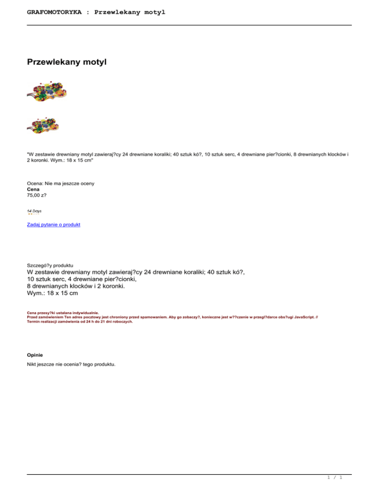 GRAFOMOTORYKA : Przewlekany motyl Przewlekany motyl "W zestawie drewniany motyl zawieraj?cy 24 drewniane koraliki; 40 sztuk kó?, 10 sztuk serc, 4 drewniane pier?cionki, 8 drewnianych klocków i 2 koronki. Wym.: 18 x 15 cm" Ocena: Nie ma jeszcze oceny Cena 75,00 z? Zadaj pytanie o produkt Szczegó?y produktu W zestawie drewniany motyl zawieraj?cy 24 drewniane koraliki; 40 sztuk kó?, 10 sztuk serc, 4 drewniane pier?cionki, 8 drewnianych klocków i 2 koronki. Wym.: 18 x 15 cm Cena przesy?ki ustalana indywidualnie. Przed zamówieniem Ten adres pocztowy jest chroniony przed spamowaniem. Aby go zobaczy?, konieczne jest w??czenie w przegl?darce obs?ugi JavaScript. // Termin realizacji zamówienia od 24 h do 21 dni roboczych. Opinie Nikt jeszcze nie ocenia? tego produktu. 1 / 1 Powered by TCPDF (www.tcpdf.org)