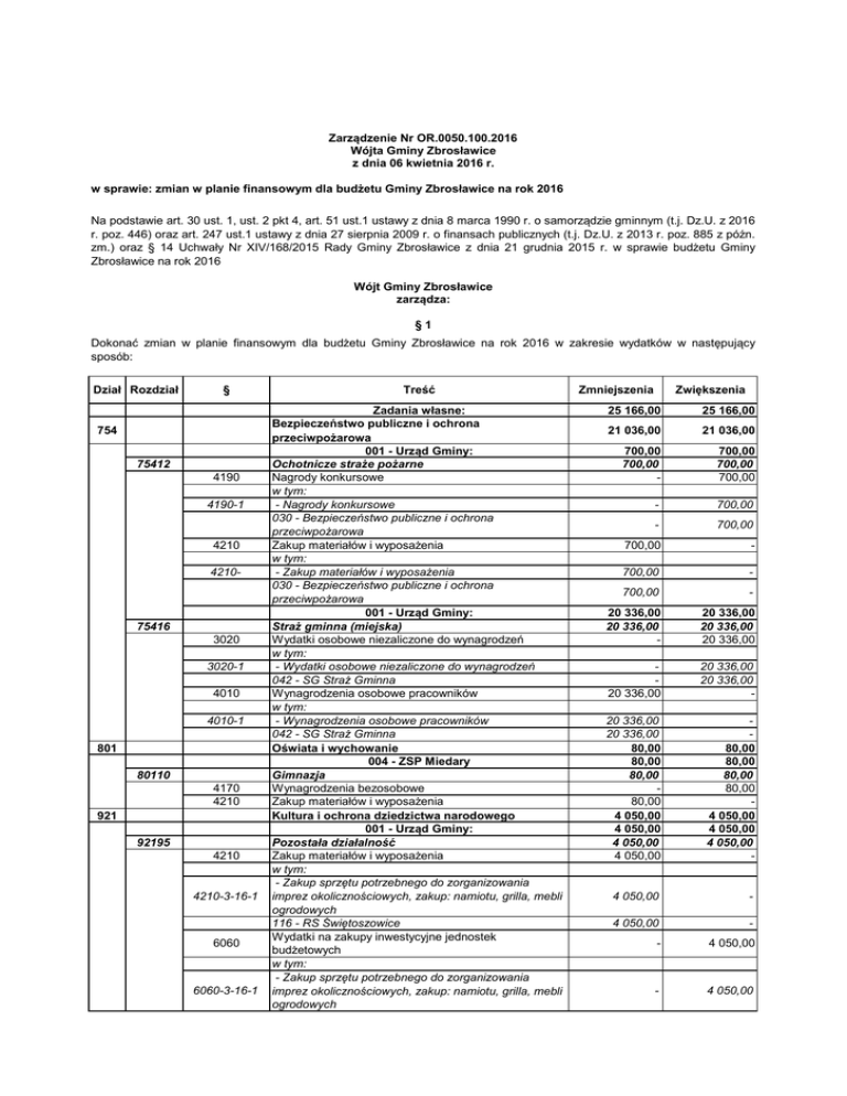 Zarządzenie Nr OR.0050.100.2016 Wójta Gminy Zbrosławice z dnia 06 kwietnia 2016 r. w sprawie: zmian w planie finansowym dla budżetu Gminy Zbrosławice na rok 2016 Na podstawie art. 30 ust. 1, ust. 2 pkt 4, art. 51 ust.1 ustawy z dnia 8 marca 1990 r. o samorządzie gminnym (t.j. Dz.U. z 2016 r. poz. 446) oraz art. 247 ust.1 ustawy z dnia 27 sierpnia 2009 r. o finansach publicznych (t.j. Dz.U. z 2013 r. poz. 885 z późn. zm.) oraz § 14 Uchwały Nr XIV/168/2015 Rady Gminy Zbrosławice z dnia 21 grudnia 2015 r. w sprawie budżetu Gminy Zbrosławice na rok 2016 Wójt Gminy Zbrosławice zarządza: §1 Dokonać zmian w planie finansowym dla budżetu Gminy Zbrosławice na rok 2016 w zakresie wydatków w następujący sposób: Dział Rozdział § 754 75412 4190 4190-1 4210 4210- 75416 3020 3020-1 4010 4010-1 801 80110 4170 4210 921 92195 4210 4210-3-16-1 6060 6060-3-16-1 Treść Zadania własne: Bezpieczeństwo publiczne i ochrona przeciwpożarowa 001 - Urząd Gminy: Ochotnicze straże pożarne Nagrody konkursowe w tym: - Nagrody konkursowe 030 - Bezpieczeństwo publiczne i ochrona przeciwpożarowa Zakup materiałów i wyposażenia w tym: - Zakup materiałów i wyposażenia 030 - Bezpieczeństwo publiczne i ochrona przeciwpożarowa 001 - Urząd Gminy: Straż gminna (miejska) Wydatki osobowe niezaliczone do wynagrodzeń w tym: - Wydatki osobowe niezaliczone do wynagrodzeń 042 - SG Straż Gminna Wynagrodzenia osobowe pracowników w tym: - Wynagrodzenia osobowe pracowników 042 - SG Straż Gminna Oświata i wychowanie 004 - ZSP Miedary Gimnazja Wynagrodzenia bezosobowe Zakup materiałów i wyposażenia Kultura i ochrona dziedzictwa narodowego 001 - Urząd Gminy: Pozostała działalność Zakup materiałów i wyposażenia w tym: - Zakup sprzętu potrzebnego do zorganizowania imprez okolicznościowych, zakup: namiotu, grilla, mebli ogrodowych 116 - RS Świętoszowice Wydatki na zakupy inwestycyjne jednostek budżetowych w tym: - Zakup sprzętu potrzebnego do zorganizowania imprez okolicznościowych, zakup: namiotu, grilla, mebli ogrodowych Zmniejszenia Zwiększenia 25 166,00 25 166,00 21 036,00 21 036,00 700,00 700,00 - 700,00 700,00 700,00 - 700,00 - 700,00 700,00 - 700,00 - 700,00 - 20 336,00 20 336,00 - 20 336,00 20 336,00 20 336,00 20 336,00 20 336,00 20 336,00 - 20 336,00 20 336,00 80,00 80,00 80,00 80,00 4 050,00 4 050,00 4 050,00 4 050,00 80,00 80,00 80,00 80,00 4 050,00 4 050,00 4 050,00 - 4 050,00 - 4 050,00 - - 4 050,00 - 4 050,00 116 - RS Świętoszowice RAZEM: §2 Wykonanie zarządzenia powierzyć Skarbnikowi Gminy. §3 Zarządzenie wchodzi w życie z dniem podpisania. 25 166,00 4 050,00 25 166,00