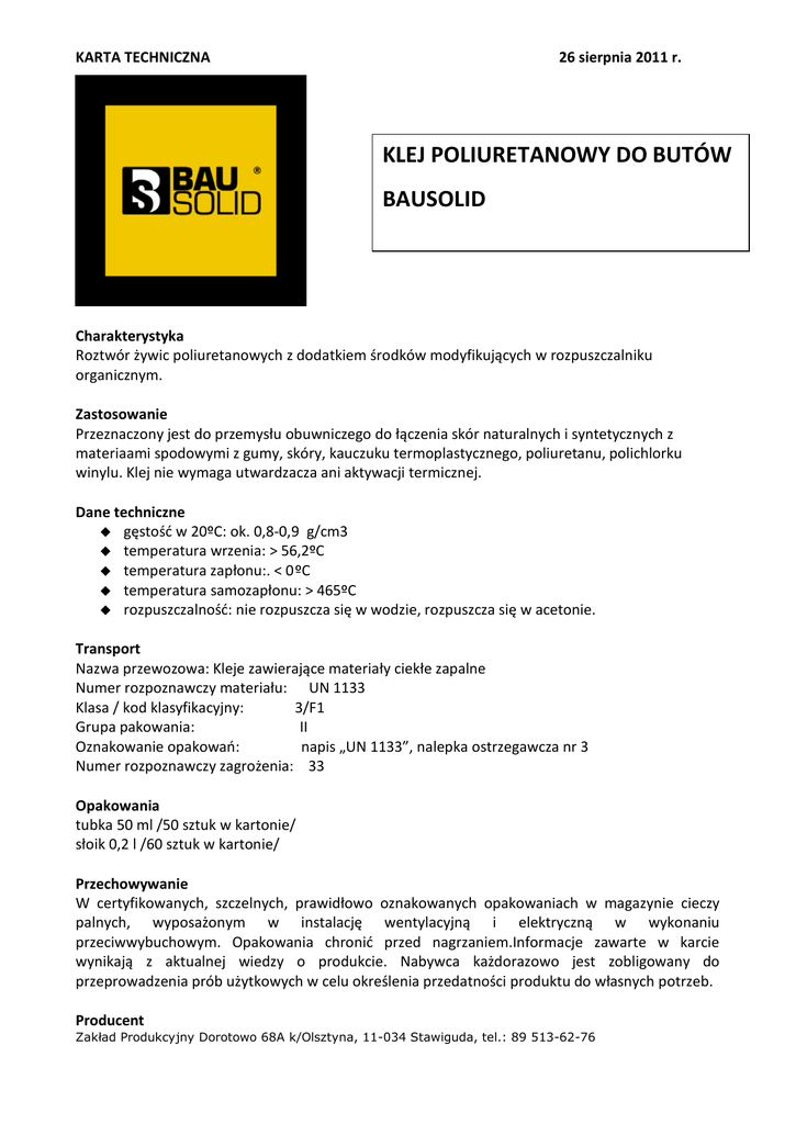 KARTA TECHNICZNA 26 sierpnia 2011 r. KLEJ POLIURETANOWY DO BUTÓW BAUSOLID Charakterystyka Roztwór żywic poliuretanowych z dodatkiem środków modyfikujących w rozpuszczalniku organicznym. Zastosowanie Przeznaczony jest do przemysłu obuwniczego do łączenia skór naturalnych i syntetycznych z materiaami spodowymi z gumy, skóry, kauczuku termoplastycznego, poliuretanu, polichlorku winylu. Klej nie wymaga utwardzacza ani aktywacji termicznej. Dane techniczne gęstość w 20ºC: ok. 0,8-0,9 g/cm3 temperatura wrzenia: > 56,2ºC temperatura zapłonu:. < 0ºC temperatura samozapłonu: > 465ºC rozpuszczalność: nie rozpuszcza się w wodzie, rozpuszcza się w acetonie. Transport Nazwa przewozowa: Kleje zawierające materiały ciekłe zapalne Numer rozpoznawczy materiału: UN 1133 Klasa / kod klasyfikacyjny: 3/F1 Grupa pakowania: II Oznakowanie opakowań: napis „UN 1133”, nalepka ostrzegawcza nr 3 Numer rozpoznawczy zagrożenia: 33 Opakowania tubka 50 ml /50 sztuk w kartonie/ słoik 0,2 l /60 sztuk w kartonie/ Przechowywanie W certyfikowanych, szczelnych, prawidłowo oznakowanych opakowaniach w magazynie cieczy palnych, wyposażonym w instalację wentylacyjną i elektryczną w wykonaniu przeciwwybuchowym. Opakowania chronić przed nagrzaniem.Informacje zawarte w karcie wynikają z aktualnej wiedzy o produkcie. Nabywca każdorazowo jest zobligowany do przeprowadzenia prób użytkowych w celu określenia przedatności produktu do własnych potrzeb. Producent Zakład Produkcyjny Dorotowo 68A k/Olsztyna, 11-034 Stawiguda, tel.: 89 513-62-76