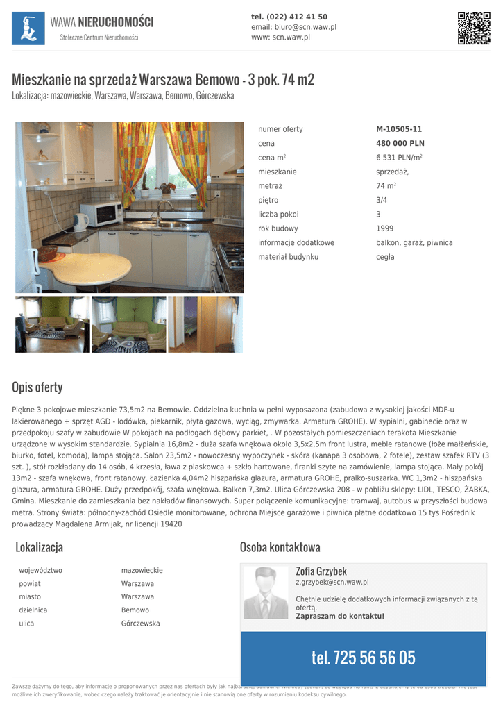 tel. (022) 412 41 50 email: [email protected] www: scn.waw.pl Mieszkanie na sprzedaż Warszawa Bemowo - 3 pok. 74 m2 Lokalizacja: mazowieckie, Warszawa, Warszawa, Bemowo, Górczewska numer oferty M-10505-11 cena 480 000 PLN cena m 6 531 PLN/m2 mieszkanie sprzedaż, metraż 74 m2 piętro 3/4 liczba pokoi 3 rok budowy 1999 informacje dodatkowe balkon, garaż, piwnica materiał budynku cegła 2 Opis oferty Piękne 3 pokojowe mieszkanie 73,5m2 na Bemowie. Oddzielna kuchnia w pełni wyposazona (zabudowa z wysokiej jakości MDF-u lakierowanego + sprzęt AGD - lodówka, piekarnik, płyta gazowa, wyciąg, zmywarka. Armatura GROHE). W sypialni, gabinecie oraz w przedpokoju szafy w zabudowie W pokojach na podłogach dębowy parkiet, . W pozostałych pomieszczeniach terakota Mieszkanie urządzone w wysokim standardzie. Sypialnia 16,8m2 - duża szafa wnękowa około 3,5x2,5m front lustra, meble ratanowe (łoże małżeńskie, biurko, fotel, komoda), lampa stojąca. Salon 23,5m2 - nowoczesny wypoczynek - skóra (kanapa 3 osobowa, 2 fotele), zestaw szafek RTV (3 szt. ), stół rozkładany do 14 osób, 4 krzesła, ława z piaskowca + szkło hartowane, firanki szyte na zamówienie, lampa stojąca. Mały pokój 13m2 - szafa wnękowa, front ratanowy. Łazienka 4,04m2 hiszpańska glazura, armatura GROHE, pralko-suszarka. WC 1,3m2 - hiszpańska glazura, armatura GROHE. Duży przedpokój, szafa wnękowa. Balkon 7,3m2. Ulica Górczewska 208 - w pobliżu sklepy: LIDL, TESCO, ŻABKA, Gmina. Mieszkanie do zamieszkania bez nakładów finansowych. Super połączenie komunikacyjne: tramwaj, autobus w przyszłości budowa metra. Strony świata: północny-zachód Osiedle monitorowane, ochrona Miejsce garażowe i piwnica płatne dodatkowo 15 tys Pośrednik prowadzący Magdalena Armijak, nr licencji 19420 Lokalizacja Osoba kontaktowa Zofia Grzybek województwo mazowieckie powiat Warszawa [email protected] miasto Warszawa dzielnica Bemowo ulica Górczewska Chętnie udzielę dodatkowych informacji związanych z tą ofertą. Zapraszam do kontaktu! tel. 725 56 56 05 Zawsze dążymy do tego, aby informacje o proponowanych przez nas ofertach były jak najbardziej dokładne. Niekiedy jednak, ze względu na fakt, iż uzyskujemy je od osób trzecich nie jest możliwe ich zweryfikowanie, wobec czego należy traktować je orientacyjnie i nie stanowią one oferty w rozumieniu kodeksu cywilnego.