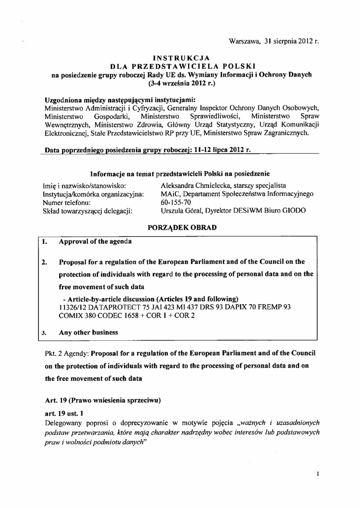 Warszawa. 31 sierpnia 2012 r. INSTRUKCJA DLA PRZEDSTAWICIELA POLSKI na posiedzenie grupy roboczej Rady UE ds. Wymiany Informacji i Ochrony Danych (3-4 września 2012 r.) Uzgodniona międn następującymi instytucjami: Ministej-stwo Administracji i (yfryzacji. Generalny Inspektor Ochrony Danych Osobowych. Spraw Ministerstwo Sprawiedliwości. Ministerstwo Gospodarki. Ministerstwo Weunętrznych. Ministerst\\o Zdrowia. Gtówn\ Uząd Stahstyczny. Lrząd Komunikacji Elektronicznej. Stałe Przcdstawiciekt\%o RP pizy UE. Ministerstwo Spraw lagranicznych. Dala poprzedniego posiedzenia grupy roboczej: 11-12 lipca 2012 r. Informacje na temat przedstawicieli Polski na posiedzenie Aleksandra Chmielecka. starszy specjalista MA1U. Departament Społeczeństwa lntbrmac\jnego 60-155-70 Urszula Góral. Dyrektor DESiWM Biuro WODO Imię I nazwiskoistanowisko: Insmymu ja/komórka organizac\jna: Numer telefonu: Skład tow arz) szącej delegacji: PORZĄDEK OBRAD 1. Approyal of the agenda 2. Proposal fora regulation ofthe European Parliament and ofthe Council on the protection of indiyiduals with regard to the processing of personal data aud on the free moyement of such data Article-by-article discussion (Articies 19 and following) 1 1326fl2 DATAPROTECT 75 JAI 423 Ml 437 DRS 93 DAPJX 70 EREMP 93 COMIX 380 CODEC 1658 + (OR I + COR 2 - 3. Any other business Pkt. 2 Agendy: Proposal fora regulation ofthe European Parliament and of the Council on the protection of indiyiduals with regard to the processing of personal data and on the free moyement of such data Art. 19 (Prawo wniesienia sprzeciwu) art. 19 ust. I Delegowany poprosi o doprecyzowanie w niotxw ie pojęcia .3%cónch I zc(zsu(hzw/nrIz pochrmu pr:uniucwzia. które uwiją cIwzrktcr mulr:ecbn wobec nitciesow lub podstuum mich P/LILI / iiohiosci poJtiioni da;nc/P Delegowany poprosi o dodanie w art. 19 informacji, że podmiot danych ma pra%\o wniesienia sprzeciwu wobec przetwarzania danych osobowych nieodpłatnie. Taka informacja jest zawarta w ust. 2. brakuje jej natomiast w ust.l. Art. 19 ust. 2 Delegowany poprosi o zdefiniowanie w motywie pojęcia ..markering bezpośredni” (czy należy to rozumieć jako wyłącznie marketing bezpośredni dla celów komercyjnych czy też chodzi o marketing bezpośredni dotyczący jakiegokolwiek aspektu (politycznego. społecznego. czy dotyczącego kultu religijnego etc.)? W odniesieniu do uwai Przewodnicząceo rupy ds. Statystyki (propozycja włączenia nowego paragrafu dotyczącego wyłączeń z realizacji praw podmiotu danych określonych w niniejszym artykule. w momencie gdy dane przetwarzane są wyłącznie do celów historycznych. statystycznych lub naukowych i przy spełnieniu warunków art.83). delegowany nie poprze tej propozycji. jako że w opinii PL podstawa przetwarzania danych osobowych do celów m.in. statystyki publicznej opiera się na przepisach prawa (art.6 ust. 2) i co do zasady nie przysługuje od nich sprzeciw. W opinii Pl. nie ma zatem potrzeby dublowania tego zapisu. O ile jednak wyłączenia wT celu statystyki publicznej mąją uzasadnienie, delegowany wyrazi wątpliwość, czy prawo do sprzeci\\u powinno być wyłączone również w przypadku przetwarzania danych osobowych do innych celów statystycznych (z zaznaczeniem wyłączenia statystyki publicznej) a także celów naukowych i historycznych. Art. 20 (Środki oparte na profilowaniu) Art. 20 ust. I PL wyrazi obawę. że definicja środków opartych na profitowaniu jest zbyt zawężąjąca (odnosi się jedynie do środków wywołujących skutki prawne lub mąjących istotny wpływ). Delegowany zaznaczy. że pojęcie „.istotny wpływ” jest pojęciem nieostrym i może prowadzić do nadużyć ze strony podmiotów stosujących środki profilowania. Wydąje się. że w kontekście coraz powszechniej stosowanych praktyk profilowania. w odniesieniu np. do reklamy hehawioralnej. definicja profilowania powinna być szersza. Uzasadni cnie: Definicja środków opartych na profilowaniu zgodnie z którą są to środki. które m.in. wywołują skutki prawne dotyczące tej osoby fizycznej budzi wątplixości. lakie ujęcie sugeruje niebezpieczne zawężenie stosowania regulacji dotyczących profilowania przyznąjących osobom fizycznym. co do zasady. prawo niepodlegania środkom na nim opartych do sytuacji. gdy wpływ środków na nim opartych. jest wy\\ierany w sferze praw i obowiązków osób. Projektodawca unijny zostawia co prawda pewien margines. w ramach którego za środki oparte na profilowaniu mogą zostać uznane środki inne niż wywołujące skutki prawne. wskazując w dalszej kolejności, iż są nimi także środki mąjące istotny wpływ. Jednakże wysoce wątpliwe jest. czy przy tak nieostro sformułowanym kryterium sugerującym szerokie możliwości zróżnicowanej wykładni zakresem regulacji zostaną objęte znaczące przypadki stosowania mechanizmu profilowania, istotne w potocznym — — — — 2 rozumieniu (jak np. dobieranie konkretnych przekazów reklamowych). Powyższe skłania do postawienia pytania, czy nacisk na skutki prawne wywołane protlowaniem stanowić powinien istotę regLilacji mąjącej odpowiednio identytkować to zjawisko i stwarzać odpowiednie gwarancje ochrony przed jego swobodnym rozprzestrzenianiem się. Art. 21 (Ograniczenia) PL poprosi o w\jaśnienic. jak do celu hamionizacji przepisów z zakresu ochrony danych osobowych ma się przepis art. 2ł. który z zasady umożhwia państwom czlonkowskim ograniczenie zakresu obowiązków i praw przewidzianych wart. S punkty od a) do e). art. łi 20 i art. 32. gdy takie ograniczenie stanowi konieczny i proporcjonalny środek w demokratycznym społeczeństwie. służący okxeślon in w przepisie celom. Daje on bowiem możliwość dokonania bliżej nieokreślonych odstępstw w prawach narodowych każdcgo z państw członkowskich w zakresie zasad przetwarzania danych osobowych (art. 5). praw odbiorców:, inFormacji dta odbiorców, czy w końcu prawa do bycia zapomnianym (co m