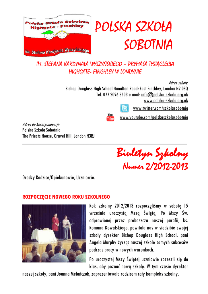POLSKA SZKOŁA SOBOTNIA IM. STEFANA KARDYNAŁA WYSZYŃSKIEGO – PRYMASA TYSIĄCLECIA HIGHGATE- FINCHLEY W LONDYNIE Adres szkoły: Bishop Douglass High School Hamilton Road; East Finchley, London N2 0SQ Tel. 077 2096 8503 e-mail: [email protected] www.polska-szkola.org.uk www.twitter.com/szkolasobotnia www.youtube.com/polskaszkolasobotnia Adres do korespondencji: Polska Szkoła Sobotnia The Priests House, Gravel Hill; London N3RJ ___________________________________________________________ Biuletyn Szkolny Numer 2/2012-2013 Drodzy Rodzice/Opiekunowie, Uczniowie. ROZPOCZĘCIE NOWEGO ROKU SZKOLNEGO Rok szkolny 2012/2013 rozpoczęliśmy w sobotę 15 września uroczystą Mszą Świętą. Po Mszy Św. odprawionej przez proboszcza naszej parafii, ks. Romana Kowalskiego, powitała nas w siedzibie swojej szkoły dyrektor Bishop Douglass High School, pani Angela Murphy życząc naszej szkole samych sukcesów podczas pracy w nowych warunkach. Po uroczystej Mszy Świętej uczniowie rozeszli się do klas, aby poznać nową szkołę. W tym czasie dyrektor naszej szkoły, pani Joanna Melańczuk, zaprezentowała rodzicom cały kompleks szkolny. NOWA SZKOŁA Rozpoczynamy drugi miesiąc pracy w nowej szkole. Dociera do nas wiele pozytywnych opinii dotyczących nowego budynku szkoły. Kwestie wyposażenia klas oraz pomocy szkolnych, dużej przestrzeni szkolonego hallu, dużej ilości i łatwej dostępności do szkolnych toalet to z pewnością niektóre z wielu pozytywnych zmian, które powitały nas w nowej przestrzeni. Pozostają jeszcze jednak kwestie, które wciąż wymagają dopracowania i tu bardzo prosimy wszystkich rodziców i opiekunów o pomoc. Musimy jeszcze dopracować sposób doprowadzania dzieci na lekcje oraz ich odbioru. Dotychczasowe próby podjęte w tym kierunku są z pewnością niesatysfakcjonujące i pracujemy nad tym, aby system usprawnić do stopnia, w którym będzie to proces szybki i wygodny dla rodziców, uczniów oraz wolontariuszy naszej szkoły. Równocześnie bardzo prosimy o ostrożną jazdę na terenie wyznaczonym dla nas przez szkołę Bishop Douglass do ruchu samochodowego. SZKOLNY PARKING Prosimy zauważyć, że szkolny parking będzie zamknięty dla ruchu drogowego między 10:30 a 11:30. Ruch samochodowy będzie wstrzymany ze względu na bezpieczeństwo naszych uczniów, którzy mogą przebywać w okolicy parkingu w czasie przerwy w zajęciach. NOWY ROK SZKOLNY Nowy rok szkolny zaczął się od bardzo wielu zmian związanych z przeprowadzką do nowej siedziby. Jednocześnie jest dla nas olbrzymią radością, że kontynuuje u nas naukę tak wielu uczniów z lat ubiegłych. Na chwilę obecną zapisanych jest 249 uczniów w 15 klasach, z czego zdecydowaną większość stanowią uczniowie, którzy uczęszczali do naszej szkoły w roku ubiegłym. Bardzo cieszymy się zaufaniem jakim obdarzyliście nas Państwo decydując się na dalsze bycie z nami pomimo zmiany miejsca prowadzenia zajęć. Możemy jednocześnie zapewnić, że nasza szkoła będzie się dalej rozwijać i dążyć do osiągania najwyższych standardów nauczania. PODRĘCZNIKI Pomimo dużych zmian wokół, życie w szkole toczy się nieodmiennym rytmem dyktowanym przez napięty terminarz zajęć oraz program nauczania. W tym roku większość podręczników, na których pracujemy to książki Pani Małgorzaty Pawlusiewicz. Pani Pawlusiewicz to znana autorka podręczników dla sobotnich szkół polonijnych, która od 20 lat pracuje w największej polskiej szkole w Chicago w Stanach Zjednoczonych. Z podręczników p. Pawlusiewicz korzystamy w klasach od pierwszej do ósmej. W klasach młodszych, tj. w klasie przedszkolnej oraz w klasach zerowych (ang. Reception) korzystamy z podręczników sprowadzonych z Polski. Są to odpowiednio „Wesołe przedszkole trzylatka” oraz „Wesołe przedszkole czterolatka” autorstwa Małgorzaty Walczak-Sarao' oraz Danuty Kręcisz. Wszystkie podręczniki i zeszyty zostały już rozdane uczniom, którzy intensywny proces nauki w bieżącym roku szkolnym rozpoczęli już od pierwszych zajęć w tym roku szkolnym. ZMIANA DATY PASOWANIA NA UCZNIA Uwaga: Ze względu na zobowiązania zawodowe naszych wolontariuszy musieliśmy zmienić datę ceremonii Pasowania na Ucznia. Uroczystość ta, przeznaczona dla uczniów klasy pierwszej odbędzie się w ostatnią sobotę przed przerwą (Half Term), tj. 27 października br. ZABAWA ANDRZEJKOWA DLA RODZICÓW Prosimy wszystkich rodziców i opiekunów o zarezerwowanie daty 1 grudnia br. Wieczorem tego dnia w naszej szkole odbędzie się dla Was Zabawa Andrzejkowa. Przygrywał nam będzie zespół DuoKarpaty. Więcej informacji w listopadowym biuletynie. SZKOLNA ADMINISTRACJA Proces zapisów do szkoły powoli dobiega do końca. Zapisywani są jeszcze pojedynczy uczniowie a klasy wypełnione zostają w komplecie. W związku z tym od października do maja przyszłego roku szkolna administracja czynna będzie w godz. 9:15 – 10:30. Po tym czasie wolontariusze pracujący w administracji bedą brac udział w zebraniach na terenie szkoły i nie będą mieli możliwości pracować na stanowisku. Wszelkie sprawy natury administracyjnej prosimy załatwiać w nowych godzinach otwarcia. KALENDARZ TYDZIEŃ DATA ZAJĘCIA 4 5 6 7 8 9 10 11 12 06/10/2012 13/10/2012 20/10/2012 27/10/2012 03/11/2012 10/11/2012 17/11/2012 24/11/2012 01/12/2012 Zajęcia 4 Zajęcia 5 Zajęcia 6 Zajęcia 7 HALF TERM Zajęcia 8 Zajęcia 9 Zajęcia 10 Zajęcia 11 13 14 15 16 17 18 19 20 21 08/12/2012 15/12/2012 22/12/2012 29/12/2012 05/01/2013 12/01/2013 19/01/2013 26/01/2013 02/02/2013 Zajęcia 12 Zajęcia 13 HALF TERM HALF TERM HALF TERM Zajęcia 14 Zajęcia 15 Zajęcia 16 Zajęcia 17 22 23 24 25 26 27 28 29 30 09/02/2013 16/02/2013 23/02/2013 02/03/2013 09/03/2013 16/03/2013 23/03/2013 30/03/2013 06/04/2013 Zajęcia 18 Zajęcia 19 HALF TERM Zajęcia 20 Zajęcia 21 Zajęcia 22 Zajęcia 23 Zajęcia 24 HALF TERM 31 32 33 34 35 36 37 38 39 13/04/2013 20/04/2013 27/04/2013 04/05/201