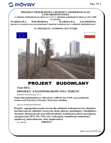 Egz. Nr 1 PROJEKT PRZEBUDOWY i BUDOWY (MODERNIZACJI) LINII ŚREDNICOWEJ w układzie dalekobieŜnym (linia nr 1 i 2) i w układzie podmiejskim (linia nr 447 i 448) na odcinku WARSZAWA WSCHODNIA – WARSZAWA ZACHODNIA łącznie ze stacjami oraz przystankami i tunelem średnicowym w układzie dalekobieŜnym Nr PROJEKTU: FS2004/PL/16/C/PT/006 PROJEKT BUDOWLANY Tom III/2. PROJEKT ZAGOSPODAROWANIA TERENU Zadanie inwestycyjne Nr 2: Szlak linii podmiejskiej nr 448 od km 1,680 do km 3,929 z przystankami osobowymi Warszawa Powiśle i Warszawa Stadion Nazwa obiektu/podobiektu: Projekt zagospodarowania terenu dla obiektów kubaturowych, obiektów inŜynieryjnych, układów torowych, dróg, placów, parkingów i chodników, ekranów akustycznych oraz infrastruktury technicznej (sieci i przyłącza): energetyczne (WN, SN, NN), srk, trakcyjnej, kanalizacji sanitarnej i opadowej, teletechniczne, sieci ciepłownicze. 2PB/PZT Nr obiektu: Data: styczeń 2010 rok Spis zawartości PROJEKTU BUDOWLANEGO przebudowy i budowy (modernizacji) linii średnicowej w Warszawie na odcinku: Warszawa Wschodnia – Warszawa Zachodnia z podziałem na Zadania inwestycyjne Zadanie 1 Zadanie 2 Zadanie 3 Zadanie 4 Zadanie 5 Zadanie 6 Zadanie 7 Stacja Warszawa Wschodnia Osobowa Szlak linii podmiejskiej nr 448 od km 1,680 do km 3,929 z przystankami osobowymi Warszawa Powiśle i Warszawa Stadion Szlak linii podmiejskiej nr 448 od p.o. Śródmieście (strona wschodnia km 0,404) do stacji Warszawa Zachodnia z przystankiem osobowym Warszawa Ochota Szlak linii dalekobieŜnej nr 2 od stacji Warszawa Centralna (wyłącznie) do stacji Warszawa Wschodnia Osobowa (km 3,770) łącznie z tunelem średnicowym dla ruchu dalekobieŜnego Stacja Warszawa Centralna Szlak linii dalekobieŜnej nr 1 od stacji Warszawa Centralna (km 0,616) do stacji Warszawa Zachodnia Stacja Warszawa Zachodnia Tom I. INWENTARYZACJA OBIEKTÓW BUDOWLANYCH (budynków, budowli, sieci uzbrojenia terenu) w zakresie niezbędnym do opracowania Projektu budowlanego. Stanowią odrębne zeszyty. Tom II. CZĘŚĆ TECHNOLOGICZNO – RUCHOWA. A. B. Część technologiczno – ruchowa, obejmująca zakres robót przewidzianych do wykonania przed EURO-2012. (Zamieszczono w Projekcie budowlanym w ramach Zadania 1). Część technologiczno – ruchowa, obejmująca zakres robót przewidzianych do wykonania po EURO-2012. Tom III/1. CZĘŚĆ OGÓLNA (FORMALNO - PRAWNA PROJEKTU BUDOWLANEGO). a w tym: 1. WYKAZ DZIAŁEK, na których została zlokalizowana projektowana inwestycja kolejowa objęta niniejszym Projektem budowlanym 2. ZESPÓŁ AUTORSKI PROJEKTU BUDOWLANEGO 2.1. Wykaz autorów projektu, opracowujących wszystkie części Projektu budowlanego. 2.2. Kserokopie dokumentów kwalifikacyjnych autorów projektu (zgodnie z pkt. 2.1.) 3. PODSTAWA OPRACOWANIA PROJEKTU BUDOWLANEGO. 3.1. 3.2. Podstawa formalno – prawna. Podstawa merytoryczna. 4. DOKUMENTY ZWIĄZANE Z PROJEKTEM BUDOWLANYM 4.1. 4.2. Wykaz załączonych do projektu wymaganych przepisami szczególnymi: decyzji, uzgodnień, pozwoleń lub opinii (takŜe specjalistycznych) oraz, stosownie do potrzeb, oświadczeń właściwych jednostek organizacyjnych, o których mowa w art. 34 ust. 3 pkt. 3 ustawy Prawo budowlane Kserokopie załączonych do projektu dokumentów (zgodnie z pkt. 4.1.) Tom III/2. PROJEKT ZAGOSPODAROWANIA TERENU ……………………………….… – obiekt 2PB/PZT a w tym: 1. CZĘŚĆ OPISOWA. 2. CZĘŚĆ RYSUNKOWA. Tom IV/1÷n. PROJEKTY ARCHITEKTONICZNO – BUDOWLANE Stanowią odrębne zeszyty, a w tym: Lp. TYTUŁ OPRACOWANIA PROJEKTOWEGO 1. Układy torowe z podtorzem, robotami okołotorowymi i odwodnieniem. Układy torowe. Przebudowa układu torowego z podtorzem i robotami okołotorowymi na szlaku linii podmiejskiej nr 448 od km 1,680 do km 3,929 z przystankami osobowymi Warszawa Powiśle i Warszawa Stadion Układy torowe z podtorzem, robotami okołotorowymi i odwodnieniem. Odwodnienie. Budowa odwodnienia torów na p.o. Warszawa Powiśle. Budowa odwodnienia torów na p.o. Warszawa Stadion. Przebudowa odwodnienia torów na szlaku. Urządzenia sterowania ruchem kolejowym (srk). Przebudowa urządzeń samoczynnej blokady liniowej na szlaku Warszawa Wschodnia Osobowa – Warszawa Zachodnia (strona zachodnia). Kable telekomunikacyjne z przebudową kolizji i teletransmisją. 1.1. 2. 2.1. 2.2. 2.3. 3. 3.1. 4. 4.1. 5. 5.1. 6. 6.1. 6.1.1 . NR OBIEKTU / PODOBIEKTU 2PB/T (1÷n) 2PB/T1 2PB/O (1÷n) 2PB/O1 2PB/O2 2PB/O3 2PB/Z (1÷n) 2PB/Z1 2PB/Ł1 (1÷n) 2PB/Ł1.1 Sieć transmisji danych dla potrzeb sterowania i kierowania ruchem kolejowym, i innymi systemami. Obiekty inŜynieryjne; a w tym: Obiekty inŜynieryjne – mosty, przepusty, tunele, wiadukty, przejścia podziemne, kładki, rampy, ściany oporowe 2PB/Ł2 (1÷n) 2PB/Ł2.1 2PB/M (1÷n) 2PB/M1 (1.1÷1.n) Km 1,907 Przebudowa przejścia dla pieszych pod torami linii nr 448 (koniec peronów p.o. Warszawa Powiśle). 2PB/M1.1 Opracowanie wielobranŜowe, a w tym: 6.1.1 .1. 6.1.1 .2. 6.1.1 .3. 6.1.1 .4. 6.1.1 .5. Konstrukcja 2PB/M1.1-K Architektura 2PB/M1.1-A Odwodnienie 2PB/M1.1-O Instalacje sanitarne wod. – kan. 2PB/M1.1-IS Instalacje elektryczne i oświetlenie (ujęte w opracowaniu) 2PB/E2.1 Lp. 6.1.1 .6. 6.1.2 . TYTUŁ OPRACOWANIA PROJEKTOWEGO Instalacje teletechniczne Km 1,900+059 (ujęte w opracowaniu) Przebudowa wiaduktu kolejowego nad ulicą L. Kruczkowskiego. NR OBIEKTU / PODOBIEKTU 2PB/Ł3.1 2PB/M1.2 Opracowanie wielobranŜowe, a w tym: 6.1.2 .1. 6.1.2 .2. 6.1.3 . Konstrukcja 2PB/M1.2-K Odwodnienie 2PB/M1.2-O Km 1,900+226 Przebudowa wiaduktu kolejowego nad ulicą Solec. Opracowanie wielobranŜowe, a w tym: 6.1.3 .1. 6.1.3 .2. 6.1.4 . Konstrukcja 2PB/M1.3-K Odwodnienie 2PB/M1.3-O Km 2,039 - Przebudowa wiaduktu kolejowego nad ulicą WybrzeŜe Kościuszkowskie. 2PB/M1.4 Opracowanie wielobranŜowe, a w tym: 6.1.4 .1. 6.1.4 .2. 6.1.5 . Konstrukcja 2PB/M1.4-K Odwodnienie 2PB/M1.4-O Km 2,148 - Przebudowa wiaduktu kolejowego nad ulicą Bulwarową. 2PB/M1.5 Opracowanie w