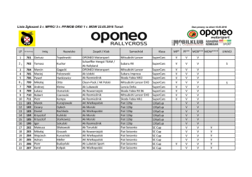 Lista Zgłoszeń 2 r. MPRC/ 3 r. PP/MOB ORX/ 1 r. MOW 22.05.2016 Toruń LP Nr Startowy Imię Nazwisko 1 701 Dariusz Topolewski 2S 702 Tomasz Kuchar 3 4 5 6S 7 8 9 10 11 12 13 14 15 16 17 18 19 20 21 22 704 705 706 799 708 709 710 711 101 102 103 104 105 106 202 203 204 205 206 207 Marcin Maciej Paweł Mikołaj Andrzej Łukasz Robert Piotr Marek Cezary Daniel Krzysztof Krzysztof Igor Mateusz Mikołaj Wojciech Adrian Piotr Karol Gagacki Palczewski Hankiewicz Otto Kleina Osmański Czarnecki Kempa Kurzętowski Dybich Bachleda Kuliński Starkowicz Sokulski Siłakowski Graszek Kurosiński Meller Budzyński Kołpak Zespół / Klub OPONEO Motorsport Schaeffler Hengst TEAM / Ak Rallyland OPONEO Motorsport Ak Łódzki Ak Rzemieślnik Clean-Pack / AK Polski Ak Lubawski Ak Nowomiejski Ak Rzemieślnik Ak Rzemieślnik AK Wielkopolski Ak Morski Ak Wielkopolski Ak Morski Ak Morski Ak Rzemieślnik Ak Toruński Ak Nowomiejski AK Wielkopolski AK Wielkopolski Ak Lubelski Sport Ak Wielkopolski Stan prawny na dzień 16.05.2016 Samochód Klasa MP* Mitsubishi Lancer SuperCars V V V Subaru RX SuperCars V V V Mitsubishi Lancer Subaru Impreza Skoda Fabia MK2 Mitsubishi Lancer EVO Lancia Delta Skoda Fabia RX 06 Mitsubishi Lancer EVO Skoda Fabia Mk1 Fiat 126p Fiat 126p Fiat 126p Fiat 126p Fiat 126p Fiat 126p Fiat Seicento Fiat Seicento Fiat Seicento Fiat Seicento Fiat Seicento Fiat Seicento SuperCars SuperCars SuperCars SuperCars SuperCars SuperCars SuperCars SuperCars 126pCup 126pCup 126pCup 126pCup 126pCup 126pCup SC Cup SC Cup SC Cup SC Cup SC Cup SC Cup V V V V V V V V V V V V V V V V V V V V V V V V V V V V V V V V V V V V V V V V V V V V V V V V V PP** MOB*** MOW**** UWAGI S S V V V V V V LP Nr Startowy 23 24 25 26 27 28 29 30 31 32 33 34 35 36 37 38 39 40 41 42 43 44 45 46 47 48 49 50 51 208 209 210 211 212 213 214 215 216 217 218 301 302 303 304 306 307 308 309 310 311 312 313 314 315 317 405 406 410 Imię Maciej Maciej Oskar Łukasz Jakub Mariusz Hubert Damian Marcel Łukasz Dariusz Dawid Jerzy Przemysław Piotr Marek Wojciech Kamil DŻORDŻ Łukasz Robert Arkadiusz Krzysztof Andrzej Maciej Wacław Witold Tomasz Alan Nazwisko Szkudlarek Starski Huss Kulesza Wyszyński Rechnio Jarczyński Oleksiak Grudziński Grzybowski Przybytniak Struensee Bieńkowski Wójcicki Olszewski Magrowski Topolewski Wysocki Światowski Jarczyński Kocemba Huss Skrzek Kula Sikorski Szulc Soldat Wiśniewski Klub / Zespół Ak Wielkopolski Ak Rzemieślnik OPONEO Motorsport Ak Rzemieślnik Ak Polski Ak Rzemieślnik OPONEO Motorsport Ak Rzemieślnik Ak Orski Ak Rzemieślnik Ak Bydgoski Ak Kujawsko-Pomorski Ak Kujawsko-Pomorski Ak Toruński OPONEO Motorsport OPONEO Motorsport Ak Bydgoski Ak Kujawsko-Pomorski Ak Włocławski OPONEO Motorsport OPONEO Motorsport OPONEO Motorsport Ak Rzemieślnik Ak Toruński Ak Rzemieślnik Ak Kujawsko-Pomorski Ak Morski Ak Rzemieślnik Samochód Fiat Seicento Fiat Seicento Fiat Seicento Fiat Seicento Fiat Seicento Fiat Seicento Fiat Seicento Fiat Seicento Fiat Seicento Fiat Seicento Fiat Seicento BMW E36 BMW E36 BMW E36 BMW E36 BMW 318 is BMW E36 BMW E36 BMW E36 BMW E36 BMW E36 BMW E36 BMW E36 BMW E36 BMW E36 BMW E36 VW Golf Honda CRX Citroen Saxo Klasa SC Cup SC Cup SC Cup SC Cup SC Cup SC Cup SC Cup SC Cup SC Cup SC Cup SC Cup BMW E36 BMW E36 BMW E36 BMW E36 BMW E36 BMW E36 BMW E36 BMW E36 BMW E36 BMW E36 BMW E36 BMW E36 BMW E36 BMW E36 BMW E36 K1 K1 K1 MP* V V V V V V PP** MOB*** MOW**** V V V V V V V V V V V V V V V V V V V V V V V V V V V V V V V V V V V V V V V V V V V V V V V V V V V V V V V V V V V V V V V V V V V V V V V V V V V V V V V V V V V V UWAGI LP Nr Startowy 52 53 54 55 56 57 58 59 60 61 62 63 64 415 416 417 403 404 411 402 407 408 409 412 413 414 Imię Aleksandra Dariusz Kamil Wojciech Mariusz Robert DIZEL Łukasz Daniel Marcin Maciej Paweł Michał Nazwisko Maj Sobecki Lewandowski Maciejewski Szkudlarek Górniak Zoll Krzysiak Perzyna Pawelec Melon Genstwa Klub / Zespół Ak Polski Ak Polski ŁZM Motosportklub AK Wielkopolski Ak Królewski Ak Kujawsko-Pomorski Ak Rzemieślnik Ak Polski Ak Rzemieślnik Ak Polski Ak Polski Ak Nowomiejski *- Mistrzostwa Polski **- Puchar Polski ORX ***- Mistrzostwa Okręgu Bydgoskiego ORX ****- Mistrzostwa Okręgu Warszawskiego PZM Rallycross S - Klasyfikacja Zespołów Sponsorskich Mistrzostw Polski Samochód Citroen Saxo Skoda Felicia VW Polo Opel Astra Renault Clio Renault Clio BMW E36 BMW E30 BMW E36 BMW E36 BMW E30 BMW E36 Seat Ibiza Cupra Turbo Klasa K1 K1 K1 K2 K2 K2 K3 K3 K3 K3 K3 K3 K3 MP* V V V V V V V V V V V PP** MOB*** MOW**** V V V V V V V V V V V V V V V V V V V V V V V V V V UWAGI