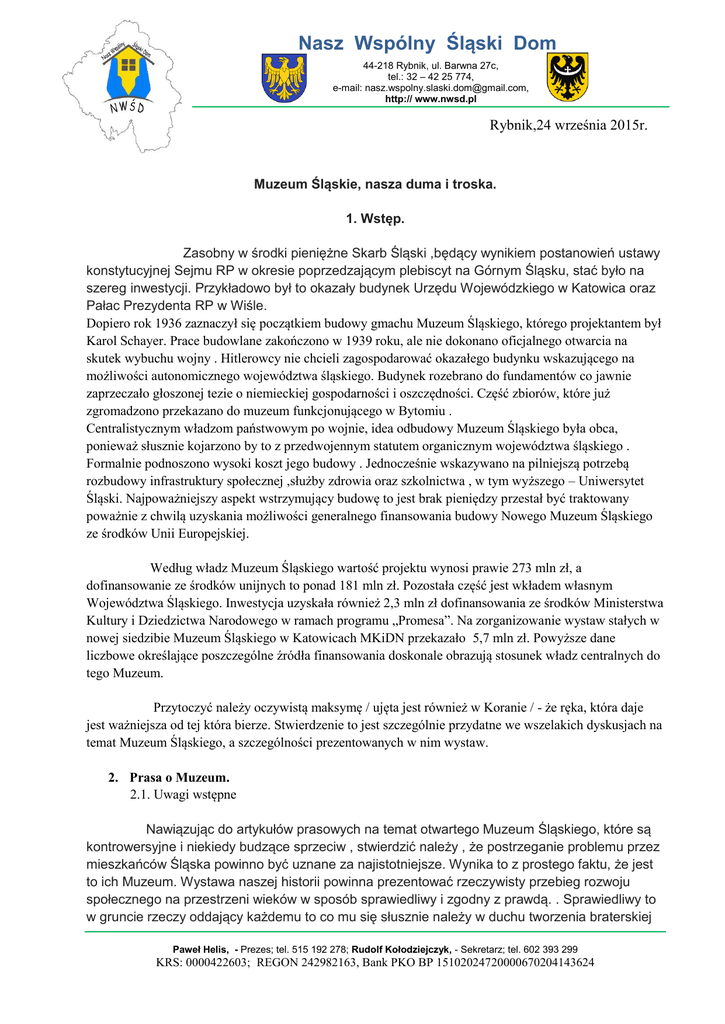Nasz Wspólny Śląski Dom 44-218 Rybnik, ul. Barwna 27c, tel.: 32 – 42 25 774, e-mail: [email protected], http:// www.nwsd.pl Rybnik,24 września 2015r. Muzeum Śląskie, nasza duma i troska. 1. Wstęp. Zasobny w środki pieniężne Skarb Śląski ,będący wynikiem postanowień ustawy konstytucyjnej Sejmu RP w okresie poprzedzającym plebiscyt na Górnym Śląsku, stać było na szereg inwestycji. Przykładowo był to okazały budynek Urzędu Wojewódzkiego w Katowica oraz Pałac Prezydenta RP w Wiśle. Dopiero rok 1936 zaznaczył się początkiem budowy gmachu Muzeum Śląskiego, którego projektantem był Karol Schayer. Prace budowlane zakończono w 1939 roku, ale nie dokonano oficjalnego otwarcia na skutek wybuchu wojny . Hitlerowcy nie chcieli zagospodarować okazałego budynku wskazującego na możliwości autonomicznego województwa śląskiego. Budynek rozebrano do fundamentów co jawnie zaprzeczało głoszonej tezie o niemieckiej gospodarności i oszczędności. Część zbiorów, które już zgromadzono przekazano do muzeum funkcjonującego w Bytomiu . Centralistycznym władzom państwowym po wojnie, idea odbudowy Muzeum Śląskiego była obca, ponieważ słusznie kojarzono by to z przedwojennym statutem organicznym województwa śląskiego . Formalnie podnoszono wysoki koszt jego budowy . Jednocześnie wskazywano na pilniejszą potrzebą rozbudowy infrastruktury społecznej ,służby zdrowia oraz szkolnictwa , w tym wyższego – Uniwersytet Śląski. Najpoważniejszy aspekt wstrzymujący budowę to jest brak pieniędzy przestał być traktowany poważnie z chwilą uzyskania możliwości generalnego finansowania budowy Nowego Muzeum Śląskiego ze środków Unii Europejskiej. Według władz Muzeum Śląskiego wartość projektu wynosi prawie 273 mln zł, a dofinansowanie ze środków unijnych to ponad 181 mln zł. Pozostała część jest wkładem własnym Województwa Śląskiego. Inwestycja uzyskała również 2,3 mln zł dofinansowania ze środków Ministerstwa Kultury i Dziedzictwa Narodowego w ramach programu „Promesa”. Na zorganizowanie wystaw stałych w nowej siedzibie Muzeum Śląskiego w Katowicach MKiDN przekazało 5,7 mln zł. Powyższe dane liczbowe określające poszczególne źródła finansowania doskonale obrazują stosunek władz centralnych do tego Muzeum. Przytoczyć należy oczywistą maksymę / ujęta jest również w Koranie / - że ręka, która daje jest ważniejsza od tej która bierze. Stwierdzenie to jest szczególnie przydatne we wszelakich dyskusjach na temat Muzeum Śląskiego, a szczególności prezentowanych w nim wystaw. 2. Prasa o Muzeum. 2.1. Uwagi wstępne Nawiązując do artykułów prasowych na temat otwartego Muzeum Śląskiego, które są kontrowersyjne i niekiedy budzące sprzeciw , stwierdzić należy , że postrzeganie problemu przez mieszkańców Śląska powinno być uznane za najistotniejsze. Wynika to z prostego faktu, że jest to ich Muzeum. Wystawa naszej historii powinna prezentować rzeczywisty przebieg rozwoju społecznego na przestrzeni wieków w sposób sprawiedliwy i zgodny z prawdą. . Sprawiedliwy to w gruncie rzeczy oddający każdemu to co mu się słusznie należy w duchu tworzenia braterskiej Paweł Helis, - Prezes; tel. 515 192 278; Rudolf Kołodziejczyk, - Sekretarz; tel. 602 393 299 KRS: 0000422603; REGON 242982163, Bank PKO BP 15102024720000670204143624 wspólnoty między ludźmi. Prawdziwe informacje muszą być mocno osadzone w realiach i uwarunkowaniach , pewne oraz godne zaufania. Braterska wspólnota to coś więcej niż narodowa więź i odchylenia od prawdy oraz sprawiedliwości w imię narodowej racji stanu .Myśli jakie się nasuwają w tym aspekcie to mniejsze znaczenie artykułów o nacjonalistycznym wydźwięku , jako wypaczonych. W zakamarkach pamięci mamy treści artykułów napisanych przez pewnych siebie dziennikarzy , których wiadomości o Śląsku są mitologiczne i mgliste. Z tego powodu warto odnieść się jedynie do artykułów napisanych przez byłego dyrektora Muzeum Śląskiego – Leszka Jodlińskiego oraz eksperta w zakresie historii i muzealnictwa Ewę Chojecką . Refleksje, myśli i skojarzenia jakie się nasuwają z w związku z ich artykułami wynikają z posiadanej wiedzy i są zgodne z własnym sumieniem. 2.2. Leszek Jodliński „ Wystawa o naszej historii … „ To co nam przedstawiono jest dziełem skończonym ,realnym , samoistnym i mniej istotne jest dla przeciętnego zwiedzającego czym jej autorzy byli inspirowani. Stworzono konkretny stan rzeczy, który można chwalić lub ganić. Nie można odwoływać się do wyświechtanych określeń , że wystawa to film , ale klasy B, w sytuacji gdy w Polsce i na świecie przeważają tandetne filmy pozaklasowe dla masowego, bezkrytycznego odbiorcy. Niektóre filmy narzucają widzom, w którym momencie są śmieszne zdarzenia poprzez rechot na ścieżce dźwiękowej. Zaprzeczeniem słabej klasy ekspozycji w Muzeum były w początkowym okresie tłumy zwiedzających, którzy przyszli świadomie i dobrowolnie , aby w długich kolejkach liczących, okresowo 150 – 200 osób doczekać się spełnienia swoich pragnień . Jest subiektywnym osądem autora, czy liczba zbędnych multimediów jest porażająca lub w sam raz. Decydujący osąd należy do zwiedzających, bo oni są w Muzeum najważniejsi. Zgodny jestem z poglądem, że „obraz” anonimowej arystokracji lub pamiątka w formie dużego plakatu z pielgrzymki do Kalwarii Zebrzydowskiej, są eksponatami zbędnymi nie umiejscowionymi w zasadniczych realiach Śląska. Arystokracja śląska pozbawiona była nadmiernej pychy i pasożytniczego trybu życia. Do dziś krąży wśród ludu informacja, że bogaty książę Lichnowski / y/ doglądał przebiegu robót w zreperowanych butach. Pielgrzymki do Kalwarii Zebrzydowskiej były marginalne w odniesieniu do całego ruchu pątniczym pobożnego ludu śląskiego. Wybór eksponatów będzie zawsze dylematem, ale nie można dopuści