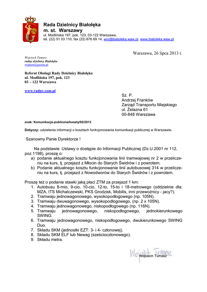 Rada Dzielnicy Białołęka m. st. Warszawy ul. Modlińska 197, pok. 123, 03-122 Warszawa, tel. (22) 51 03 110, fax (22) 676 69 14, [email protected], www.bialoleka.waw.pl Warszawa, 26 lipca 2013 r. Wojciech Tumasz radny dzielnicy Białołęka [email protected] Referat Obsługi Rady Dzielnicy Białołęka ul. Modlińska 197, pok. 123 03 – 122 Warszawa www.radny.com.pl Sz. P. Andrzej Franków Zarząd Transportu Miejskiego ul. Żelazna 61 00-848 Warszawa znak: Komunikacja-publiczna/koszty/02/2013 Dotyczy: udzielenia informacji o kosztach funkcjonowania komunikacji publicznej w Warszawie. Szanowny Panie Dyrektorze ! Na podstawie: Ustawy o dostępie do Informacji Publicznej (Dz.U.2001 nr 112, poz.1198), proszę o: a) podanie aktualnego kosztu funkcjonowania linii tramwajowej nr 2 w przeliczeniu na kurs, tj. przejazd z Młocin do Starych Świdrów i z powrotem. b) Podanie aktualnego kosztu funkcjonowanie linii autobusowej 314 w przeliczeniu na kurs, tj. przejazd z Nowodworów do Starych Świdrów i z powrotem. Proszę też o podanie stawki jaką płaci ZTM za przejazd 1 km: 1. Autobusu 8-mio, 9-cio, 10-cio, 12-to, 15-to i 18-metrowego (oddzielnie dla: MZA, ITS Michalczewski, PKS Grodzisk, Mobilis, inni przewoźnicy - jacy?). 2. Tramwaju jednowagonowego, wysokopodłogowego (np. 105N). 3. Tramwaju dwuwagonowego, wysokopodłogowego, (np. 2 x 105N). 4. Tramwaju jednowagonowego, niskopodłogowego (np. 116N). 5. Tramwaju jednowagonowego, niskopodłogowego, jednokierunkowego SWING. 6. Tramwaju jednowagonowego, niskopodłogowego, dwukierunkowego SWING Duo. 7. Składu SKM (jednostki EZT: 3- i 4- członowej). 8. Składu SKM ELF lub Newag (sześcioczłonowego). 9. Składu metra. Wojciech Tumasz