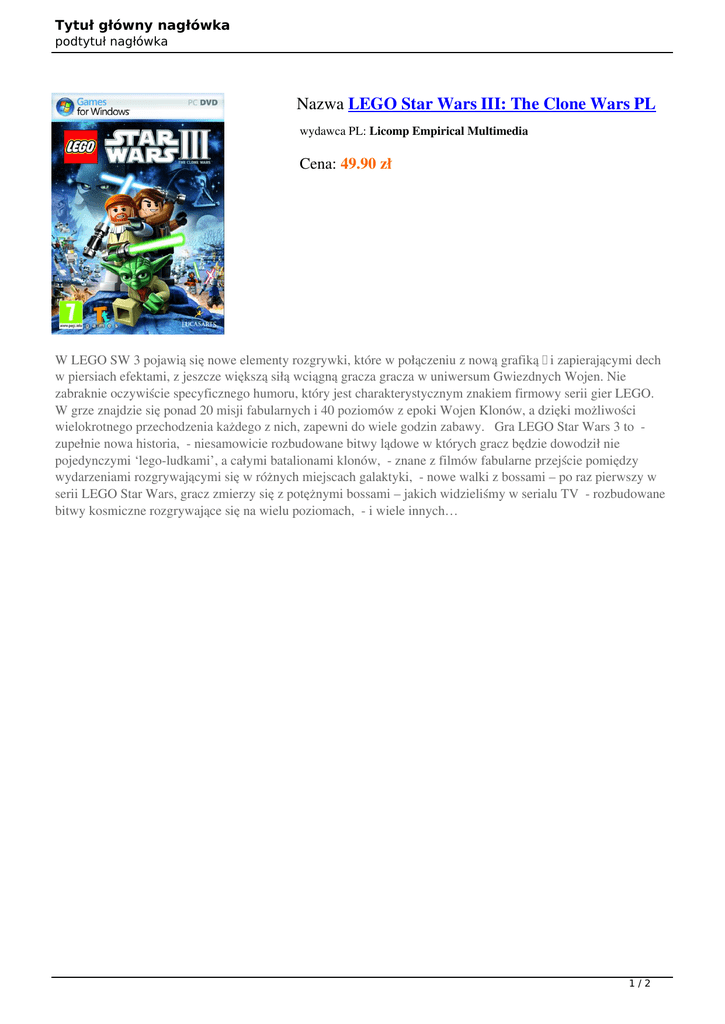 Tytuł główny nagłówka podtytuł nagłówka Nazwa LEGO Star Wars III: The Clone Wars PL wydawca PL: Licomp Empirical Multimedia Cena: 49.90 zł W LEGO SW 3 pojawią się nowe elementy rozgrywki, które w połączeniu z nową grafiką i zapierającymi dech w piersiach efektami, z jeszcze większą siłą wciągną gracza gracza w uniwersum Gwiezdnych Wojen. Nie zabraknie oczywiście specyficznego humoru, który jest charakterystycznym znakiem firmowy serii gier LEGO. W grze znajdzie się ponad 20 misji fabularnych i 40 poziomów z epoki Wojen Klonów, a dzięki możliwości wielokrotnego przechodzenia każdego z nich, zapewni do wiele godzin zabawy. Gra LEGO Star Wars 3 to zupełnie nowa historia, - niesamowicie rozbudowane bitwy lądowe w których gracz będzie dowodził nie pojedynczymi ‘lego-ludkami’, a całymi batalionami klonów, - znane z filmów fabularne przejście pomiędzy wydarzeniami rozgrywającymi się w różnych miejscach galaktyki, - nowe walki z bossami – po raz pierwszy w serii LEGO Star Wars, gracz zmierzy się z potężnymi bossami – jakich widzieliśmy w serialu TV - rozbudowane bitwy kosmiczne rozgrywające się na wielu poziomach, - i wiele innych… 1/2 Tytuł główny nagłówka podtytuł nagłówka Nazwa Wartość Wydawca PL Licomp Empik Multimedia Data premiery 25 marca 2011 Producent Tryb gry Kategoria wiekowa Wersja językowa Wymagania sprzętowe Format Traveller's Tales Single / Multiplayer 7+ PL (napisy) Intel P4 2.24 GHz lub AMD Athlon 64;512 MB RAM 8.0 G 1xDVD 2/2