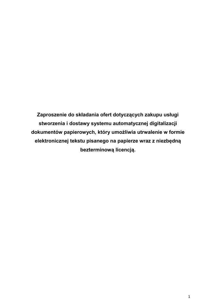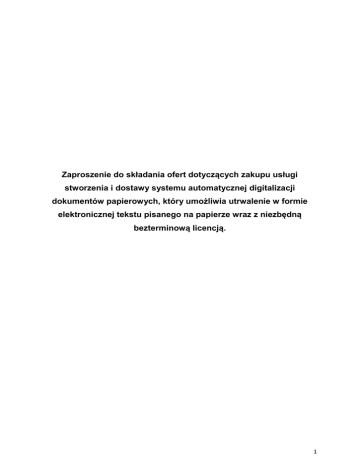 Zaproszenie do składania ofert dotyczących zakupu usługi stworzenia i dostawy systemu automatycznej digitalizacji dokumentów papierowych, który umożliwia utrwalenie w formie elektronicznej tekstu pisanego na papierze wraz z niezbędną bezterminową licencją. 1 Lublin, 15 czerwca 2016 roku Zaproszenie do składania ofert I. Nazwa i adres Zamawiającego: Województwo Lubelskie z siedzibą w Lublinie ul. Artura Grottgera 4 20 – 029 Lublin Osoba wyznaczona do kontaktów: Marcin Magdziarz telefon: 81 478 14 69 e-mail: [email protected] Godziny pracy Urzędu Marszałkowskiego Województwa Lubelskiego w Lublinie: poniedziałek – piątek, godz. 730 – 1530. II. Informacje ogólne: 1. Samorząd Województwa Lubelskiego (dalej „Województwo”) planuje dokonać zakupu usługi stworzenia i dostawy systemu automatycznej digitalizacji dokumentów papierowych, który umożliwia utrwalenie w formie elektronicznej tekstu pisanego na papierze wraz z niezbędną bezterminową licencją. 2. Niniejsze ogłoszenie zawiera zaproszenie do składania ofert cenowych zgodnie z Załącznikiem numer 1 – Formularz ofertowy, z Załącznikiem numer 2 – Szczegółowy Opis Przedmiotu Zamówienia oraz z Załącznikiem numer 3 – Wzór umowy. III. Tryb postepowania: Zamówienie poniżej 30 000 euro na podstawie art. 4 pkt 8 ustawy z dnia 29 stycznia 2004 r. – Prawo zamówień publicznych (Dz. U. z 2015 r. poz. 2164). IV. Kod CPV: 38520000-6 Skanery. V. Wskazanie miejsca i terminu składania ofert: Oferty należy składać: Departament Gospodarki i Współpracy Zagranicznej Urząd Marszałkowski Województwa Lubelskiego w Lublinie 2 Sekretariat III piętro ul. Artura Grottgera 4, 20 – 029 Lublin 1. Termin składania ofert: do dnia 22.06.2016 roku, do godz. 15:00. 2. Oferty należy składać drogą pocztową lub przesyłką kurierską w zamkniętej kopercie /opakowaniu/, która będzie zabezpieczona w sposób uniemożliwiający odczytanie jej zawartości bez uszkodzenia opakowania. Koperta /opakowanie/ powinna być oznaczona: nazwą i adresem (firmy) zainteresowanego podmiotu, zaadresowana na adres: Departament Gospodarki i Współpracy Zagranicznej Urząd Marszałkowski Województwa Lubelskiego w Lublinie ul. Artura Grottgera 4, 20 – 029 Lublin oraz opisana według poniższego wzoru: ”Oferta dotycząca usługi stworzenia i dostawy systemu automatycznej digitalizacji dokumentów papierowych. Nie otwierać przez dniem 22.06.2016 r. godz. 15:00” 3. Za termin złożenia oferty przyjęty będzie dzień i godzina otrzymania wniosku przez Województwo, tj. wpływu wniosku do Urzędu Marszałkowskiego Województwa Lubelskiego w Lublinie. VI. Warunki jakie muszą spełniać wykonawcy przystępujący do danego postępowania oraz dokumenty wymagane do oferty: 1. Podmioty, składające ofertę, zobowiązane są do przedłożenia aktualnego odpisu z właściwego rejestru lub centralnej informacji lub w przypadku podmiotów zagranicznych, odpisu z innego rejestru handlowego przetłumaczonego przez tłumacza przysięgłego na język polski. 2. W przypadku, w którym w imieniu podmiotu działa przedstawiciel, którego upoważnienie do reprezentacji nie wynika bezpośrednio z przedstawionego rejestru, przedstawiciel jest zobowiązany do przedłożenia stosownego oryginału pełnomocnictwa. 3. Podpisy mocodawcy muszą zostać złożone przez osoby uprawnione do składania oświadczeń woli wymienione we właściwym rejestrze lub wpisie do centralnej informacji o działalności gospodarczej. 4. Dokument pełnomocnictwa należy przedstawić w formie oryginału lub kopii potwierdzonej za zgodność z oryginałem przez notariusza. 3 5. Oferta musi zawierać: a. Wypełniony i podpisany Formularz ofertowy wraz z załącznikami, b. Odpis z właściwego rejestru lub centralnej informacji bądź w przypadku podmiotów zagranicznych, odpisu z innego rejestru handlowego przetłumaczonego na język polski. 6. Oferta powinna zawierać następujące dane: nazwę/imię i nazwisko zainteresowanego podmiotu, jego siedzibę i adres, wskazane jest także podanie adresu e-mail zainteresowanego podmiotu, a także numeru telefonu i faksu. (według wzoru). 7. Oferta powinna zostać sporządzona w formie pisemnej, w języku polskim oraz zostać podpisana przez osobę upoważnioną do składania oświadczeń woli w imieniu oferenta. 8. Dokumenty sporządzone w języku obcym należy przedłożyć wraz z ich tłumaczeniami na język polski. VII. Kryteria wyboru oferty: Cena 100 %. VIII. Termin dostawy: 45 dni od dnia podpisania umowy z Wykonawcą. IX. Termin płatności faktury: Min. 14 dni od momentu dostawy oraz zaakceptowania protokołu zgodności potwierdzającego odbiór przedmiotu zamówienia. X. Informacje dodatkowe: Zamawiający zastrzega sobie prawo do unieważnienia zamówienia na każdym etapie bez podania przyczyny. XI. Załączniki: 1. Formularz oferty, 2. Szczegółowy Opis Przedmiotu Zamówienia. 3. Wzór umowy. 4