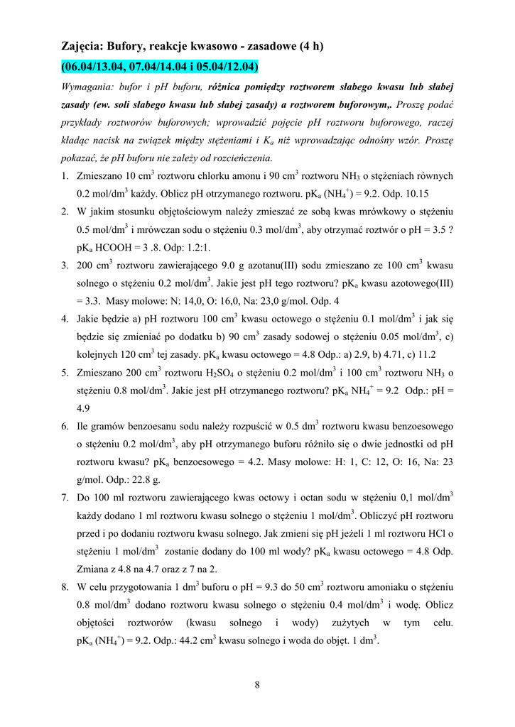 Zajęcia: Bufory, reakcje kwasowo - zasadowe (4 h) (06.04/13.04