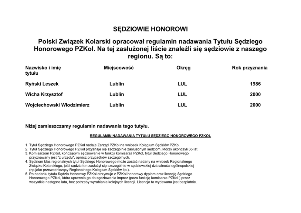 SĘDZIOWIE HONOROWI Polski Związek Kolarski opracował regulamin nadawania Tytułu Sędziego Honorowego PZKol. Na tej zasłużonej liście znaleźli się sędziowie z naszego regionu. Są to: Nazwisko i imię tytułu Miejscowość Okręg Rok przyznania Ryński Leszek Lublin LUL 1986 Wicha Krzysztof Lublin LUL 2000 Wojciechowski Włodzimierz Lublin LUL 2000 Niżej zamieszczamy regulamin nadawania tego tutyłu. REGULAMIN NADAWANIA TYTUŁU SĘDZIEGO HONOROWEGO PZKOL 1. Tytuł Sędziego Honorowego PZKol nadaje Zarząd PZKol na wniosek Kolegium Sędziów PZKol. 2. Tytuł Sędziego Honorowego PZKol przyznaje się szczególnie zasłużonym sędziom, którzy ukończyli 65 lat. 3. Komisarzom PZKol, kończącym sędziowanie w funkcji komisarza PZKol, tytuł Sędziego Honorowego przyznawany jest "z urzędu", oprócz przypadków szczególnych. 4. Sędziom klas regionalnych tytuł Sędziego Honorowego może zostać nadany na wniosek Regionalnego Związku Kolarskiego, jeśli sędzia ten zasłużył się szczególnie w sędziowskiej działalności ogólnopolskiej (np.jako przewodniczący Regionalnego Kolegium Sędziów itp.). 5. Po nadaniu tytułu Sędzia Honorowy PZKol otrzymuje z PZKol honorowy dyplom oraz licencję Sędziego Honorowego PZKol, która uprawnia go do sędziowania imprez (poza funkcją komisarza PZKol ) przez wszystkie następne lata, bez potrzeby wyrabiania kolejnych licencji. Licencja ta wydawana jest bezpłatnie.