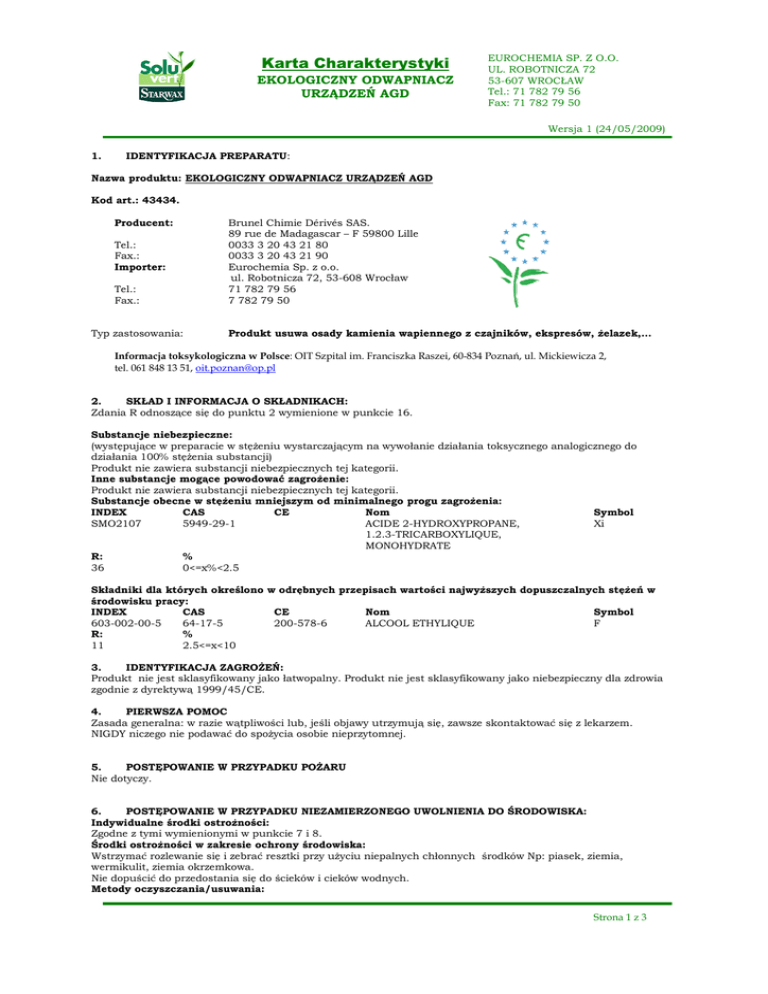Karta Charakterystyki EKOLOGICZNY ODWAPNIACZ URZĄDZEŃ AGD EUROCHEMIA SP. Z O.O. UL. ROBOTNICZA 72 53-607 WROCŁAW Tel.: 71 782 79 56 Fax: 71 782 79 50 Wersja 1 (24/05/2009) 1. IDENTYFIKACJA PREPARATU: Nazwa produktu: EKOLOGICZNY ODWAPNIACZ URZĄDZEŃ AGD Kod art.: 43434. Producent: Tel.: Fax.: Importer: Tel.: Fax.: Typ zastosowania: Brunel Chimie Dérivés SAS. 89 rue de Madagascar – F 59800 Lille 0033 3 20 43 21 80 0033 3 20 43 21 90 Eurochemia Sp. z o.o. ul. Robotnicza 72, 53-608 Wrocław 71 782 79 56 7 782 79 50 Produkt usuwa osady kamienia wapiennego z czajników, ekspresów, Ŝelazek,… Informacja toksykologiczna w Polsce: OIT Szpital im. Franciszka Raszei, 60-834 Poznań, ul. Mickiewicza 2, tel. 061 848 13 51, [email protected] 2. SKŁAD I INFORMACJA O SKŁADNIKACH: Zdania R odnoszące się do punktu 2 wymienione w punkcie 16. Substancje niebezpieczne: (występujące w preparacie w stęŜeniu wystarczającym na wywołanie działania toksycznego analogicznego do działania 100% stęŜenia substancji) Produkt nie zawiera substancji niebezpiecznych tej kategorii. Inne substancje mogące powodować zagroŜenie: Produkt nie zawiera substancji niebezpiecznych tej kategorii. Substancje obecne w stęŜeniu mniejszym od minimalnego progu zagroŜenia: INDEX CAS CE Nom Symbol SMO2107 5949-29-1 ACIDE 2-HYDROXYPROPANE, Xi 1.2.3-TRICARBOXYLIQUE, MONOHYDRATE R: % 36 0<=x%<2.5 Składniki dla których określono w odrębnych przepisach wartości najwyŜszych dopuszczalnych stęŜeń w środowisku pracy: INDEX CAS CE Nom Symbol 603-002-00-5 64-17-5 200-578-6 ALCOOL ETHYLIQUE F R: % 11 2.5<=x<10 3. IDENTYFIKACJA ZAGROśEŃ: Produkt nie jest sklasyfikowany jako łatwopalny. Produkt nie jest sklasyfikowany jako niebezpieczny dla zdrowia zgodnie z dyrektywą 1999/45/CE. 4. PIERWSZA POMOC Zasada generalna: w razie wątpliwości lub, jeśli objawy utrzymują się, zawsze skontaktować się z lekarzem. NIGDY niczego nie podawać do spoŜycia osobie nieprzytomnej. 5. POSTĘPOWANIE W PRZYPADKU POśARU Nie dotyczy. 6. POSTĘPOWANIE W PRZYPADKU NIEZAMIERZONEGO UWOLNIENIA DO ŚRODOWISKA: Indywidualne środki ostroŜności: Zgodne z tymi wymienionymi w punkcie 7 i 8. Środki ostroŜności w zakresie ochrony środowiska: Wstrzymać rozlewanie się i zebrać resztki przy uŜyciu niepalnych chłonnych środków Np: piasek, ziemia, wermikulit, ziemia okrzemkowa. Nie dopuścić do przedostania się do ścieków i cieków wodnych. Metody oczyszczania/usuwania: Strona 1 z 3 Karta Charakterystyki EKOLOGICZNY ODWAPNIACZ URZĄDZEŃ AGD EUROCHEMIA SP. Z O.O. UL. ROBOTNICZA 72 53-607 WROCŁAW Tel.: 71 782 79 56 Fax: 71 782 79 50 Wersja 1 (24/05/2009) Zmyć najlepiej detergentem, unikać stosowania rozpuszczalników. 7. POSTĘPOWANIE Z PREPARATEM I MAGAZYNOWANIE: Podczas stosowania i przechowywania produktu naleŜy przestrzegać ogólnie obowiązujące przepisy z Rozporządzenia Ministra Pracy i Polityki Socjalnej z dnia 26.09.1997r. w sprawie ogólnych przepisów bezpieczeństwa i higieny pracy (tekst jednolity Dz.U. nr 169 poz. 1650 z 2003r.) Zapobieganie poŜarom: Zakazać wstępu osobom nieupowaŜnionym. 8. KONTROLA NARAśENIA I ŚRODKI OCHRONY INDYWIDUALNEJ: Stosować środki ochrony indywidualnej zgodnie z Dyrektywą 89/686/CEE. Zalecenia porządku technicznego: Personel powinien nosić odzieŜ roboczą regularnie praną. 9. WŁAŚCIWOŚCI FIZYKOCHEMICZNE: Stan fizyczny: płyn. WaŜne informacje zdrowotne i dotyczące środowiska naturalnego: Gęstość: =1. PH substancji: silnie kwaśne. Rozpuszczalność w wodzie: rozpuszczalny. Przedział temp. wrzenia: nie dotyczy. Przedział punktu zapłonu: nie dotyczy. Jeśli pomiar PH jest moŜliwy, wartość: nie dotyczy. Ciśnienie par: nie dotyczy. Inne dane: Temp. Samo zapłonu: nie dotyczy. Temp. Połączenia: nie dotyczy. Punkt/przedział rozkładu: nie dotyczy 10. STABILNOŚĆ I REAKTYWNOŚĆ: Produkt jest stabilny gdy przestrzegane są warunki składowania i postępowania wymienione w punkcie 7. 11. INFORMACJE TOKSYKOLOGICZNE: śadne takie informacje dotyczące produktu nie są dostępne. 12. INFORMACJE EKOLOGICZNE: śadne takie informacje dotyczące produktu nie są dostępne. 13. POSTĘPOWANIE Z ODPADAMI: Nie wylewać do ścieków i cieków wodnych. Odpady Pozostałości lub rozlany produkt naleŜy neutralizować zgodnie z Rozporządzeniem Ministra Środowiska z dnia 27.09.2001r. (Dz.U. nr 112 poz. 1206 z 2001r.) Nie wolno doprowadzić do skaŜenia odpadami gruntu i cieków wodnych, nie wolno usuwać do środowiska naturalnego. Brudne opakowania: Całkowicie opróŜnić opakowanie. Zachować etykietę na opakowaniu. Przekazać do odpowiedniej instytucji zajmującej się recyklingiem. Odzysk (recykling) lub unieszkodliwianie odpadów opakowaniowych przeprowadzać zgodnie z obowiązującymi przepisami (Ustawa o opakowaniach i odpadach opakowaniowych, Dz.U. nr 63, poz.638 z dnia 11.05. 2001r.). 14. INFORMACJE O TRANSPORCIE: Nie sklasyfikowany. Transportować produkt zgodnie z normami transportu drogowego (ADR), kolejowego (RID), morskiego (IMGD) i powietrznego (ICAO). 15. INFORMACJE DOTYCZĄCE PRZEPISÓW PRAWNYCH: Produkt został sklasyfikowany zgodnie z dyrektywą 1999/45/CE ze zmianami, oraz z dyrektywą 2004/73/CE po 29 zmianie do dyrektywy 67/548/CEE (Substancje niebezpieczne). Strona 2 z 3 Karta Charakterystyki EKOLOGICZNY ODWAPNIACZ URZĄDZEŃ AGD EUROCHEMIA SP. Z O.O. UL. ROBOTNICZA 72 53-607 WROCŁAW Tel.: 71 782 79 56 Fax: 71 782 79 50 Wersja 1 (24/05/2009) Produkt nie został sklasyfikowany jako niebezpieczny dla zdrowia wg dyrektywy 1999/45/CE. Produkt nie jest łatwopalny. Szczególne zagroŜenia związane z produktem i środki ostroŜności\; S2 Przechowywać z dala od dzieci. Nie mieszać róŜnych środków czyszczących. Nie wdychać produktów w rozpylaczach. 16. INNE INFORMACJE: Warunki pracy uŜytkownika produktu nie będą nam znane. Wszystkie dane zawarte w powyŜszej Karcie Charakterystyki są zgodne z aktualnym stanem wiedzy i zostały opracow