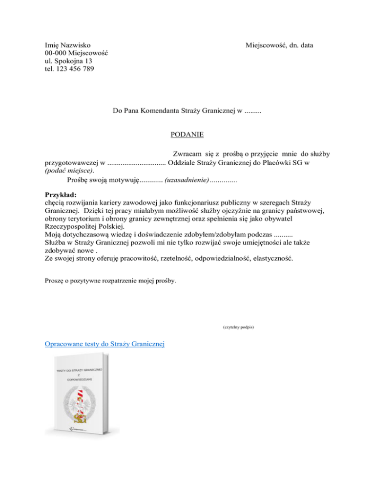 Imię Nazwisko 00-000 Miejscowość ul. Spokojna 13 tel. 123 456 789 Miejscowość, dn. data Do Pana Komendanta Straży Granicznej w ......... PODANIE Zwracam się z prośbą o przyjęcie mnie do służby przygotowawczej w ............................... Oddziale Straży Granicznej do Placówki SG w (podać miejsce). Prośbę swoją motywuję............ (uzasadnienie) .............. Przykład: chęcią rozwijania kariery zawodowej jako funkcjonariusz publiczny w szeregach Straży Granicznej. Dzięki tej pracy miałabym możliwość służby ojczyźnie na granicy państwowej, obrony terytorium i obrony granicy zewnętrznej oraz spełnienia się jako obywatel Rzeczypospolitej Polskiej. Moją dotychczasową wiedzę i doświadczenie zdobyłem/zdobyłam podczas .......... Służba w Straży Granicznej pozwoli mi nie tylko rozwijać swoje umiejętności ale także zdobywać nowe . Ze swojej strony oferuję pracowitość, rzetelność, odpowiedzialność, elastyczność. Proszę o pozytywne rozpatrzenie mojej prośby. (czytelny podpis) Opracowane testy do Straży Granicznej