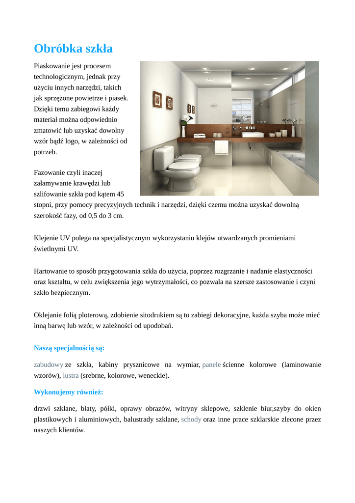 Obróbka szkła Piaskowanie jest procesem technologicznym, jednak przy użyciu innych narzędzi, takich jak sprzężone powietrze i piasek. Dzięki temu zabiegowi każdy materiał można odpowiednio zmatowić lub uzyskać dowolny wzór bądź logo, w zależności od potrzeb. Fazowanie czyli inaczej załamywanie krawędzi lub szlifowanie szkła pod kątem 45 stopni, przy pomocy precyzyjnych technik i narzędzi, dzięki czemu można uzyskać dowolną szerokość fazy, od 0,5 do 3 cm. Klejenie UV polega na specjalistycznym wykorzystaniu klejów utwardzanych promieniami świetlnymi UV. Hartowanie to sposób przygotowania szkła do użycia, poprzez rozgrzanie i nadanie elastyczności oraz kształtu, w celu zwiększenia jego wytrzymałości, co pozwala na szersze zastosowanie i czyni szkło bezpiecznym. Oklejanie folią ploterową, zdobienie sitodrukiem są to zabiegi dekoracyjne, każda szyba może mieć inną barwę lub wzór, w zależności od upodobań. Naszą specjalnością są: zabudowy ze szkła, kabiny prysznicowe na wymiar, panele ścienne kolorowe (laminowanie wzorów), lustra (srebrne, kolorowe, weneckie). Wykonujemy również: drzwi szklane, blaty, półki, oprawy obrazów, witryny sklepowe, szklenie biur,szyby do okien plastikowych i aluminiowych, balustrady szklane, schody oraz inne prace szklarskie zlecone przez naszych klientów. W swojej pracy wykorzystujemy szereg tradycyjnych i nowoczesnych technik obróbki szkła, w tym: • • • • • cięcie szkła do 20 mm piaskowanie wiercenie otworów szlifowanie fazowanie • • • • • matowienie klejenie UV hartowanie oklejanie folią ploterową zdobienie sitodrukiem Szklenie Oferujemy usługi szklarskie w zakresie obróbki szkła i montażu w Warszawie. Przyjmujemy zamówienia na wykończenie mieszkań, restauracji, biur, szklenie okien i witryn sklepowych (także spoza Warszawy), a nawet podejmiemy się nowych wyzwań - zmniejszenie akwarium to dla nas żaden problem! Naszą domeną jest obróbka szkła. Wszystkie powierzone prace wykonujemy kompleksowo od obmiaru przez wykonanie po montaż. Wykorzystujemy najlepszej jakości szkło i akcesoria uznanych producentów. Szkło bezpieczne, ornamentowe, kominkowe, szyby zespolone i antywłamaniowe - ręcze za ich najwyższy standard. Służymy fachową poradą i mamy indywidualne podejście Wszystkie nasze realizacje objęte są 12-miesięczną gwarancją. Lustra na zamówienie Firma Parcie na Szkło posiada w swojej ofercie lustra klasyczne i weneckie. Realizujemy lustra na wymiar o dowolnym kształcie, przez co istnieje możliwość dopasowania ich do każdego wnętrza. Decydując się na montaż lustra, sprawią Państwo, że wnętrze będzie wydawać się jaśniejsze i bardziej przestronne. do każdego klienta. W celu zwiększenia walorów estetycznych oferowanych przez nas luster szlifujemy bądź frezujemy krawędzie. Ten rodzaj obróbki chroni również przed zranieniem. Klienci mają także możliwość wyboru wersji kolorystycznej lustra (odcień srebrny, brązowy lub grafitowy). Lustra oferowane przez naszą firmę wykonane są z wysokiej jakości materiałów, przez co są odporne na wilgoć. Realizujemy zamówienia nie tylko na terenie Warszawy. Lustra weneckie Lustro weneckie charakteryzuje się zwierciadlanym odbijaniem z jednej strony, z drugiej zaś przejrzystością szyby. Przy właściwym oświetleniu bardzo łatwo jest je pomylić ze zwykłym lustrem. Należy jednak pamiętać, że przez lustro widoczne jest pomieszczenie bardziej oświetlone. Dlatego to osoby przebywające w jaśniejszym wnętrzu widzą swoje odbicie, a osoby znajdujące się w ciemniejszym pomieszczeniu mogą obserwować osoby znajdujące się po drugiej stronie. Wykorzystując nowoczesne technologie, istnieje możliwość uzyskania efektu lustra weneckiego dla pomieszczeń o takim samym natężeniu światła. Tego typu lustra znajdują zastosowania w drzwiach wejściowych, przestrzeniach biurowych, salach konferencyjnych, bankach oraz wszędzie tam, gdzie istnieje potrzeba dyskretnej obserwacji. Panele szklane Panele szklane najczęściej montowane są w pomieszczeniach, w których ściany narażone są na skoki temperatur, wilgoć, promieniowanie UV oraz inne czynniki mogące wpłynąć destrukcyjnie na poszczególne powierzchnie. Cechą charakterystyczną paneli szklanych jest wysoka odporność na możliwe zniszczenia spowodowane codziennym użytkowaniem. Panele szklane najczęściej znajdują zastosowanie w kuchniach i łazienkach. Jednak ze względu na wysokie walory estetyczne niektórzy klienci decydują się również na zamontowanie ich w innych pomieszczeniach. Istnieje możliwość zamówienia paneli szklanych w różnych wersjach kolorystycznych i w różnych rozmiarach. Szklarz w Warszawie Parcie na Szkło oferuje szklane panele z grafiką, jednokolorowe i przeźroczyste – zapraszamy do kontaktu! Panele szklane do kuchni Szklane, kolorowe panele do kuchni są jednym z najnowszych trendów w designie w ostatnich latach. Przykuwają uwagę, odgrywając szczególnie istotną rolę w wyglądzie kuchni. Dzięki szerokiej gamie kolorystycznej oraz możliwości wybrania dowolnego wzoru, panele stają się unikatowym elementem wystroju kuchni, współgrając z charakterem wnętrza. Szklane panele nad blatem w kuchni to idealna alternatywa dla standardowej glazury, jednak znacznie bardziej funkcjonalna i elegancka. Są wyjątkowo łatwe w utrzymaniu czystości ze względu na brak fug, dlatego wystarczy zaledwie zwykły detergent, aby usunąć zabrudzenia. Oferowane przez nas panele kuchenne wykonywane są ze szkła typu Lacobel - szkła hartowanego i lakierowanego. W panelach wykonujemy niezbędne otwory np. na gniazdka elektryczne.