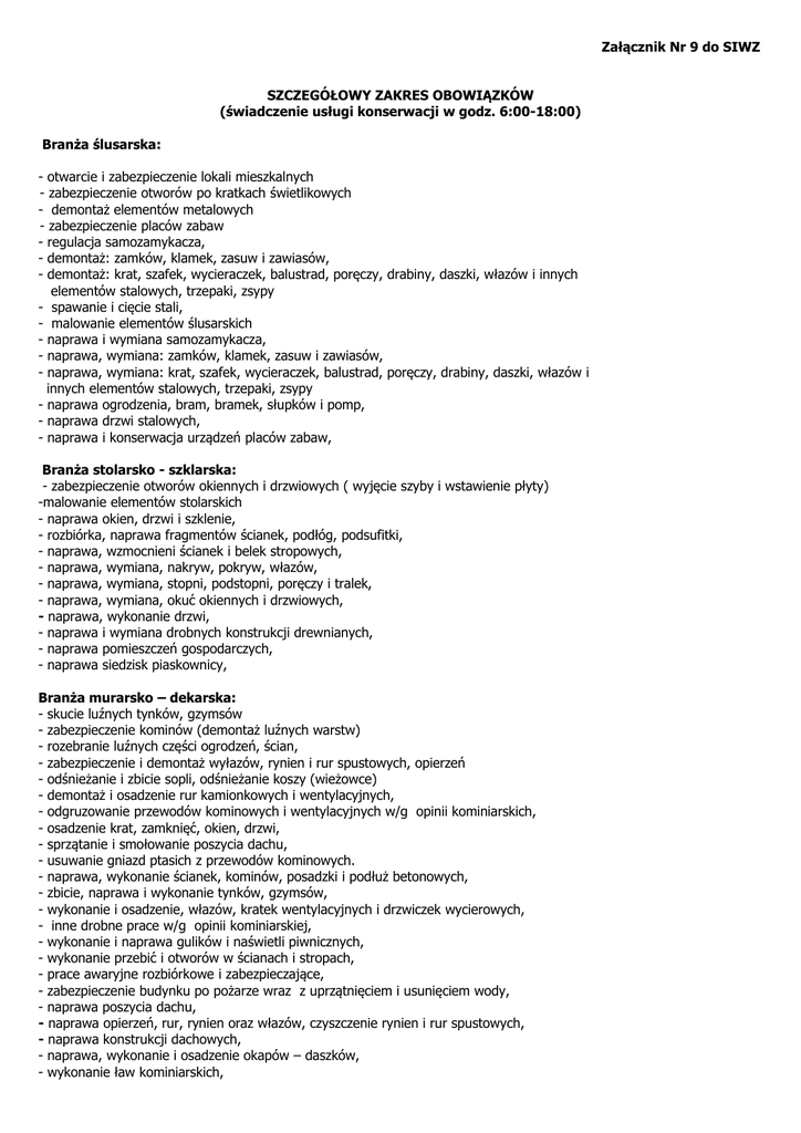 Załącznik Nr 9 do SIWZ SZCZEGÓŁOWY ZAKRES OBOWIĄZKÓW (świadczenie usługi konserwacji w godz. 6:00-18:00) Branża ślusarska: - otwarcie i zabezpieczenie lokali mieszkalnych - zabezpieczenie otworów po kratkach świetlikowych - demontaż elementów metalowych - zabezpieczenie placów zabaw - regulacja samozamykacza, - demontaż: zamków, klamek, zasuw i zawiasów, - demontaż: krat, szafek, wycieraczek, balustrad, poręczy, drabiny, daszki, włazów i innych elementów stalowych, trzepaki, zsypy - spawanie i cięcie stali, - malowanie elementów ślusarskich - naprawa i wymiana samozamykacza, - naprawa, wymiana: zamków, klamek, zasuw i zawiasów, - naprawa, wymiana: krat, szafek, wycieraczek, balustrad, poręczy, drabiny, daszki, włazów i innych elementów stalowych, trzepaki, zsypy - naprawa ogrodzenia, bram, bramek, słupków i pomp, - naprawa drzwi stalowych, - naprawa i konserwacja urządzeń placów zabaw, Branża stolarsko - szklarska: - zabezpieczenie otworów okiennych i drzwiowych ( wyjęcie szyby i wstawienie płyty) -malowanie elementów stolarskich - naprawa okien, drzwi i szklenie, - rozbiórka, naprawa fragmentów ścianek, podłóg, podsufitki, - naprawa, wzmocnieni ścianek i belek stropowych, - naprawa, wymiana, nakryw, pokryw, włazów, - naprawa, wymiana, stopni, podstopni, poręczy i tralek, - naprawa, wymiana, okuć okiennych i drzwiowych, - naprawa, wykonanie drzwi, - naprawa i wymiana drobnych konstrukcji drewnianych, - naprawa pomieszczeń gospodarczych, - naprawa siedzisk piaskownicy, Branża murarsko – dekarska: - skucie luźnych tynków, gzymsów - zabezpieczenie kominów (demontaż luźnych warstw) - rozebranie luźnych części ogrodzeń, ścian, - zabezpieczenie i demontaż wyłazów, rynien i rur spustowych, opierzeń - odśnieżanie i zbicie sopli, odśnieżanie koszy (wieżowce) - demontaż i osadzenie rur kamionkowych i wentylacyjnych, - odgruzowanie przewodów kominowych i wentylacyjnych w/g opinii kominiarskich, - osadzenie krat, zamknięć, okien, drzwi, - sprzątanie i smołowanie poszycia dachu, - usuwanie gniazd ptasich z przewodów kominowych. - naprawa, wykonanie ścianek, kominów, posadzki i podłuż betonowych, - zbicie, naprawa i wykonanie tynków, gzymsów, - wykonanie i osadzenie, włazów, kratek wentylacyjnych i drzwiczek wycierowych, - inne drobne prace w/g opinii kominiarskiej, - wykonanie i naprawa gulików i naświetli piwnicznych, - wykonanie przebić i otworów w ścianach i stropach, - prace awaryjne rozbiórkowe i zabezpieczające, - zabezpieczenie budynku po pożarze wraz z uprzątnięciem i usunięciem wody, - naprawa poszycia dachu, - naprawa opierzeń, rur, rynien oraz włazów, czyszczenie rynien i rur spustowych, - naprawa konstrukcji dachowych, - naprawa, wykonanie i osadzenie okapów – daszków, - wykonanie ław kominiarskich, - brak wentylacji – wyprowadzenie rur dwupłaszczowych - przemurowanie i uzupełnienie ubytków w pionach kominowych ponad dach - przełączenie przewodów na przewód zbiorczy Branża instalacyjna: a) elektryczna - odłączenie i demontaż uszkodzonych przewodów - podłączenie prądu po zdarzeniu losowym - odcięcie zasilania - trwałe odłączenie przewodów w przypadku kradzieży prądu - konserwacja GTR, - konserwacja rozdzielni, WLZ-ów, oświetlenia administracyjnego oraz układu zasilania i sterowania pracą pomp, - konserwacja: zabezpieczeń, tablic, lamp oświetlenia zewnętrznego i żarówek, - konserwacja osprzętu: lampy, puszki, przyciski, wyłączniki, gniazd, automaty schodowe, zmierzchowe, czujki, styczniki, transformatory i ograniczniki mocy, - sprawdzenie instalacji wewnętrznej i mieszkaniowej, - odłączenie nieczynnych przewodów i ich demontaż. - naprawa GTR, - naprawa rozdzielni i WLZ- ty mieszkaniowe i oświetlenia administracyjnego oraz układu zasilania i sterowania pracą pomp, - wymiana: zabezpieczeń, tablic, lamp oświetlenia zewnętrznego i żarówek, - naprawa instalacji: dzwonkowej, odgromowej, oświetlenia administracyjnego i zasilania mieszkań, - wymiana osprzętu: lampy, puszki, przyciski, wyłączniki, gniazd, automaty schodowe, zmierzchowe, czujki, styczniki, transformatory i ograniczniki mocy, b) domofony - naprawa kasety z przyciskami, naprawa instalacji przewodowej, naprawa elektrozaczepu i drzwi, wymiana elektroniki - regulacja głośności, czyszczenie styków, wpięcie, wypięcie lokalu po awarii, regulacja elektrozaczepu, okresowe przeglądy instalacji domofonowej. c) wod-kan i gaz - zlokalizowanie miejsca wycieku - odłączenie i demontaż uszkodzonych przewodów - odcięcie zasilania, - zamknięcie, zakorkowanie + usunięcie przecieku - zabezpieczenie studzienek, włazów, - przepchanie poziomów i pionów kanalizacyjnych - odcięcie gazu (instalacja lub urządzenia w częściach wspólnych) - uzupełnienie uszkodzonych lub skorodowanych elementów mocujących instalację i urządzenia sanitarne, - uzupełnienie miejscowe uszkodzonej izolacji rurociągów - okresowe sprawdzanie prawidłowości wskazań urządzeń pomiarowych, - kontrola pod kątem niebilansującej się wody, - czyszczenie instalacji po awariach sieci wodnej, uszczelnianie cieknących złącz rur kanalizacyjnych, usuwanie innych przecieków z instalacji kanalizacyjnej, - okresowe czyszczenie podejść odpływowych, syfonów, spustów ściekowych, studzienek kanalizacyjnych, rur spustowych i osadników deszczowych, - bieżąca regulacja urządzeń gazowych i ich czyszczenie w pomieszczeniach ogólnodostępnych, - malowanie powłoki rur gazowych w przepisowych kolorach oraz zabezpieczenie instalacji w miejscach kolizyjnych z instalacją wod-kan i c.o., - odłączanie/podłączanie urządzeń gazowych od/do instalacji w przypadku konieczności wymiany jej elementów, - demontaż i montaż elementów instalacji (odwadniacze, wywiewki gazowe) - wymiana zużytej armatury lub jej elementów, - wymiana uszczelnień na złączach lub kształtek wodociągowych nawierzchniowych,