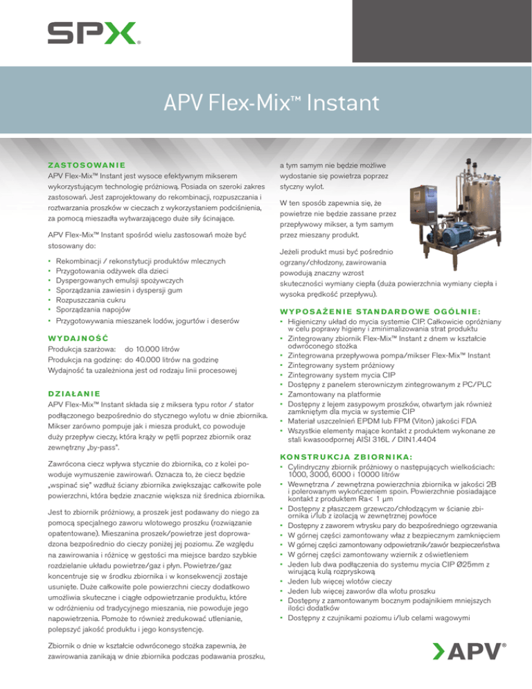 APV Flex-Mix™ Instant Z A S TO S OWA N I E APV Flex-Mix™ Instant jest wysoce efektywnym mikserem wykorzystującym technologię próżniową. Posiada on szeroki zakres zastosowań. Jest zaprojektowany do rekombinacji, rozpuszczania i roztwarzania proszków w cieczach z wykorzystaniem podciśnienia, za pomocą mieszadła wytwarzającego duże siły ścinające. APV Flex-Mix™ Instant spośród wielu zastosowań może być stosowany do: • • • • • • Rekombinacji / rekonstytucji produktów mlecznych Przygotowania odżywek dla dzieci Dyspergowanych emulsji spożywczych Sporządzania zawiesin i dyspersji gum Rozpuszczania cukru Sporządzania napojów • Przygotowywania mieszanek lodów, jogurtów i deserów WYDAJ N OŚ Ć Produkcja szarżowa: do 10.000 litrów Produkcja na godzinę: do 40.000 litrów na godzinę Wydajność ta uzależniona jest od rodzaju linii procesowej D Z IAŁAN I E APV Flex-Mix™ Instant składa się z miksera typu rotor / stator podłączonego bezpośrednio do stycznego wylotu w dnie zbiornika. Mikser zarówno pompuje jak i miesza produkt, co powoduje duży przepływ cieczy, która krąży w pętli poprzez zbiornik oraz zewnętrzny „by-pass”. Zawrócona ciecz wpływa stycznie do zbiornika, co z kolei powoduje wymuszenie zawirowań. Oznacza to, że ciecz będzie „wspinać się” wzdłuż ściany zbiornika zwiększając całkowite pole powierzchni, która będzie znacznie większa niż średnica zbiornika. Jest to zbiornik próżniowy, a proszek jest podawany do niego za pomocą specjalnego zaworu wlotowego proszku (rozwiązanie opatentowane). Mieszanina proszek/powietrze jest doprowadzona bezpośrednio do cieczy poniżej jej poziomu. Ze względu na zawirowania i różnicę w gęstości ma miejsce bardzo szybkie rozdzielanie układu powietrze/gaz i płyn. Powietrze/gaz koncentruje się w środku zbiornika i w konsekwencji zostaje usunięte. Duże całkowite pole powierzchni cieczy dodatkowo umożliwia skuteczne i ciągłe odpowietrzanie produktu, które w odróżnieniu od tradycyjnego mieszania, nie powoduje jego napowietrzenia. Pomoże to również zredukować utlenianie, polepszyć jakość produktu i jego konsystencję. Zbiornik o dnie w kształcie odwróconego stożka zapewnia, że zawirowania zanikają w dnie zbiornika podczas podawania proszku, a tym samym nie będzie możliwe wydostanie się powietrza poprzez styczny wylot. W ten sposób zapewnia się, że powietrze nie będzie zassane przez przepływowy mikser, a tym samym przez mieszany produkt. Jeżeli produkt musi być pośrednio ogrzany/chłodzony, zawirowania powodują znaczny wzrost skuteczności wymiany ciepła (duża powierzchnia wymiany ciepła i wysoka prędkość przepływu). W Y P O S A Ż E N I E S TA N D A R D O W E O G Ó L N I E : • Higieniczny układ do mycia systemie CIP. Całkowicie opróżniany w celu poprawy higieny i zminimalizowania strat produktu • Zintegrowany zbiornik Flex-Mix™ Instant z dnem w kształcie odwróconego stożka • Zintegrowana przepływowa pompa/mikser Flex-Mix™ Instant • Zintegrowany system próżniowy • Zintegrowany system mycia CIP • Dostępny z panelem sterowniczym zintegrowanym z PC/PLC • Zamontowany na platformie • Dostępny z lejem zasypowym proszków, otwartym jak również zamkniętym dla mycia w systemie CIP • Materiał uszczelnień EPDM lub FPM (Viton) jakości FDA • Wszystkie elementy mające kontakt z produktem wykonane ze stali kwasoodpornej AISI 316L / DIN1.4404 KO N S T R U KC J A Z B I O R N I K A : • Cylindryczny zbiornik próżniowy o następujących wielkościach: 1000, 3000, 6000 i 10000 litrów • Wewnętrzna / zewnętrzna powierzchnia zbiornika w jakości 2B i polerowanym wykończeniem spoin. Powierzchnie posiadające kontakt z produktem Ra< 1 μm • Dostępny z płaszczem grzewczo/chłodzącym w ścianie zbiornika i/lub z izolacją w zewnętrznej powłoce • Dostępny z zaworem wtrysku pary do bezpośredniego ogrzewania • W górnej części zamontowany właz z bezpiecznym zamknięciem • W górnej części zamontowany odpowietrznik/zawór bezpieczeństwa • W górnej części zamontowany wziernik z oświetleniem • Jeden lub dwa podłączenia do systemu mycia CIP Ø25mm z wirującą kulą rozpryskową • Jeden lub więcej wlotów cieczy • Jeden lub więcej zaworów dla wlotu proszku • Dostępny z zamontowanym bocznym podajnikiem mniejszych ilości dodatków • Dostępny z czujnikami poziomu i/lub celami wagowymi P R Z E P ŁY WOW Y M I K S E R / P O M PA • Dwie wielkości rotorów o średnicach Ø250mm, Ø350mm • Bezpośrednio zamontowany silnik (zwarta zabudowa) całkowicie zabudowany, wg standardu IEC lub NEMA, IP55, okryty płaszczem ze stali kwasoodpornej, 4 lub 6 biegunowy • Podwójne mechaniczne płukane uszczelnienie z uszczelkami typu o-ring węglik krzemu/grafit (SiC/C) lub alternatywnie węglik krzemu/węglik krzemu (SiC/SiC) • Dostępny z wirnikiem wstępnym • Kilka rodzajów pierścieni statora SYS T E M P R Ó Ż N I O W Y • Jedna lub dwie pompy próżniowe ze stali kwasoodpornej lub tworzywa sztucznego, odpornego na środki CIP • Bezpośrednio zamontowany silnik (zwarta zabudowa) całkowicie zabudowany, wg standardu IEC lub NEMA, IP55, 4 lub 6 biegunowy • Z separatorem wody do ponownego użycia wody serwisowej • Z zaworem regulacyjnym zapewniającym utrzymanie po-ziomu próżni S Z A FA S T E R U J ĄCA • Dostępny z następującymi systemami kontrolnymi PLC/PC: • PLC - przekaźnikowe sterowanie szarżą produkcyjną • PLC/PC sterowanie szarżą produkcyjną • PLC/PC - sterowanie półautomatyczne • PLC/PC - sterowanie automatyczne • Dostępny z panelami operacyjnymi Wonderware lub Siemens • Z szafą stycznikową (MCC), z lub bez przetwornicy częstotliwości DA N E T E C H N I C Z N E I N STA N T - 10 0 0 - 2 5 0 10 0 0 I N STA N T - 2 0 0 0 - 2 5 0 2000 I N STA N T - 3 0 0 0 - 2 5 0 3000 I N STA N T - 3 0 0 0 - 3 5 0 I N STA N T - 6 0 0 0 - 