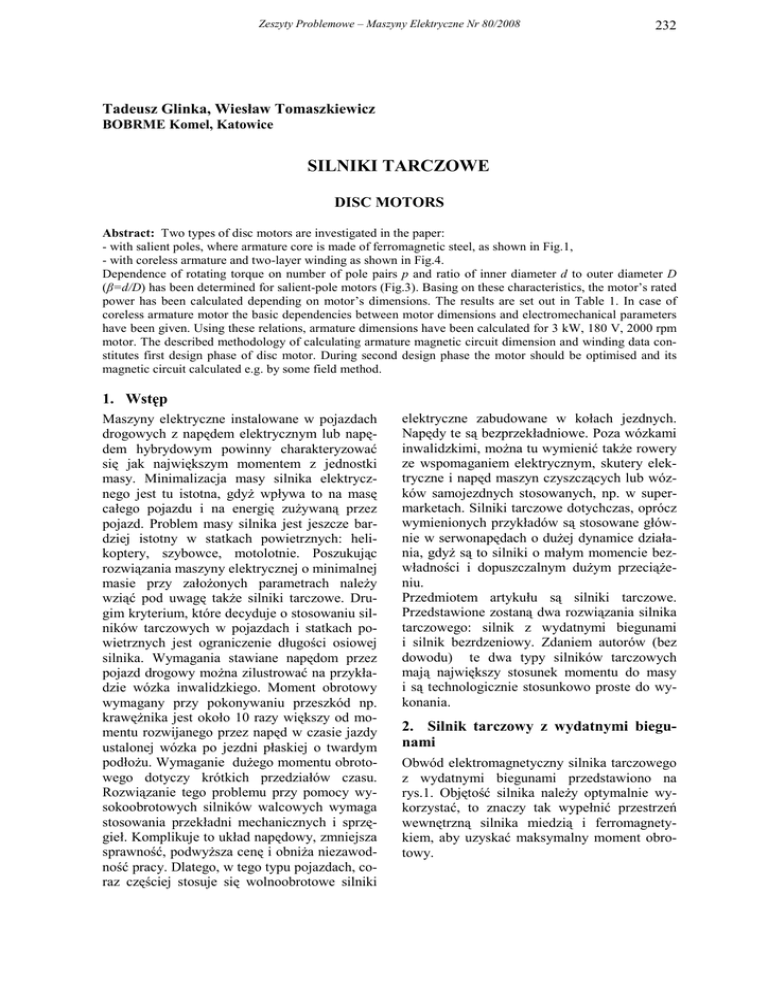 Zeszyty Problemowe – Maszyny Elektryczne Nr 80/2008 232 Tadeusz Glinka, Wiesław Tomaszkiewicz BOBRME Komel, Katowice SILNIKI TARCZOWE DISC MOTORS Abstract: Two types of disc motors are investigated in the paper: - with salient poles, where armature core is made of ferromagnetic steel, as shown in Fig.1, - with coreless armature and two-layer winding as shown in Fig.4. Dependence of rotating torque on number of pole pairs p and ratio of inner diameter d to outer diameter D (β=d/D) has been determined for salient-pole motors (Fig.3). Basing on these characteristics, the motor’s rated power has been calculated depending on motor’s dimensions. The results are set out in Table 1. In case of coreless armature motor the basic dependencies between motor dimensions and electromechanical parameters have been given. Using these relations, armature dimensions have been calculated for 3 kW, 180 V, 2000 rpm motor. The described methodology of calculating armature magnetic circuit dimension and winding data constitutes first design phase of disc motor. During second design phase the motor should be optimised and its magnetic circuit calculated e.g. by some field method. 1. Wstęp Maszyny elektryczne instalowane w pojazdach drogowych z napędem elektrycznym lub napędem hybrydowym powinny charakteryzować się jak największym momentem z jednostki masy. Minimalizacja masy silnika elektrycznego jest tu istotna, gdyż wpływa to na masę całego pojazdu i na energię zużywaną przez pojazd. Problem masy silnika jest jeszcze bardziej istotny w statkach powietrznych: helikoptery, szybowce, motolotnie. Poszukując rozwiązania maszyny elektrycznej o minimalnej masie przy założonych parametrach należy wziąć pod uwagę także silniki tarczowe. Drugim kryterium, które decyduje o stosowaniu silników tarczowych w pojazdach i statkach powietrznych jest ograniczenie długości osiowej silnika. Wymagania stawiane napędom przez pojazd drogowy można zilustrować na przykładzie wózka inwalidzkiego. Moment obrotowy wymagany przy pokonywaniu przeszkód np. krawężnika jest około 10 razy większy od momentu rozwijanego przez napęd w czasie jazdy ustalonej wózka po jezdni płaskiej o twardym podłożu. Wymaganie dużego momentu obrotowego dotyczy krótkich przedziałów czasu. Rozwiązanie tego problemu przy pomocy wysokoobrotowych silników walcowych wymaga stosowania przekładni mechanicznych i sprzęgieł. Komplikuje to układ napędowy, zmniejsza sprawność, podwyższa cenę i obniża niezawodność pracy. Dlatego, w tego typu pojazdach, coraz częściej stosuje się wolnoobrotowe silniki elektryczne zabudowane w kołach jezdnych. Napędy te są bezprzekładniowe. Poza wózkami inwalidzkimi, można tu wymienić także rowery ze wspomaganiem elektrycznym, skutery elektryczne i napęd maszyn czyszczących lub wózków samojezdnych stosowanych, np. w supermarketach. Silniki tarczowe dotychczas, oprócz wymienionych przykładów są stosowane głównie w serwonapędach o dużej dynamice działania, gdyż są to silniki o małym momencie bezwładności i dopuszczalnym dużym przeciążeniu. Przedmiotem artykułu są silniki tarczowe. Przedstawione zostaną dwa rozwiązania silnika tarczowego: silnik z wydatnymi biegunami i silnik bezrdzeniowy. Zdaniem autorów (bez dowodu) te dwa typy silników tarczowych mają największy stosunek momentu do masy i są technologicznie stosunkowo proste do wykonania. 2. Silnik tarczowy z wydatnymi biegunami Obwód elektromagnetyczny silnika tarczowego z wydatnymi biegunami przedstawiono na rys.1. Objętość silnika należy optymalnie wykorzystać, to znaczy tak wypełnić przestrzeń wewnętrzną silnika miedzią i ferromagnetykiem, aby uzyskać maksymalny moment obrotowy. Zeszyty Problemowe – Maszyny Elektryczne Nr 80/2008 232 Rys. 1. Silnik tarczowy z wydatnymi biegunami: a – widok bieguna twornika od strony szczeliny powietrznej, b – przekrój w płaszczyźnie osiowej, c – kształt jednej blachy Powstają zatem pytania: • ile silnik powinien mieć par biegunów p=?, • jak podzielić powierzchnię przyszczelinową bieguna na uzwojenie i rdzeń. Odpowiedź na te pytania dadzą obliczenia w oparciu o model matematyczny silnika. Aby moment elektromagnetyczny silnika w każdym położeniu wirnika był różny od zera silnik musi składać się przynajmniej z dwóch pasm uzwojeń. Zakłada się, że silnik składa się z dwóch plastrów: lewego i prawego, jak to pokazano na rys.1. Uzwojenie biegunów lewego plastra tworzą jedno pasmo uzwojenia, a uzwojenia biegunów prawego plastra tworzą drugie pasmo uzwojenia. Wartość średnia momentu elektromagnetycznego T generowana przez jedno pasmo uzwojenia: T= P ωm =p P ω (1) gdzie: P - moc średnia , ωm , ω - prędkość kątowa wirnika i pulsacja napięcia twornika, p liczba par biegunów uzwojenia. Załóżmy, że strumień magnetyczny φ (t) sprzęgający się z uzwojeniem i prąd w uzwojeniu zmieniają się sinusoidalnie φ (t ) = φ sin ωt i (t ) = 2 I sin(ωt − ϕ ) π Przy czym ϕ = 2 (2) , gdyż to determinuje war- tość maksymalną momentu i taką wartość kąta φ układ komutatora elektronicznego może realizować. Napięcie rotacji indukowane w jednej cewce bieguna o liczbie zwojów z dφ e=z = zωφ cos ωt = 2 E cos ωt (3) dt Wartość średnia mocy elektromagnetycznej jednego pasma uzwojenia P = 2 pEI = 2 pzωφI (4) Przy czym: φ = BS Fe ; I = jSCu , gdzie: B - indukcja magnetyczna w szczelinie pod rdzeniem bieguna, j - gęstość prądu, S Fe , S Cu - przekrój bieguna rdzenia i przekrój przewodu uzwojenia. Podstawiając zależność (4) do równania (1) otrzymuje się T = 2 p 2 jB( zS Cu ) S Fe (5) Zeszyty Problemowe – Maszyny Elektryczne Nr 80/2008 Poszukując optymalnego przekroju bieguna S Fe zakłada się B = const., j = const., gdyż 232 Wartość maksymalną powierzchni S Fe otrzyma się przy biegunie trójkątnym (rys.2). są to parametry niezależne od S Fe . b a Fe a a 