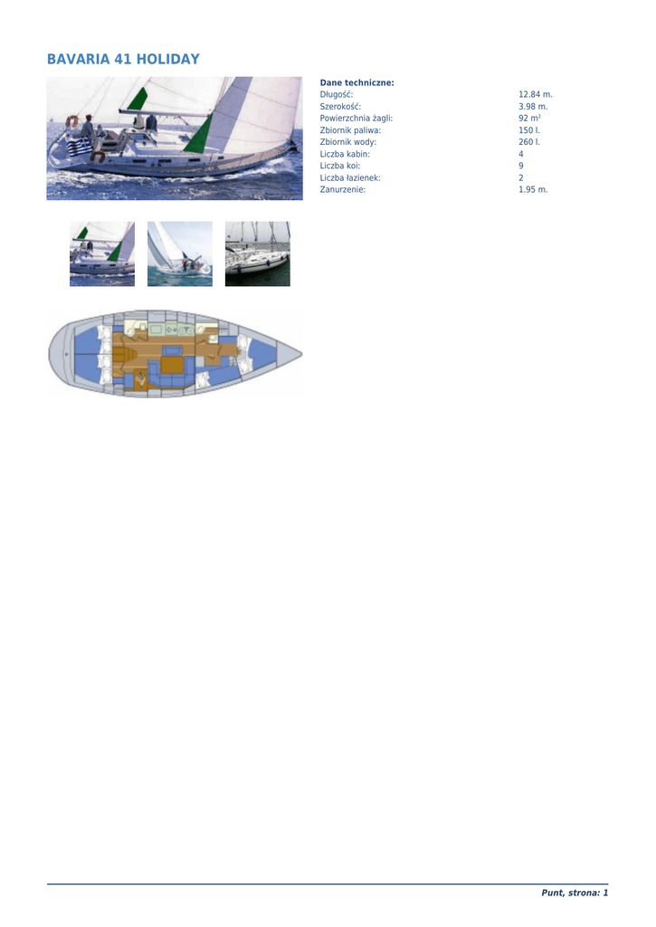 BAVARIA 41 HOLIDAY Dane techniczne: Długość: Szerokość: Powierzchnia żagli: Zbiornik paliwa: Zbiornik wody: Liczba kabin: Liczba koi: Liczba łazienek: Zanurzenie: 12.84 m. 3.98 m. 92 m2 150 l. 260 l. 4 9 2 1.95 m. Punt, strona: 1