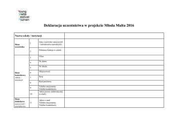 Deklaracja uczestnictwa w projekcie Młoda Malta 2016 Nazwa szkoły / instytucji Dane uczestnika 1 2 3 4 5 Dane kontaktowe szkoły / instytucji 6 7 8 9 10 Dane dodatkowe nauczycieli / instruktorów 11 Imię i nazwisko nauczycieli / instruktorów teatralnych) Pełniona funkcja w szkole Ulica Nr domu Nr lokalu Miejscowość Kraj Kod pocztowy Telefon stacjonarny Telefon komórkowy Adres poczty elektronicznej (e-mail) Adres e-mail Telefon stacjonarny Telefon komórkowy Oświadczenie dyrektora szkoły / instytucji 1. Zgadzam się na udział grupy teatralnej _________________________________________________________________ , reprezentującej szkołę / instytucję ______________________________________________________________________w projekcie Młoda Malta 2016. 2. Oświadczam, iż podane wyżej dane są zgodne z prawdą. 3. Wyrażam zgodę na przetwarzanie danych szkoły / instytucji, którą reprezentuję. 4. Oświadczam, iż grupa teatralna ____________________________________________________________________________________ reprezentująca szkołę / instytucję_______________________________________________________________________spełnia warunki kwalifikujące do udziału w projekcie zgodnie z regulaminem projektu Młoda Malta 2016. data i podpis dyrektora szkoły / instytucji pieczęć szkoły / instytucji Zgoda na przetwarzanie danych osobowych uczestnika projektu Młoda Malta 2016 Wyrażam zgodę na przetwarzanie moich danych osobowych w celach informacyjnych i promocyjnych w ramach projektu Młoda Malta 2016. data i podpis uczestnika __________________________________