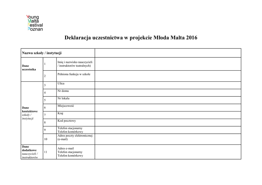 Deklaracja uczestnictwa w projekcie Młoda Malta 2016