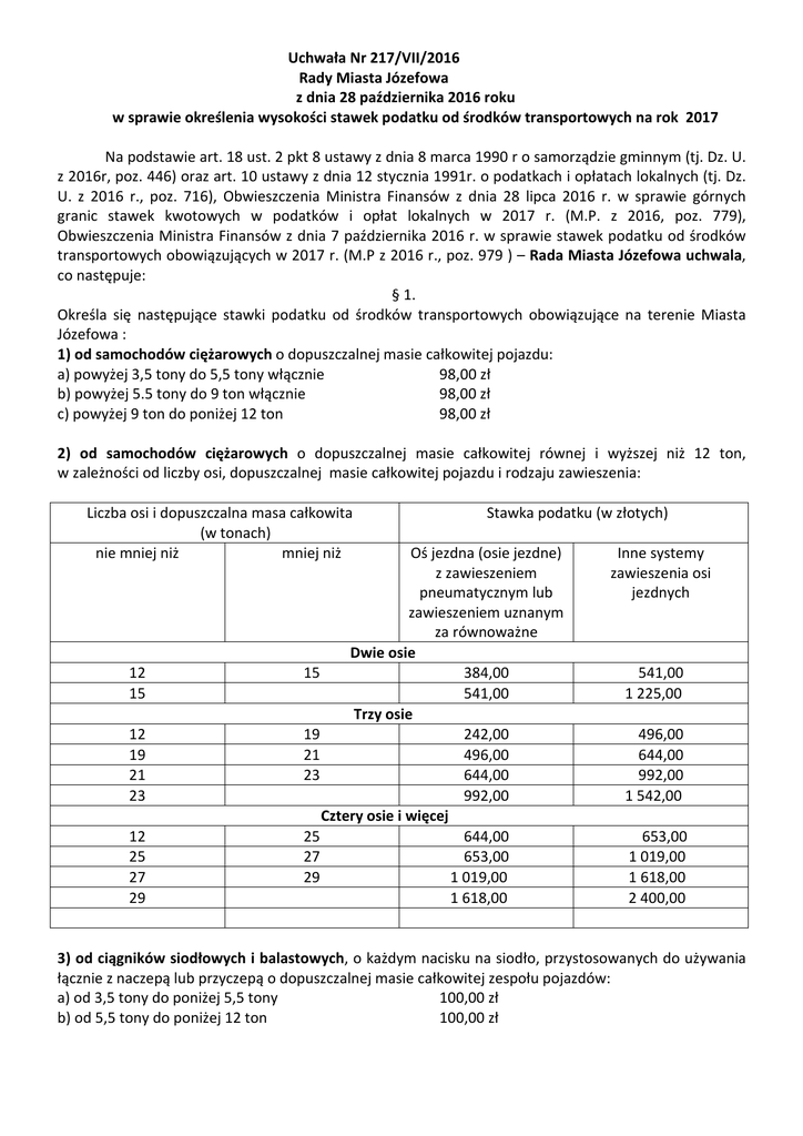 Uchwała Nr 217/VII/2016 Rady Miasta Józefowa z dnia 28 października 2016 roku w sprawie określenia wysokości stawek podatku od środków transportowych na rok 2017 Na podstawie art. 18 ust. 2 pkt 8 ustawy z dnia 8 marca 1990 r o samorządzie gminnym (tj. Dz. U. z 2016r, poz. 446) oraz art. 10 ustawy z dnia 12 stycznia 1991r. o podatkach i opłatach lokalnych (tj. Dz. U. z 2016 r., poz. 716), Obwieszczenia Ministra Finansów z dnia 28 lipca 2016 r. w sprawie górnych granic stawek kwotowych w podatków i opłat lokalnych w 2017 r. (M.P. z 2016, poz. 779), Obwieszczenia Ministra Finansów z dnia 7 października 2016 r. w sprawie stawek podatku od środków transportowych obowiązujących w 2017 r. (M.P z 2016 r., poz. 979 ) – Rada Miasta Józefowa uchwala, co następuje: § 1. Określa się następujące stawki podatku od środków transportowych obowiązujące na terenie Miasta Józefowa : 1) od samochodów ciężarowych o dopuszczalnej masie całkowitej pojazdu: a) powyżej 3,5 tony do 5,5 tony włącznie 98,00 zł b) powyżej 5.5 tony do 9 ton włącznie 98,00 zł c) powyżej 9 ton do poniżej 12 ton 98,00 zł 2) od samochodów ciężarowych o dopuszczalnej masie całkowitej równej i wyższej niż 12 ton, w zależności od liczby osi, dopuszczalnej masie całkowitej pojazdu i rodzaju zawieszenia: Liczba osi i dopuszczalna masa całkowita (w tonach) nie mniej niż mniej niż 12 15 12 19 21 23 12 25 27 29 Stawka podatku (w złotych) Oś jezdna (osie jezdne) z zawieszeniem pneumatycznym lub zawieszeniem uznanym za równoważne Dwie osie 15 384,00 541,00 Trzy osie 19 242,00 21 496,00 23 644,00 992,00 Cztery osie i więcej 25 644,00 27 653,00 29 1 019,00 1 618,00 Inne systemy zawieszenia osi jezdnych 541,00 1 225,00 496,00 644,00 992,00 1 542,00 653,00 1 019,00 1 618,00 2 400,00 3) od ciągników siodłowych i balastowych, o każdym nacisku na siodło, przystosowanych do używania łącznie z naczepą lub przyczepą o dopuszczalnej masie całkowitej zespołu pojazdów: a) od 3,5 tony do poniżej 5,5 tony 100,00 zł b) od 5,5 tony do poniżej 12 ton 100,00 zł 4) od ciągników siodłowych i balastowych przystosowanych do używania łącznie z naczepą lub przyczepą o dopuszczalnej masie całkowitej zespołu pojazdów równej lub wyższej niż 12 ton, w zależności od liczby osi, dopuszczalnej masy całkowitej zespołu pojazdów i rodzaju zawieszenia : Liczba osi i dopuszczalna masa całkowita zespołu pojazdów: ciągnik siodłowy + naczepa, ciągnik balastowy + przyczepa (w tonach) nie mniej niż mniej niż 12 18 25 31 18 25 31 12 40 40 Stawka podatku (w złotych) Oś jezdna (osie jezdne) z zawieszeniem pneumatycznym lub zawieszeniem uznanym za równoważne Dwie osie 260,00 260,00 548,00 1 382,00 Trzy osie i więcej 1 219,00 1 685,00 Inne systemy zawieszenia osi jezdnych 260,00 470,00 899,00 1 895,00 1 685,00 2 493,00 5) od przyczep i naczep, które łącznie z pojazdem silnikowym posiadają dopuszczalną masę całkowitą od 7 ton i poniżej 12 ton, z wyjątkiem związanych wyłącznie z działalnością rolniczą prowadzoną przez podatnika podatku rolnego: 100,00 zł 6) od przyczep i naczep, które łącznie z pojazdem silnikowym posiadają dopuszczalną masę całkowitą równą lub wyższą niż 12 ton, z wyjątkiem związanych wyłącznie z działalnością rolniczą prowadzoną przez podatnika podatku rolnego, w zależności od liczby osi, dopuszczalnej masy całkowitej zespołu pojazdów i rodzaju zawieszenia: Liczba osi i dopuszczalna masa całkowita zespołu pojazdów: naczepa/przyczepa + pojazd silnikowy (w tonach) nie mniej niż mniej niż Stawka podatku (w złotych) Oś jezdna (osie jezdne) z zawieszeniem pneumatycznym lub zawieszeniem uznanym za równoważne Inne systemy zawieszenia osi jezdnych 174,00 313,00 549,00 313,00 549,00 549,00 206,00 600,00 832,00 1 124,00 Trzy osie i więcej 662,00 922,00 303,00 832,00 1 263,00 1 663,00 Jedna oś 12 25 37 25 37 Dwie osie 12 28 33 38 28 33 38 12 38 38 922,00 1 253,00 7) od autobusów, od ilości miejsc do siedzenia poza miejscem kierowcy: a) mniejszej niż 22 miejsca 300,00 zł b) równej lub większej niż 22 miejsca 500,00 zł § 2. Wykonanie uchwały powierza się Burmistrzowi Miasta Józefowa. § 3. Uchwała podlega ogłoszeniu w Dzienniku Urzędowym Województwa Mazowieckiego, i wchodzi w życie z dniem 01 stycznia 2017 r. Przewodniczący Rady Miasta Józefowa Cezary Łukaszewski Uzasadnienie Przy opracowywaniu propozycji stawek podatku od środków transportowych na 2017 rok przyjęto wysokość stawek minimalnych - zaokrąglonych do pełnych złotych, określonych w Obwieszczeniu Ministra Finansów z dnia 7 października 2016 r. (M.P. z 2016 poz. 979). Propozycja przyjęcia stawek minimalnych podyktowana jest chęcią stworzenia korzystnych warunków dla potencjalnych przedsiębiorców. Przewodniczący Rady Miasta Józefowa Cezary Łukaszewski