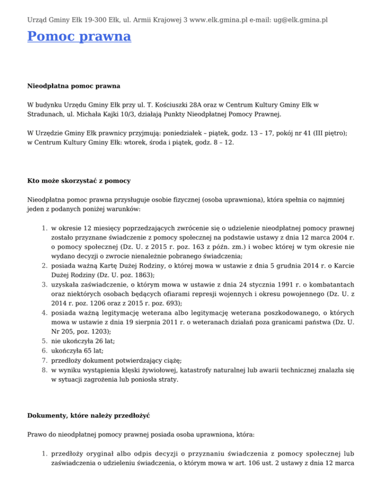 Urząd Gminy Ełk 19-300 Ełk, ul. Armii Krajowej 3 www.elk.gmina.pl e-mail: [email protected] Pomoc prawna Nieodpłatna pomoc prawna W budynku Urzędu Gminy Ełk przy ul. T. Kościuszki 28A oraz w Centrum Kultury Gminy Ełk w Stradunach, ul. Michała Kajki 10/3, działają Punkty Nieodpłatnej Pomocy Prawnej. W Urzędzie Gminy Ełk prawnicy przyjmują: poniedziałek – piątek, godz. 13 – 17, pokój nr 41 (III piętro); w Centrum Kultury Gminy Ełk: wtorek, środa i piątek, godz. 8 – 12. Kto może skorzystać z pomocy Nieodpłatna pomoc prawna przysługuje osobie fizycznej (osoba uprawniona), która spełnia co najmniej jeden z podanych poniżej warunków: 1. w okresie 12 miesięcy poprzedzających zwrócenie się o udzielenie nieodpłatnej pomocy prawnej zostało przyznane świadczenie z pomocy społecznej na podstawie ustawy z dnia 12 marca 2004 r. o pomocy społecznej (Dz. U. z 2015 r. poz. 163 z późn. zm.) i wobec której w tym okresie nie wydano decyzji o zwrocie nienależnie pobranego świadczenia; 2. posiada ważną Kartę Dużej Rodziny, o której mowa w ustawie z dnia 5 grudnia 2014 r. o Karcie Dużej Rodziny (Dz. U. poz. 1863); 3. uzyskała zaświadczenie, o którym mowa w ustawie z dnia 24 stycznia 1991 r. o kombatantach oraz niektórych osobach będących ofiarami represji wojennych i okresu powojennego (Dz. U. z 2014 r. poz. 1206 oraz z 2015 r. poz. 693); 4. posiada ważną legitymację weterana albo legitymację weterana poszkodowanego, o których mowa w ustawie z dnia 19 sierpnia 2011 r. o weteranach działań poza granicami państwa (Dz. U. Nr 205, poz. 1203); 5. nie ukończyła 26 lat; 6. ukończyła 65 lat; 7. przedłoży dokument potwierdzający ciążę; 8. w wyniku wystąpienia klęski żywiołowej, katastrofy naturalnej lub awarii technicznej znalazła się w sytuacji zagrożenia lub poniosła straty. Dokumenty, które należy przedłożyć Prawo do nieodpłatnej pomocy prawnej posiada osoba uprawniona, która: 1. przedłoży oryginał albo odpis decyzji o przyznaniu świadczenia z pomocy społecznej lub zaświadczenia o udzieleniu świadczenia, o którym mowa w art. 106 ust. 2 ustawy z dnia 12 marca Urząd Gminy Ełk 19-300 Ełk, ul. Armii Krajowej 3 www.elk.gmina.pl e-mail: [email protected] 2004 r. o pomocy społecznej; 2. przedłoży ważną Kartę Dużej Rodziny, o której mowa w ustawie z dnia 5 grudnia 2014 r. o Karcie Dużej Rodziny; 3. przedłoży zaświadczenie, o którym mowa w ustawie z dnia 24 stycznia 1991 r. o kombatantach oraz niektórych osobach będących ofiarami represji wojennych i okresu powojennego; 4. przedłoży ważną legitymację weterana albo legitymację weterana poszkodowanego, o których mowa w ustawie z dnia 19 sierpnia 2011 r. o weteranach działań poza granicami państwa; 5. przedłoży dokument stwierdzający tożsamość; 6. przedłoży dokument potwierdzający ciążę; 7. złoży oświadczenie, że z uwagi na sytuację kryzysową lub zdarzenie losowe nie jest w stanie przedstawić dokumentów, wymienionych w pkt 1-6. Należy złożyć oświadczenie Osoba uprawniona, przed uzyskaniem nieodpłatnej pomocy prawnej składa pisemne oświadczenie, że nie wydano wobec niej decyzji o zwrocie nienależnie pobranego świadczenia z pomocy społecznej (dotyczy tylko osób korzystających z pomocy społecznej). Osoba uprawniona, wymagająca niezwłocznego uzyskania nieodpłatnej pomocy prawnej w przypadku sytuacji kryzysowej lub zdarzenia losowego składa pisemne oświadczenie, że jest ona uprawniona do jej uzyskania i z uwagi na sytuację kryzysową lub zdarzenie losowe nie jest w stanie przedstawić w/w dokumentów( pkt 1-6). Nieodpłatna pomoc prawna obejmuje 1. poinformowanie osoby uprawnionej o obowiązującym stanie prawnym, o przysługujących jej uprawnieniach lub o spoczywających na niej obowiązkach; 2. wskazanie osobie uprawnionej sposobu rozwiązania jej problemu prawnego; 3. udzielenie pomocy w sporządzeniu projektu pisma w sprawach, o których mowa w pkt 1 i 2, z wyłączeniem pism procesowych w toczącym się postępowaniu przygotowawczym lub sądowym i pism w toczącym się postępowaniu sądowo-administracyjnym; 4. sporządzenie projektu pisma o zwolnienie od kosztów sądowych lub ustanowienie pełnomocnika z urzędu w postępowaniu sądowym lub ustanowienie adwokata, radcy prawnego, doradcy podatkowego lub rzecznika patentowego w postępowaniu sądowo-administracyjnym. Nieodpłatna pomoc prawna nie obejmuje spraw 1. podatkowych związanych z prowadzeniem działalności gospodarczej; 2. z zakresu prawa celnego, dewizowego i handlowego; 3. związanych z prowadzeniem działalności gospodarczej, z wyjątkiem przygotowania do Urząd Gminy Ełk 19-300 Ełk, ul. Armii Krajowej 3 www.elk.gmina.pl e-mail: [email protected] rozpoczęcia tej działalności. Wszystkie punkty nieodpłatnej pomocy prawnej na obszarze Powiatu Ełckiego Ełk, ul. Małeckich 3/28 – pomoc świadczona przez radców prawnych zgłoszonych przez Okręgową Izbę Radców Prawnych w Białymstoku, poniedziałek – piątek, godz. 10 – 14; Ełk, ul. Kościuszki 28 A – pomoc świadczona przez adwokatów zgłoszonych przez Okręgową Radę Adwokacką w Białymstoku, poniedziałek – piątek , godz. 13 – 17; Stare Juchy, ul. Ełcka 8 (Biblioteka Centrum Kultury i Informacji) – pomoc świadczona przez radców prawnych z Fundacji HONESTE VIVERE z Warszawy, poniedziałek i czwartek, godz. 9 – 13; Straduny, ul. Michała Kajki 10/3 (Centrum Kultury Gminy Ełk) – pomoc świadczona przez radców prawnych z Fundacji HONESTE VIVERE z Warszawy, wtorek, środa i piątek, godz. 8 – 12; Kalinowo, ul. Szkolna 1 (Ośrodek Zdrowia) – pomoc świadczona przez radców prawnych z Fundacji HONESTE VIVERE z Warszawy, wtorek, środa i piątek, godz. 8 – 12; Prostki, ul. 1 Maja 44 B (Urząd Gminy)- pomoc świadczona przez radców prawnych z Fundacji HONESTE VIVERE z Warszawy, poniedziałek i czwartek w godzinach 8 – 12. Urząd Gminy Ełk 19-300 Ełk, ul