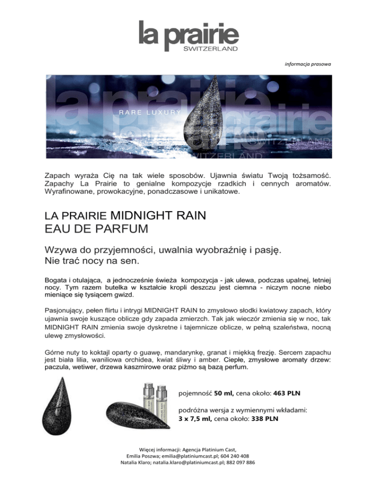 informacja prasowa Zapach wyraża Cię na tak wiele sposobów. Ujawnia światu Twoją tożsamość. Zapachy La Prairie to genialne kompozycje rzadkich i cennych aromatów. Wyrafinowane, prowokacyjne, ponadczasowe i unikatowe. LA PRAIRIE MIDNIGHT RAIN EAU DE PARFUM Wzywa do przyjemności, uwalnia wyobraźnię i pasję. Nie trać nocy na sen. Bogata i otulająca, a jednocześnie świeża kompozycja - jak ulewa, podczas upalnej, letniej nocy. Tym razem butelka w kształcie kropli deszczu jest ciemna - niczym nocne niebo mieniące się tysiącem gwizd. Pasjonujący, pełen flirtu i intrygi MIDNIGHT RAIN to zmysłowo słodki kwiatowy zapach, który ujawnia swoje kuszące oblicze gdy zapada zmierzch. Tak jak wieczór zmienia się w noc, tak MIDNIGHT RAIN zmienia swoje dyskretne i tajemnicze oblicze, w pełną szaleństwa, nocną ulewę zmysłowości. Górne nuty to koktajl oparty o guawę, mandarynkę, granat i miękką frezję. Sercem zapachu jest biała lilia, waniliowa orchidea, kwiat śliwy i amber. Ciepłe, zmysłowe aromaty drzew: paczula, wetiwer, drzewa kaszmirowe oraz piżmo są bazą perfum. pojemność 50 ml, cena około: 463 PLN podróżna wersja z wymiennymi wkładami: 3 x 7,5 ml, cena około: 338 PLN Więcej informacji: Agencja Platinium Cast, Emilia Poszwa; [email protected]; 604 240 408 Natalia Klaro; [email protected]; 882 097 886
