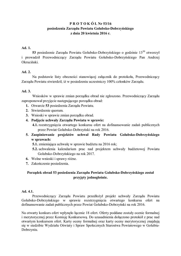 P R O T O K Ó Ł Nr 53/16 posiedzenia Zarządu Powiatu Golubsko