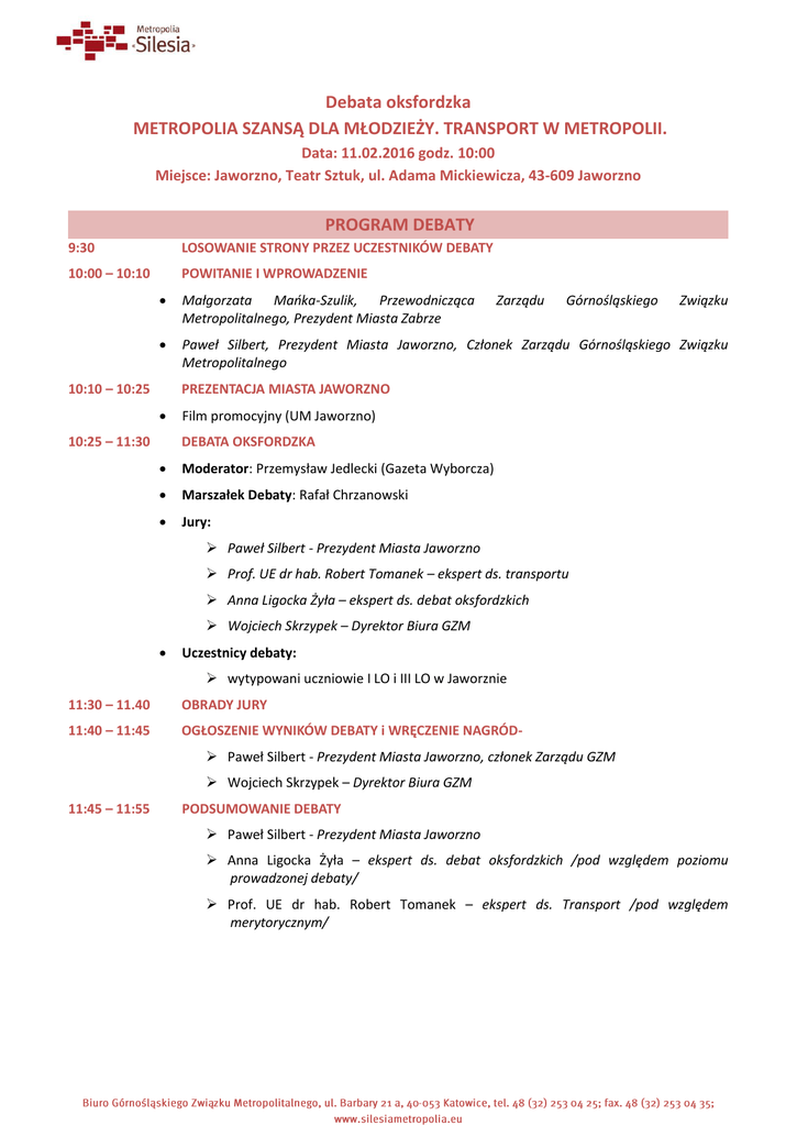 Debata oksfordzka METROPOLIA SZANSĄ DLA MŁODZIEŻY. TRANSPORT W METROPOLII. Data: 11.02.2016 godz. 10:00 Miejsce: Jaworzno, Teatr Sztuk, ul. Adama Mickiewicza, 43-609 Jaworzno PROGRAM DEBATY 9:30 LOSOWANIE STRONY PRZEZ UCZESTNIKÓW DEBATY 10:00 – 10:10 POWITANIE I WPROWADZENIE Małgorzata Mańka-Szulik, Przewodnicząca Metropolitalnego, Prezydent Miasta Zabrze Paweł Silbert, Prezydent Miasta Jaworzno, Członek Zarządu Górnośląskiego Związku Metropolitalnego 10:10 – 10:25 Zarządu Górnośląskiego Związku PREZENTACJA MIASTA JAWORZNO 10:25 – 11:30 Film promocyjny (UM Jaworzno) DEBATA OKSFORDZKA Moderator: Przemysław Jedlecki (Gazeta Wyborcza) Marszałek Debaty: Rafał Chrzanowski Jury: Paweł Silbert - Prezydent Miasta Jaworzno Prof. UE dr hab. Robert Tomanek – ekspert ds. transportu Anna Ligocka Żyła – ekspert ds. debat oksfordzkich Wojciech Skrzypek – Dyrektor Biura GZM Uczestnicy debaty: wytypowani uczniowie I LO i III LO w Jaworznie 11:30 – 11.40 OBRADY JURY 11:40 – 11:45 OGŁOSZENIE WYNIKÓW DEBATY i WRĘCZENIE NAGRÓD Paweł Silbert - Prezydent Miasta Jaworzno, członek Zarządu GZM Wojciech Skrzypek – Dyrektor Biura GZM 11:45 – 11:55 PODSUMOWANIE DEBATY Paweł Silbert - Prezydent Miasta Jaworzno Anna Ligocka Żyła – ekspert ds. debat oksfordzkich /pod względem poziomu prowadzonej debaty/ Prof. UE dr hab. Robert Tomanek – ekspert ds. Transport /pod względem merytorycznym/ DOJAZD Teatr Sztuk, ul. Adama Mickiewicza, 43-609 Jaworzno