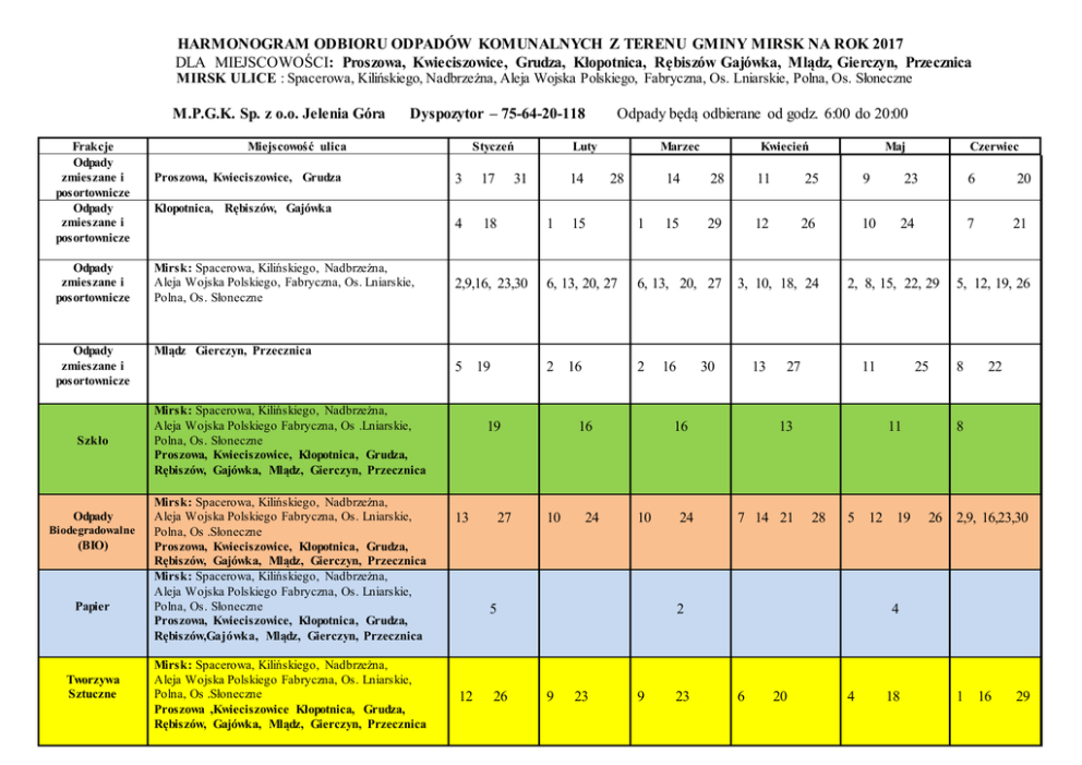 HARMONOGRAM ODBIORU ODPADÓW KOMUNALNYCH Z TERENU GMINY MIRSK NA ROK 2017 DLA MIEJSCOWOŚCI: Proszowa, Kwieciszowice, Grudza, Kłopotnica, Rębiszów Gajówka, Mlądz, Gierczyn, Przecznica MIRSK ULICE : Spacerowa, Kilińskiego, Nadbrzeżna, Aleja Wojska Polskiego, Fabryczna, Os. Lniarskie, Polna, Os. Słoneczne M.P.G.K. Sp. z o.o. Jelenia Góra Frakcje Odpady zmieszane i posortownicze Odpady zmieszane i posortownicze Dyspozytor – 75-64-20-118 Miejscowość ulica Proszowa, Kwieciszowice, Grudza Mirsk: Spacerowa, Kilińskiego, Nadbrzeżna, Aleja Wojska Polskiego, Fabryczna, Os. Lniarskie, Polna, Os. Słoneczne Odpady zmieszane i posortownicze Mlądz Gierczyn, Przecznica Odpady Biodegradowalne (BIO) Papier Tworzywa Sztuczne 3 17 4 18 Luty 31 14 Kwiecień Marzec 28 Maj Czerwiec 14 28 11 25 9 23 6 20 15 29 12 26 10 24 7 21 Kłopotnica, Rębiszów, Gajówka Odpady zmieszane i posortownicze Szkło Styczeń Odpady będą odbierane od godz. 6:00 do 20:00 Mirsk: Spacerowa, Kilińskiego, Nadbrzeżna, Aleja Wojska Polskiego Fabryczna, Os. Lniarskie, Polna, Os .Słoneczne Proszowa ,Kwieciszowice Kłopotnica, Grudza, Rębiszów, Gajówka, Mlądz, Gierczyn, Przecznica 15 1 2,9,16, 23,30 6, 13, 20, 27 6, 13, 20, 27 5 19 2 16 2 Mirsk: Spacerowa, Kilińskiego, Nadbrzeżna, Aleja Wojska Polskiego Fabryczna, Os .Lniarskie, Polna, Os. Słoneczne Proszowa, Kwieciszowice, Kłopotnica, Grudza, Rębiszów, Gajówka, Mlądz, Gierczyn, Przecznica Mirsk: Spacerowa, Kilińskiego, Nadbrzeżna, Aleja Wojska Polskiego Fabryczna, Os. Lniarskie, Polna, Os .Słoneczne Proszowa, Kwieciszowice, Kłopotnica, Grudza, Rębiszów, Gajówka, Mlądz, Gierczyn, Przecznica Mirsk: Spacerowa, Kilińskiego, Nadbrzeżna, Aleja Wojska Polskiego Fabryczna, Os. Lniarskie, Polna, Os. Słoneczne Proszowa, Kwieciszowice, Kłopotnica, Grudza, Rębiszów,Gajówka, Mlądz, Gierczyn, Przecznica 1 19 13 27 16 10 24 26 30 13 16 10 5 12 16 3, 10, 18, 24 24 2, 8, 15, 22, 29 27 11 13 7 14 21 11 28 5 12 19 2 9 23 9 23 25 5, 12, 19, 26 8 22 8 26 2,9, 16,23,30 4 6 20 4 18 1 16 29 HARMONOGRAM ODBIORU ODPADÓW KOMUNALNYCH Z TERENU GMINY MIRSK NA ROK 2017 DLA MIEJSCOWOŚCI: Proszowa, Kwieciszowice, Grudza, Kłopotnica, Rębiszów Gajówka, Mlądz, Gierczyn, Przecznica MIRSK ULICE : Spacerowa, Kilińskiego, Nadbrzeżna, Aleja Wojska Polskiego, Fabryczna, Os. Lniarskie, Polna, Os. Słoneczne M.P.G.K. Sp. z o.o. Jelenia Góra Dyspozytor – 75-64-20-118 Frakcje Odpady zmieszane i posortownicze Odpady zmieszane i posortownicze Ulica 5 Mirsk: Spacerowa, Kilińskiego, Nadbrzeżna, Aleja Wojska Polskiego, Fabryczna, Os. Lniarskie, Polna, Os. Słoneczne Odpady zmieszane i posortownicze Mlądz Gierczyn, Przecznica Odpady Biodegradowalne (BIO) Papier Tworzywa Sztuczne 4 Wrzesień Październik 18 1 16 29 12 26 10 24 19 2 30 13 27 11 25 Grudzień Listopad 7 21 5 19 6 20 Kłopotnica, Rębiszów, Gajówka Odpady zmieszane i posortownicze Szkło S ierpień Lipiec Proszowa, Kwieciszowice, Grudza Odpady będą odbierane od godz. 6:00 do 20:00 3,10,17,24,31 6 Mirsk: Spacerowa, Kilińskiego, Nadbrzeżna, Aleja Wojska Polskiego Fabryczna, Os .Lniarskie, Polna, Os. Słoneczne Proszowa, Kwieciszowice, Kłopotnica, Grudza, Rębiszów, Gajówka, Mlądz, Gierczyn, Przecznica Mirsk: Spacerowa, Kilińskiego, Nadbrzeżna, Aleja Wojska Polskiego Fabryczna, Os. Lniarskie, Polna, Os .Słoneczne Proszowa, Kwieciszowice, Kłopotnica, Grudza, Rębiszów, Gajówka, Mlądz, Gierczyn, Przecznica Mirsk: Spacerowa, Kilińskiego, Nadbrzeżna, Aleja Wojska Polskiego Fabryczna, Os. Lniarskie, Polna, Os. Słoneczne Proszowa, Kwieciszowice, Kłopotnica, Grudza, Rębiszów,Gajówka, Mlądz, Gierczyn, Przecznica Mirsk: Spacerowa, Kilińskiego, Nadbrzeżna, Aleja Wojska Polskiego Fabryczna, Os. Lniarskie, Polna, Os .Słoneczne Proszowa ,Kwieciszowice Kłopotnica, Grudza, Rębiszów, Gajówka, Mlądz, Gierczyn, Przecznica 20 16 7, 14, 21,28 3 ,17, 31 4, 11, 18, 25 7 21 2, 9,16,23,30 5 17 14 12 7, 14, 21, 28 4, 11, 18 ,25 1,8,15, 22 ,29 6, 13, 20, 27 13 2, 16, 10 24 7 4, 11, 18, 27 30 14 9 10 7 27 22 6, 13, 20, 27 19 20 6 8 28 7 24 8 22 14 28 2 21 5 19 2 16 30