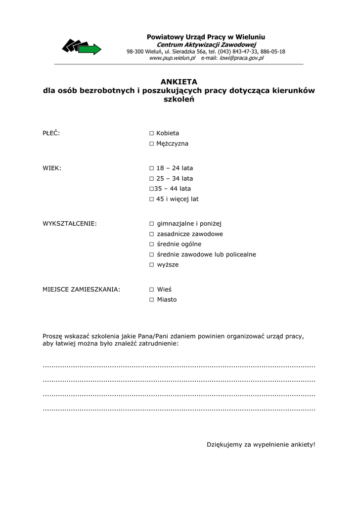 Powiatowy Urząd Pracy w Wieluniu Centrum Aktywizacji Zawodowej 98-300 Wieluń, ul. Sieradzka 56a, tel. (043) 843-47-33, 886-05-18 www.pup.wielun.pl e-mail: [email protected] ANKIETA dla osób bezrobotnych i poszukujących pracy dotycząca kierunków szkoleń PŁEĆ: □ Kobieta □ MęŜczyzna WIEK: □ 18 – 24 lata □ 25 – 34 lata □35 – 44 lata □ 45 i więcej lat WYKSZTAŁCENIE: □ □ □ □ □ gimnazjalne i poniŜej □ □ Wieś MIEJSCE ZAMIESZKANIA: zasadnicze zawodowe średnie ogólne średnie zawodowe lub policealne wyŜsze Miasto Proszę wskazać szkolenia jakie Pana/Pani zdaniem powinien organizować urząd pracy, aby łatwiej moŜna było znaleźć zatrudnienie: .............................................................................................................................. .............................................................................................................................. .............................................................................................................................. .............................................................................................................................. Dziękujemy za wypełnienie ankiety!