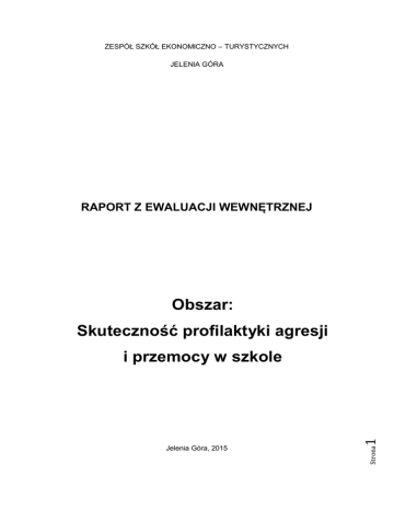 ZESPÓŁ SZKÓŁ EKONOMICZNO – TURYSTYCZNYCH JELENIA GÓRA RAPORT Z EWALUACJI WEWNĘTRZNEJ Obszar: Skuteczność profilaktyki agresji Strona Jelenia Góra, 2015 1 i przemocy w szkole Prezentowany raport jest rezultatem ewaluacji wewnętrznej przeprowadzonej w Zespole Szkół Ekonomiczno-Turystycznych w przez powołany w tym celu zespół. Ewaluacja dotyczyła Obszaru szkole. Ewaluacja została – Skuteczność profilaktyki agresji i przemocy w przeprowadzona zgodnie z przygotowanym harmonogramem. Informacje zbierane w trakcie ewaluacji pochodziły z różnych źródeł – m.in. z rozmów z pedagogiem szkoły, z ankiet przeprowadzonych wśród uczniów, rodziców, nauczycieli. Analizie poddano również dokumentację szkolną, m.in. Program Profilaktyki, dokumentację pedagoga. Zastosowanie różnorodnych metod badawczych oraz staranne zaplanowanie i przeprowadzenie ewaluacji służyły zapewnieniu wysokiego stopnia wiarygodności wyników badań. 1. Narzędzia ewaluacji Ankieta dla nauczycieli Ankieta dla rodziców Ankieta dla uczniów Wywiad z pedagogiem szkoły 2. Odbiorcy ewaluacji Odbiorcy ewaluacji rodzice uczniowie Strona 2 nauczyciele 3. Pytania kluczowe: a) Jakie dokumenty określają zasady bezpieczeństwa i normy zachowania w szkole? Czy takie dokumenty posiada placówka? b) Czy uczniowie i rodzice zostali zapoznani z wyżej wymienionymi dokumentami? c) Czy w szkole respektowane są normy społeczne wśród uczniów, nauczycieli i pracowników? d) Czy w szkole prowadzi się działania wychowawcze i profilaktyczne które mają na celu eliminowanie zagrożeń oraz wzmacnianie właściwych zachowań? e) Czy uczniowie czują się w szkole bezpiecznie i wiedzą jakich zachowań się od nich oczekuje? f) Czy szkoła rozpoznaje zagrożenia i uzależnienia wśród młodzieży? g) Czy wszyscy reagują na niewłaściwe zachowania? h) Jakie zjawiska agresji i przemocy obserwowano w szkole? Jak często się je obserwuje? Kto je zgłasza? 4. Próba badawcza: a) Losowo wybrani uczniowie klas I, II i III – rozdano 260 ankiet, zwrócono od uczniów 208, co stanowi 80 % b) Nauczyciele – 33 osoby c) Rodzice – 73 osoby d) Pedagog szkolny 5. Sposób upowszechniania raportu: a) Przeprowadzone: Prezentacja i dyskusja podczas Rady Pedagogicznej – czerwiec 2015 Zamieszczenie na stronie internetowej szkoły – czerwiec 2015 b) Proponowane: Prezentacja uczniom podczas godzin wychowawczych – wrzesień 2015 Strona roku szkolnego 2015/2016 3 Prezentacja rodzicom podczas zebrań klasowych – pierwsze zebranie 6. Wyniki ankiety przeprowadzonej wśród nauczycieli ( na podstawie 33 ankiet) a) Czy wg Pana(i) w szkole występują miejsca niebezpieczne? Tak – 12 odpowiedzi wskazane miejsca: o toaleta o korytarz o szatnia o szatnia WF Nie – 21 odpowiedzi Sala lekcyjna Przezywanie 16 2 Wyśmiewanie 11 6 Obgadywanie 19 12 Izolowanie w klasie 7 12 Dyskryminowanie 5 2 Grożenie, straszenie 1 1 Przemoc fizyczna 1 0 Używanie wulgarnych słów 27 8 Okradanie 2 0 Cyberprzemoc 3 2 Strona Korytarz 4 b) Czy spotkał się Pan(i) z poniższymi sytuacjami w szkole między młodzieżą: c) W jaki sposób zareagował Pan(i) na powyższe sytuacje? Rozmowa z uczniem, pedagogiem, rodzicem Zgłoszenie wychowawcy Obserwacja ucznia Wpis do dziennika d) W jaki sposób można przeciwdziałać wymienionym zachowaniom? Indywidualne odpowiedzi rozmowy ucznia z pedagogiem/dyrektorem – 26 Indywidualne rozmowy ucznia z wychowawcą – 29 odpowiedzi Pogadanki na godzinach wychowawczych – 27 odpowiedzi Zwracanie uwagi – 29 odpowiedzi Obniżanie oceny z zachowania – 24 odpowiedzi Uświadamianie skutków postępowania – 28 odpowiedzi Wzywanie rodziców – 3 odpowiedzi e) Jakie działania podejmuje szkoła w celu zapewnienia bezpieczeństwa uczniom? Program profilaktyki Dyżury nauczycieli Domofon Monitoring Posiadanie identyfikatorów Spotkania z policją Badania ankietowe Strona Tematyka godzin wychowawczych 5 Rady szkoleniowe f) Które w wymienionych przez Pana(ią) działań należałoby usprawnić? Prosimy o konkretne przykłady rozwiązań. Brak odpowiedzi – 7 ankiet Więcej rozmów z młodzieżą Publiczne krytykowanie zachowań negatywnych g) Z jakimi negatywnymi zachowaniami spotkał się Pan(i) ze strony uczniów? Agresja Brak kultury osobistej Próby wymuszenia oceny Krytykowanie kolegów z klasy i klasy równoległej Mówienie podniesionym głosem Podważanie autorytetu nauczyciela Lekceważenie Wulgaryzm 7. Wyniki ankiety przeprowadzonej wśród rodziców ( na podstawie 73 ankiet) a) Czy według Pani(a) dziecko czuje się w szkole bezpieczne? 60 44 tak 40 raczej tak 24 raczej nie 20 3 2 nie Strona 6 0 b) Czy jest coś, czego Pani(a) dziecko obawia się w szkole? 60 48 tak 40 nie 20 14 9 nie wiem 0 Świadek Tak 2 16 Nie 40 27 Czasami 3 6 Nie mam takich informacji 14 15 Strona Ofiara 7 c) Czy w ciągu ostatniego roku Pani(a) dziecko spotkało się z przejawami agresji w szkole jako: d) Czy dziecko bez obaw rozmawia z Panią(em) na temat agresji i przemocy w szkole? 80 60 60 tak 40 nie 20 9 brak odpowiedzi 4 0 Świadek Przezywanie 7 34 Wyśmiewanie 6 33 Obgadywanie 12 39 Izolowanie w klasie 3 22 Dyskryminowanie 2 15 Grożenie, straszenie 2 14 Przemoc fizyczna 0 10 Używanie wulgarnych słów 6 32 Okradanie 0 8 Cyberprzemoc 0 6 Strona Ofiara 8 e) Z jakimi formami agresji i przemocy spotkało się Pani(a) dziecko w szkole? (można zaznaczyć więcej niż 1 odpowiedź) Inne – terroryzowanie 0 Brak odpowiedzi 2 18 f) Jak Pani(a) zdaniem można zapobiec agresji w przemocy w szkole? Zwiększyć zasięg monitoringu – 2 odpowiedzi Więcej rozmów – 8 odpowiedzi Poruszanie tematów na godzinach wychowawczych Wyciąganie konsekwencji wobec uczniów Prace społeczne dla agresorów Publiczne wystąpienia na apelach Większa kontrola nauczycielska g) W szkole funkcjonuje program profilaktyki szkoły. Czy została Pan(i) zapoznana(y) z tym programem? 50 tak 30 nie brak odpowiedzi 20 10 0 3 1 nie wiem 9 30 39 Str