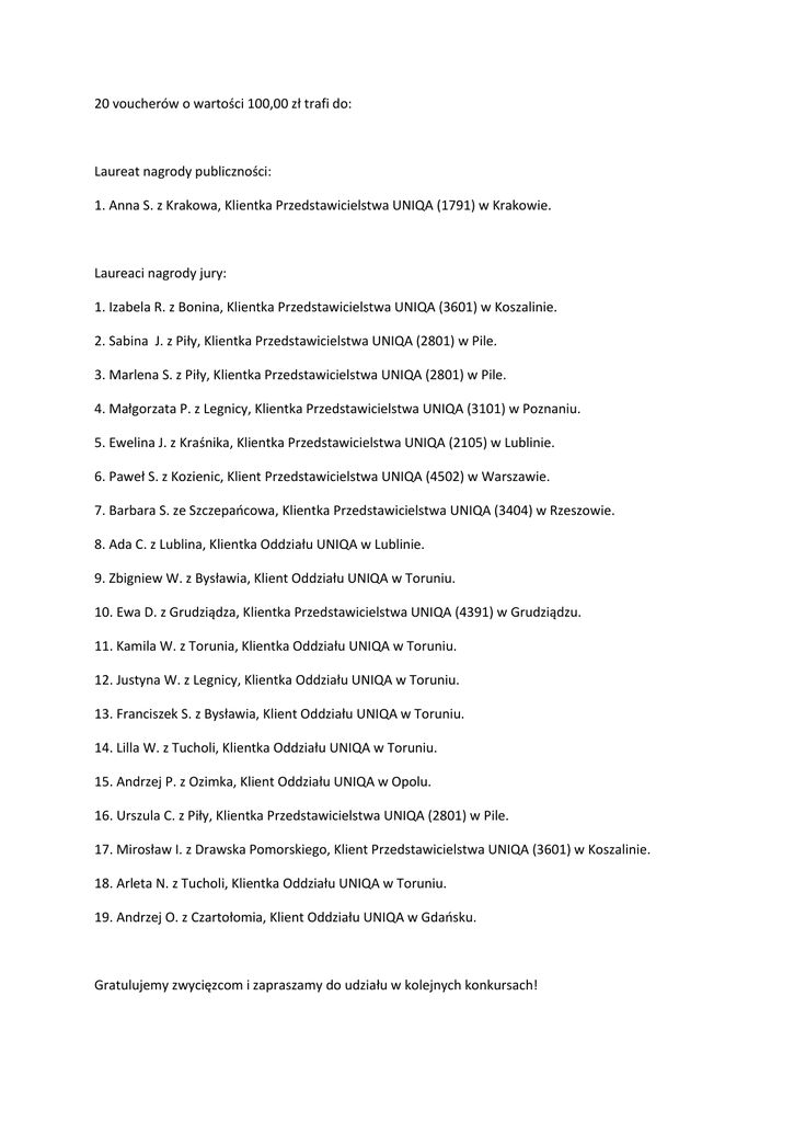 20 voucherów o wartości 100,00 zł trafi do: Laureat nagrody publiczności: 1. Anna S. z Krakowa, Klientka Przedstawicielstwa UNIQA (1791) w Krakowie. Laureaci nagrody jury: 1. Izabela R. z Bonina, Klientka Przedstawicielstwa UNIQA (3601) w Koszalinie. 2. Sabina J. z Piły, Klientka Przedstawicielstwa UNIQA (2801) w Pile. 3. Marlena S. z Piły, Klientka Przedstawicielstwa UNIQA (2801) w Pile. 4. Małgorzata P. z Legnicy, Klientka Przedstawicielstwa UNIQA (3101) w Poznaniu. 5. Ewelina J. z Kraśnika, Klientka Przedstawicielstwa UNIQA (2105) w Lublinie. 6. Paweł S. z Kozienic, Klient Przedstawicielstwa UNIQA (4502) w Warszawie. 7. Barbara S. ze Szczepańcowa, Klientka Przedstawicielstwa UNIQA (3404) w Rzeszowie. 8. Ada C. z Lublina, Klientka Oddziału UNIQA w Lublinie. 9. Zbigniew W. z Bysławia, Klient Oddziału UNIQA w Toruniu. 10. Ewa D. z Grudziądza, Klientka Przedstawicielstwa UNIQA (4391) w Grudziądzu. 11. Kamila W. z Torunia, Klientka Oddziału UNIQA w Toruniu. 12. Justyna W. z Legnicy, Klientka Oddziału UNIQA w Toruniu. 13. Franciszek S. z Bysławia, Klient Oddziału UNIQA w Toruniu. 14. Lilla W. z Tucholi, Klientka Oddziału UNIQA w Toruniu. 15. Andrzej P. z Ozimka, Klient Oddziału UNIQA w Opolu. 16. Urszula C. z Piły, Klientka Przedstawicielstwa UNIQA (2801) w Pile. 17. Mirosław I. z Drawska Pomorskiego, Klient Przedstawicielstwa UNIQA (3601) w Koszalinie. 18. Arleta N. z Tucholi, Klientka Oddziału UNIQA w Toruniu. 19. Andrzej O. z Czartołomia, Klient Oddziału UNIQA w Gdańsku. Gratulujemy zwycięzcom i zapraszamy do udziału w kolejnych konkursach!