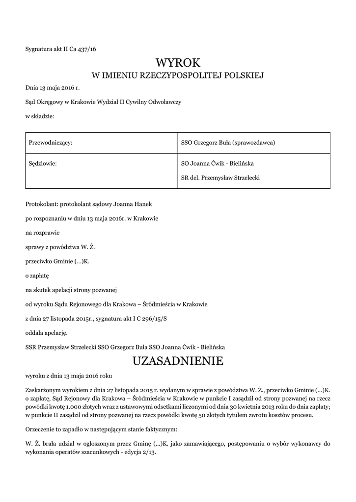 Sygnatura akt II Ca 437/16 WYROK W IMIENIU RZECZYPOSPOLITEJ POLSKIEJ Dnia 13 maja 2016 r. Sąd Okręgowy w Krakowie Wydział II Cywilny Odwoławczy w składzie: Przewodniczący: SSO Grzegorz Buła (sprawozdawca) Sędziowie: SO Joanna Ćwik - Bielińska SR del. Przemysław Strzelecki Protokolant: protokolant sądowy Joanna Hanek po rozpoznaniu w dniu 13 maja 2016r. w Krakowie na rozprawie sprawy z powództwa W. Ż. przeciwko Gminie (...)K. o zapłatę na skutek apelacji strony pozwanej od wyroku Sądu Rejonowego dla Krakowa – Śródmieścia w Krakowie z dnia 27 listopada 2015r., sygnatura akt I C 296/15/S oddala apelację. SSR Przemysław Strzelecki SSO Grzegorz Buła SSO Joanna Ćwik - Bielińska UZASADNIENIE wyroku z dnia 13 maja 2016 roku Zaskarżonym wyrokiem z dnia 27 listopada 2015 r. wydanym w sprawie z powództwa W. Ż., przeciwko Gminie (...)K. o zapłatę, Sąd Rejonowy dla Krakowa – Śródmieścia w Krakowie w punkcie I zasądził od strony pozwanej na rzecz powódki kwotę 1.000 złotych wraz z ustawowymi odsetkami liczonymi od dnia 30 kwietnia 2013 roku do dnia zapłaty; w punkcie II zasądził od strony pozwanej na rzecz powódki kwotę 50 złotych tytułem zwrotu kosztów procesu. Orzeczenie to zapadło w następującym stanie faktycznym: W. Ż. brała udział w ogłoszonym przez Gminę (...)K. jako zamawiającego, postępowaniu o wybór wykonawcy do wykonania operatów szacunkowych - edycja 2/13. Ponieważ w ofercie W. Ż. złożyła odpis z Centralnej Ewidencji i Informacji o Działalności Gospodarczej wygenerowany elektroniczne w dniu 13 stycznia 2012 r., pismem z dnia 22 kwietnia 2013 r. została wezwana do uzupełnienia aktualnego odpisu z Centralnej Ewidencji wystawionego nie wcześniej niż 6 miesięcy przed upływem składania ofert. W odpowiedzi W. Ż. w piśmie z dnia 23 kwietnia 2013 r. przesłała wygenerowany automatycznie z systemu wydruk z Centralnej Ewidencji działalności Gospodarczej. Wydruk nie zawierał daty. Pismem z dnia 30 kwietnia 2013 r. Gmina (...)K. poinformowała W. Ż. o rozstrzygnięciu przetargu na „Wykonanie operatów szacunkowych - edycja 2/13„ i wyborze oferty za cenę wykonania zamówienia w wysokości 36.777,00 zł brutto. Pismo to zostało doręczone powódce drogą elektroniczną w dniu 30 kwietnia 2013 r. Pismem z dnia 7 maja 2013 r. Gmina (...) K. wezwała W. Ż. do złożenia wyjaśnień dotyczących przyczyn nieuzupełnienia dokumentu. Wyjaśnienia takie W. Ż. złożyła w dniu 7 i 20 maja 2013 r. Zostały one uznane za niewystarczające i pismem z dnia 13 czerwca 2013 r. Gmina (...)K. powołując się na art. 46 ust. 4 ustawy prawo zamówień publicznych oświadczyła, iż zatrzymuje wniesione przez W. Ż. wadium w kwocie 1.000 zł. W oparciu o tak ustalony stan faktyczny, Sąd Rejonowy uznał, że powództwo zasługiwało na uwzględnienie w całości, gdyż zatrzymanie wadium przez stronę pozwaną było niezgodne z prawem. Zdaniem Sądu Rejonowego powódka zareagowała na wezwanie zamawiającego do uzupełnienia dokumentów i wypełniła je tak jak potrafiła. Powódka podjęła wszelkie starania mające umożliwić wykonanie nałożonego na nią obowiązku w postaci przedłożenia wyciągu z rejestru działalności gospodarczej. Na wezwanie zamawiającego, przedłożyła żądany dokument. Mimo, iż działanie powódki obarczone było błędem – bowiem wygenerowany elektronicznie wyciąg nie był opatrzony datą, to jednak zdaniem Sądu nie sposób było działania takiego postawić na równi z zachowaniem zawinionym, umożliwiającym zastosowanie sankcji. Dla spełnienia znamion zawinienia konieczna zaś byłaby całkowita bierność, umyślność, celowość, czy też nasilenie złej woli w niepodporządkowaniu się wezwaniu zamawiającego. Mając powyższe na uwadze, Sąd Rejonowy stanął na stanowisko, że wobec braku wypełnienia dyspozycji art. 46 ust. 4a p.z.p., strona pozwana bezpodstawnie zatrzymała wadium i roszczenie powódki o jego zwrot podlegało uwzględnieniu, o czym Sąd Rejonowy orzekł na zasadzie art. 405 k.c.w zw. z art. 410 k.c., wraz z odsetkami od dnia doręczenia pisma o rozstrzygnięciu przetargu czyli 30 kwietnia 2013 roku. O kosztach Sąd Rejonowy orzekł na zasadzie art. 98 k.p.c. Apelację od powyższego wyroku wniosła strona pozwana, zaskarżyła go w całości i zarzuciła: 1. niewyjaśnienie wszystkich okoliczności istotnych dla sprawy, co doprowadziło do bezzasadnego zasądzenia żądanej przez powódkę kwoty; 2. naruszenie prawa materialnego poprzez błędną wykładnię art. 46 ust. 4a ustawy z dnia 29 stycznia 2004 r. Prawo zamówień publicznych; 3. błąd w ustaleniu, że działanie powódki było niezawinione, uniemożliwiające zastosowanie sankcji w postaci zatrzymania wadium. Wskazując na powyższe zarzuty apelująca wniosła o zmianę zaskarżonego wyroku w całości i oddalenie powództwa oraz o zasądzenie na swoją rzecz od powódki kosztów procesu, w tym kosztów zastępstwa procesowego, ewentualnie o uchylenie zaskarżonego wyroku w całości i przekazanie sprawy Sądowi pierwszej instancji do ponownego rozpoznania przy uwzględnieniu kosztów postępowania apelacyjnego, jako części kosztów procesu. W uzasadnieniu strona pozwana, cytując treść art. 46 ust. 4a ustawy z dnia 29 stycznia 2004 r. Prawo zamówień publicznych, podniosła, że powódka nie udowodniła w toku postępowania, że nie ponosi winy za zaistniały stan rzeczy. Zdaniem apelującej, złożony przez powódkę dokument nie był dokumentem, którego obowiązek załączenia wynika z rozporządzenia Prezesa Rady Ministrów z dnia 19.02.2013 r. w sprawie rodzajów dokumentów, jakich może żądać zamawiający od wykonawcy, oraz form, w jakich te dokumenty mogą być składane - wystawiony nie wcześniej niż 6 miesięcy przed upływem składania ofert (§ 3 ust 1 pkt 2). W konsekwencji w opinii skarżącej nie można było uznać, że przedłożenie dokumentu bez daty na odpisie z Central