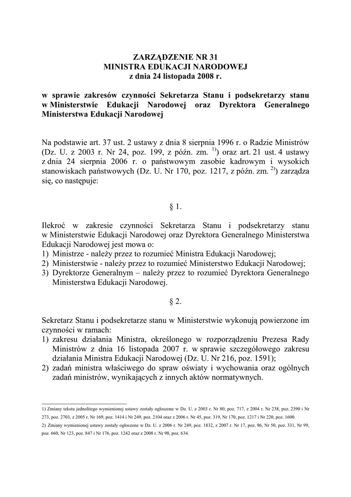 ZARZĄDZENIE NR 31 MINISTRA EDUKACJI NARODOWEJ z dnia 24 listopada 2008 r. w sprawie zakresów czynności Sekretarza Stanu i podsekretarzy stanu w Ministerstwie Edukacji Narodowej oraz Dyrektora Generalnego Ministerstwa Edukacji Narodowej Na podstawie art. 37 ust. 2 ustawy z dnia 8 sierpnia 1996 r. o Radzie Ministrów (Dz. U. z 2003 r. Nr 24, poz. 199, z późn. zm. 1)) oraz art. 21 ust. 4 ustawy z dnia 24 sierpnia 2006 r. o państwowym zasobie kadrowym i wysokich stanowiskach państwowych (Dz. U. Nr 170, poz. 1217, z późn. zm. 2)) zarządza się, co następuje: § 1. Ilekroć w zakresie czynności Sekretarza Stanu i podsekretarzy stanu w Ministerstwie Edukacji Narodowej oraz Dyrektora Generalnego Ministerstwa Edukacji Narodowej jest mowa o: 1) Ministrze - naleŜy przez to rozumieć Ministra Edukacji Narodowej; 2) Ministerstwie - naleŜy przez to rozumieć Ministerstwo Edukacji Narodowej; 3) Dyrektorze Generalnym – naleŜy przez to rozumieć Dyrektora Generalnego Ministerstwa Edukacji Narodowej. § 2. Sekretarz Stanu i podsekretarze stanu w Ministerstwie wykonują powierzone im czynności w ramach: 1) zakresu działania Ministra, określonego w rozporządzeniu Prezesa Rady Ministrów z dnia 16 listopada 2007 r. w sprawie szczegółowego zakresu działania Ministra Edukacji Narodowej (Dz. U. Nr 216, poz. 1591); 2) zadań ministra właściwego do spraw oświaty i wychowania oraz ogólnych zadań ministrów, wynikających z innych aktów normatywnych. 1) Zmiany tekstu jednolitego wymienionej ustawy zostały ogłoszone w Dz. U. z 2003 r. Nr 80, poz. 717, z 2004 r. Nr 238, poz. 2390 i Nr 273, poz. 2703, z 2005 r. Nr 169, poz. 1414 i Nr 249, poz. 2104 oraz z 2006 r. Nr 45, poz. 319, Nr 170, poz. 1217 i Nr 220, poz. 1600. 2) Zmiany wymienionej ustawy zostały ogłoszone w Dz. U. z 2006 r. Nr 249, poz. 1832, z 2007 r. Nr 17, poz. 96, Nr 50, poz. 331, Nr 99, poz. 660, Nr 123, poz. 847 i Nr 176, poz. 1242 oraz z 2008 r. Nr 98, poz. 634. § 3. W razie nieobecności Ministra zastępuje go Sekretarz Stanu, a w razie nieobecności Sekretarza Stanu – upowaŜniony przez Ministra podsekretarz stanu. § 4. 1. Do zakresu czynności Sekretarza Stanu Krystyny Szumilas naleŜą sprawy: 1) współpracy z Sejmem i Senatem Rzeczypospolitej Polskiej, w tym przedkładania informacji i sprawozdań, uczestniczenia w posiedzeniach właściwych komisji parlamentarnych, udzielania odpowiedzi posłom i senatorom; 2) koordynacji kontaktów z jednostkami samorządu terytorialnego; 3) udziału w pracach stałego Komitetu Rady Ministrów; 4) funkcjonowania publicznych i niepublicznych: a) szkół podstawowych i gimnazjów, z wyłączeniem specjalnych, b) liceów ogólnokształcących i dwuletnich uzupełniających liceów ogólnokształcących dla dzieci i młodzieŜy; 5) kształcenia ogólnego; 6) wychowawczej funkcji szkoły; 7) uspołeczniania szkoły, w tym rozwoju samorządności uczniowskiej; 8) nadzoru nad działalnością kuratorów oświaty w zakresie sprawowania nadzoru pedagogicznego; 9) ustalania zasad sprawowania nadzoru pedagogicznego; 10) egzaminów wewnętrznych i zewnętrznych, z wyłączeniem egzaminów potwierdzających kwalifikacje zawodowe; 11) upowszechniania i ochrony praw człowieka oraz praw dziecka, w tym realizacji działań wynikających z Konwencji o Prawach Dziecka; 12) kształcenia nauczycieli; 13) doskonalenia nauczycieli; 14) funkcjonowania: a) zakładów kształcenia i placówek doskonalenia nauczycieli, b) bibliotek pedagogicznych; 15) kwalifikacji wymaganych od nauczycieli; 16) projektów w zakresie kształcenia i doskonalenia nauczycieli; 17) doradztwa metodycznego; 18) akredytacji placówek doskonalenia nauczycieli; 19) uznawania nabytych w państwach członkowskich Unii Europejskiej kwalifikacji do wykonywania zawodu regulowanego – nauczyciel; 20) projektów współfinansowanych z Europejskiego Funduszu Społecznego w zakresie zadań nadzorowanych jednostek organizacyjnych; 21) projektowania budŜetu państwa w części 30 – Oświata i wychowanie; 22) nadzoru nad realizacją dochodów i wydatków budŜetowych w części 30 – Oświata i wychowanie; 2 23) subwencjonowania jednostek samorządu terytorialnego; 24) finansowania oświaty rządowej; 25) nadzoru nad obsługą finansowo-księgową działań realizowanych z udziałem funduszy strukturalnych w obszarze oświaty i wychowania; 26) finansowania programów lub przedsięwzięć określonych przez Ministra; 27) pełnienia funkcji instytucji pośredniczącej dla Priorytetu III Programu Operacyjnego Kapitał Ludzki na lata 2007-2013 (PO KL); 28) pełnienia funkcji instytucji wdraŜającej i pośredniczącej dla Sektorowego Programu Operacyjnego Rozwój Zasobów Ludzkich na lata 2004-2006 (SPO RZL); 29) koordynacji działań w ramach polityki spójności w obszarze oświaty i wychowania oraz współpracy z instytucjami Komisji Europejskiej w tym zakresie; 30) ewaluacji instrumentów wdraŜania funduszy strukturalnych w obszarze oświaty i wychowania; 31) monitorowania w zakresie wsparcia z funduszy strukturalnych. 2. Sekretarz Stanu Krystyna Szumilas wyznacza zadania i nadzoruje ich realizację w sprawach objętych zakresem działania: 1) Departamentu Ekonomicznego, z wyłączeniem zadań, o których mowa w § 8 ust. 2 pkt 1; 2) Departamentu Funduszy Strukturalnych; 3) Departamentu Kształcenia Ogólnego i Wychowania; 4) Biura WdraŜania Europejskiego Funduszu Społecznego. 3. Sekretarz Stanu Krystyna Szumilas wykonuje zadania wynikające z nadzoru Ministra nad: 1) Centralną Komisją Egzaminacyjną; 2) okręgowymi komisjami egzaminacyjnymi; 3) Centralnym Ośrodkiem Doskonalenia Nauczycieli; 4) zakładami kształcenia nauczycieli. § 5. 1. Do zakresu czynności Podsekretarza Stanu Zbigniewa Marciniaka naleŜą sprawy: 1) kontaktów ze związkami zawodowymi; 2) projektowania systemowego w obszarze oświaty; 3) problematyki badań edukacyjnych; 4) prac statystycznych i analitycznych z zakresu oświaty; 5) systemu informacji ośw