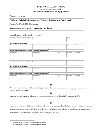 UMOWA nr ......./2016/OPBo z dnia .................. 2016r. w sprawie odpłatności za wyżywienie Zawarta pomiędzy, Publiczną Szkołą Podstawową im. Tadeusza Kościuszki w Bodzanowie Bodzanów 83, 48-340 Głuchołazy Reprezentowanym przez: Dyrektora Lillę Żurek a rodzicami / opiekunami prawnymi: Imię i nazwisko rodzica / opiekuna prawnego Pesel Adres zameldowania Miejscowość kod pocztowy Adres zamieszkania / adres do korespondencji Miejscowość Ulica Nr domu Nr lokalu Ulica Nr domu Nr lokalu 1) kod pocztowy Imię i nazwisko rodzica / opiekuna prawnego Pesel Adres zameldowania Miejscowość kod pocztowy Adres zamieszkania / adres do korespondencji Miejscowość Ulica Nr domu Nr lokalu Ulica Nr domu Nr lokalu 2) kod pocztowy §1 Przedmiotem umowy jest korzystanie przez dziecko .......................................................................... (imię i nazwisko dziecka) z wyżywienia w szkole. §2 Umowa zostaje zawarta od dnia .......................................... do dnia 31 sierpnia 2017 r. §3 Umowa zostaje przedłużona na kolejny rok szkolny, w przypadku złożenia przez rodzica / opiekuna prawnego oświadczenia woli korzystania przez dziecko z wyżywienia w kolejnym roku szkolnym. (wzór oświadczenia stanowi załącznik nr 1 do niniejszej umowy). 1 2 wypełnić jeżeli jest inny niż adres zameldowania wypełnić jeżeli jest inny niż adres zameldowania 1 §4 1. Szkoła umożliwia dziecku odpłatnie korzystanie z posiłku jednodaniowego w kwocie 5,00 zł brutto. 2. Miesięczna opłata za korzystanie przez dziecko z wyżywienia ustalana jest jako iloczyn liczby dni w których dziecko uczęszczało do szkoły oraz dziennej stawki za wyżywienie, o której mowa w ust. 1. 3. Informację o miesięcznej kwocie odpłatności za wyżywienie rodzice / opiekunowie prawni/ mogą uzyskać w Publicznej Szkole Podstawowej nr 1 w sekretariacie pod numerem telefonu 774391340 w dni robocze w godz. 800-1400. §5 1. Rodzice / opiekunowie prawni zobowiązani są do uiszczenia opłaty za korzystanie przez dziecko z wyżywienia do 20 dnia każdego miesiąca następującego po miesiącu, w którym dziecko korzystało z wyżywienia. 2. Opłata za korzystanie przez dziecko z wyżywienia wnoszona jest w Kasie Urzędu Miejskiego w Głuchołazach ul. Rynek 15, 48-340 Głuchołazy lub na rachunek bankowy nr: ........................................................................................................................................................ 3. W przypadku nieterminowego wnoszenia opłat za korzystanie przez dziecko z wyżywienia będą naliczane ustawowe odsetki za opóźnienie. §6 1. Dyrektor szkoły zastrzega sobie prawo zmiany wysokości dziennych stawek odpłatności za wyżywienie, o których mowa § 4 ust.1. 2. Dyrektor szkoły zobowiązany jest poinformować w formie ogłoszenia na tablicy ogłoszeń lub na stronie internetowej o zmianie dziennych stawek za wyżywienie. 3. Zmiana dziennych stawek za wyżywienie nie wymaga aneksu do niniejszej umowy. §7 Zmiany niniejszej umowy wymagają formy pisemnej. §8 W sprawach nieuregulowanych umową zastosowanie mają przepisy Kodeksu cywilnego. §9 Umowa została sporządzona w trzech jednobrzmiących egzemplarzach. 1) ............................................. 2) ................................................ ............................................... (podpis rodziców/opiekunów prawnych) (podpis Dyrektora) 2 Załącznik nr 1 do umowy …............................................................. (miejscowość i data) …................................................. (nazwisko i imię rodzica/ opiekuna prawnego dziecka) …................................................... (adres zamieszkania) …................................................... OŚWIADCZENIE potwierdzające przez rodziców wolę korzystania przez dziecko z wyżywienia w kolejnym roku szkolnym. Deklaruję chęć korzystania przez moje dziecko …............................................................... z wyżywienia w Publicznej Szkole Podstawowej nr 1 w Głuchołazach w roku szkolnym..........................................na zasadzie kontynuacji warunków UMOWY nr ......./2016/OPBo z dnia .................. 2016r. w sprawie odpłatności za wyżywienie. Oświadczam, że dane zawarte w w/w umowie nie uległy zmianie. W przypadku zmiany danych zobowiązuję się do bezzwłocznego poinformowania dyrektora szkoły. ….................................................... ( podpis rodzica/opiekuna prawnego) …...................................... (data złożenia oświadczenia) 3 .............................................................. ( podpis Dyrektora)