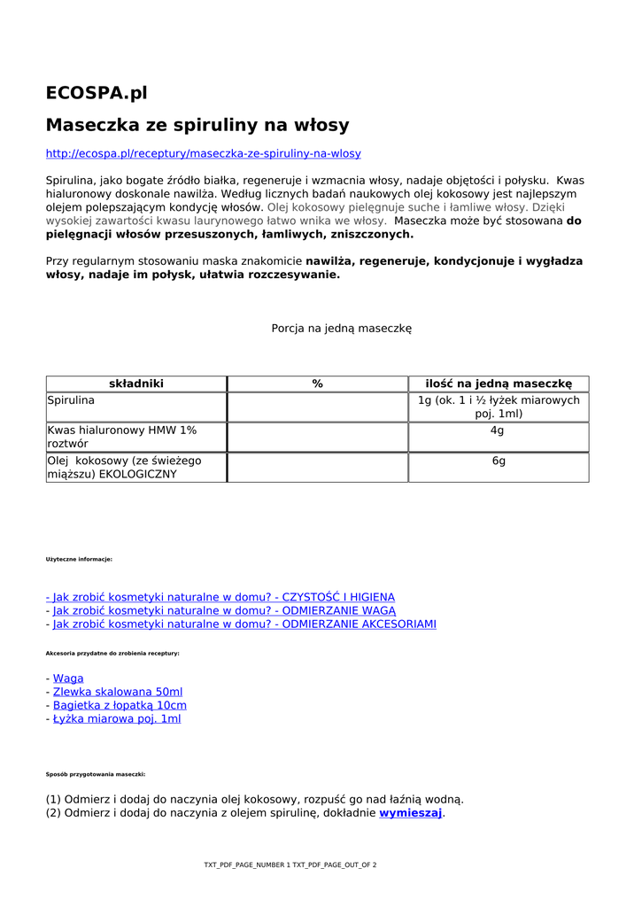ECOSPA.pl Maseczka ze spiruliny na włosy http://ecospa.pl/receptury/maseczka-ze-spiruliny-na-wlosy Spirulina, jako bogate źródło białka, regeneruje i wzmacnia włosy, nadaje objętości i połysku. Kwas hialuronowy doskonale nawilża. Według licznych badań naukowych olej kokosowy jest najlepszym olejem polepszającym kondycję włosów. Olej kokosowy pielęgnuje suche i łamliwe włosy. Dzięki wysokiej zawartości kwasu laurynowego łatwo wnika we włosy. Maseczka może być stosowana do pielęgnacji włosów przesuszonych, łamliwych, zniszczonych. Przy regularnym stosowaniu maska znakomicie nawilża, regeneruje, kondycjonuje i wygładza włosy, nadaje im połysk, ułatwia rozczesywanie. Porcja na jedną maseczkę składniki % ilość na jedną maseczkę Spirulina 1g (ok. 1 i ½ łyżek miarowych poj. 1ml) Kwas hialuronowy HMW 1% roztwór 4g Olej kokosowy (ze świeżego miąższu) EKOLOGICZNY 6g Użyteczne informacje: - Jak zrobić kosmetyki naturalne w domu? - CZYSTOŚĆ I HIGIENA - Jak zrobić kosmetyki naturalne w domu? - ODMIERZANIE WAGĄ - Jak zrobić kosmetyki naturalne w domu? - ODMIERZANIE AKCESORIAMI Akcesoria przydatne do zrobienia receptury: - Waga - Zlewka skalowana 50ml - Bagietka z łopatką 10cm - Łyżka miarowa poj. 1ml Sposób przygotowania maseczki: (1) Odmierz i dodaj do naczynia olej kokosowy, rozpuść go nad łaźnią wodną. (2) Odmierz i dodaj do naczynia z olejem spirulinę, dokładnie wymieszaj. TXT_PDF_PAGE_NUMBER 1 TXT_PDF_PAGE_OUT_OF 2 (3) Dodaj kwas hialuronowy, wymieszaj. Instrukcja użycia maseczki: (1) Maseczkę wmasuj we włosy. (2) W celu lepszej penetracji składników maski w strukturę włosów załóż czepek foliowy lub owiń włosy folią spożywczą i ciepłym ręcznikiem. (3) Po upływie 20-25 minut dokładnie zmyj maskę ciepłą, ale nie gorącą wodą i umyj włosy szamponem. Przechowywanie stosowanie termin przydatności ___ 1 raz w tygodniu zużyć od razu po przygotowaniu TXT_PDF_PAGE_NUMBER 2 TXT_PDF_PAGE_OUT_OF 2