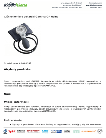 Ciśnieniomierz Lekarski Gamma GP Heine Nr Katalogowy M-00.09.242 Atrybuty produktu: Nowy ciśnieniomierz serii GAMMA, innowacja w dziale ciśnieniomierzy HEINE, wyposażony w niezawodny, precyzyjnie dozujący zawór przyciskowy, dla prawo- i leworęcznych użytkowników, konstrukcyjnie odpowiadający aparatowi GAMMA G5. Opis: Więcej informacji: Nowy ciśnieniomierz serii GAMMA, innowacja w dziale ciśnieniomierzy HEINE, wyposażony w niezawodny, precyzyjnie dozujący zawór przyciskowy, dla prawo- i leworęcznych użytkowników, konstrukcyjnie odpowiadający aparatowi GAMMA G5. Cechy produktu: Zgodny z protokołem European Society of Hypertension, nadający się do zastosowań klinicznych. Odporny na wstrząsy. Bezlateksowy. Nowoczesny system pomiaru ciśnienia. (w trakcie opatentowania) Manometr odporny na ciśnienie. Wytrzymały i niezawodny. Mikrofiltr. Ochrania manometr i zawór. Wskaźnik z dużą skalą odczytową. Czytelna niebiesko-biała skala o średnicy 56 mm. Wysokiej jakości wskaźnik. Precyzyjnie skalibrowany, wytrzymały i odporny na wstrząsy. Duża gruszka pompująca. Szybko napompowuje mankiet. Szybki pomiar. Innowacyjny zawór przyciskowy (Patent DE 10353157). Niezawodny, precyzyjnie dozujący system, super szybkie wypuszczanie powietrza. Obudowa w całości wykonana z wytrzymałej masy termoplastycznej (Poliamid, TP elastomer). Absorbuje wstrząsy, antypoślizgowa. Łyżka z tworzywa termoplastycznego (Poliamid). Możliwość przełożenia łyżki dla osób prawo- lub leworęcznych. Wysokiej jakości jedno-wężykowy mankiet z zapięciem na rzepy. Nadaje się do prania. Ergonomiczny design. GP jest idealnie zbalansowany w celu maksymalizacji komfortu i ułatwienia pracy. 5 lat gwarancji. Powered by TCPDF (www.tcpdf.org)