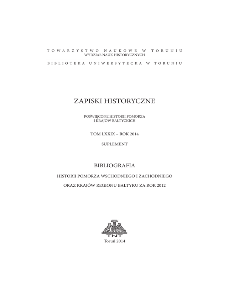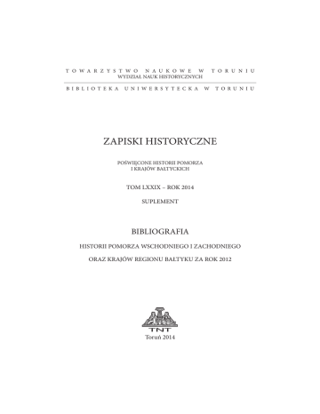 T O W A R Z Y S T W O N A U K O W E W WYDZIAŁ NAUK HISTORYCZNYCH B I B L I O T E K A U N I W E R S Y T E C K A T O R U N I U W T O R U N I U ZAPISKI HISTORYCZNE POŚWIĘCONE HISTORII POMORZA I KRAJÓW BAŁTYCKICH TOM LXXIX – ROK 2014 SUPLEMENT BIBLIOGRAFIA HISTORII POMORZA WSCHODNIEGO I ZACHODNIEGO ORAZ KRAJÓW REGIONU BAŁTYKU ZA ROK 2012 Toruń 2014 BIBLIOGRAFIA HISTORII POMORZA WSCHODNIEGO I ZACHODNIEGO oraz KRAJÓW REGIONU BAŁTYKU ZA ROK 2012 wraz z uzupełnieniami z lat poprzednich Opracowali ADAM BIEDRZYCKI i URSZULA ZABORSKA współpraca WOJCIECH SZRAMOWSKI RADA REDAKCYJNA ZAPISEK HISTORYCZNYCH Przewodniczący: Mieczysław Wojciechowski Członkowie: Karola Ciesielska, Jerzy Dygdała, Karin Friedrich, Rolf Hammel-Kiesow, Grzegorz Jasiński, Edmund Kizik, Janusz Małłek, Ilgvars Misāns, Michael G. Müller, Alvydas Nikžentaitis, Stanisław Salmonowicz, Jürgen Sarnowsky, Janusz Tandecki, Kazimierz Wajda, Edward Włodarczyk KOMITET REDAKCYJNY ZAPISEK HISTORYCZNYCH Redaktor: Bogusław Dybaś, zastępca redaktora: Roman Czaja Członkowie: Mirosław Golon, Tomasz Kempa, Katarzyna Minczykowska, Magdalena Niedzielska, Piotr Oliński, Przemysław Olstowski, Mariusz Wołos Sekretarze Redakcji: Paweł A. Jeziorski, Joanna Orzeł Skład i łamanie: WENA Włodzimierz Dąbrowski Adres Redakcji Towarzystwo Naukowe w Toruniu 87-100 Toruń, ul. Wysoka 16 www.zapiskihistoryczne.pl e-mail: [email protected] Instrukcja dla autorów znajduje się na stronie internetowej oraz w każdym zeszycie pierwszym czasopisma Pierwotną wersją czasopisma jest wersja drukowana Redakcja stosuje procedury zabezpieczające przed zjawiskami ghostwriting i guest authorship Articles appearing in this journal are abstracted and indexed in „Historical Abstracts” Wydanie publikacji dofinansowane przez Ministerstwo Nauki i Szkolnictwa Wyższego ISSN 0044-1791 TOWARZYSTWO NAUKOWE W TORUNIU Wydanie I. Ark. wyd. 27,6 Ark. druk. 21,4 Wąbrzeskie Zakłady Graficzne Wąbrzeźno, ul. Mickiewicza 15 www.wzg.com.pl SPIS TREŚCI Wstęp ................................................................................................................................................7 I. II. III. IV. A. Ogólne Bibliografie ..............................................................................................................................9 Czasopisma ............................................................................................................................10 Towarzystwa, instytuty i zjazdy naukowe .............................................................................17 Nauki pomocnicze historii .....................................................................................................21 1. Archiwa ..............................................................................................................................21 2. Biblioteki ...........................................................................................................................24 3. Muzea, wystawy ................................................................................................................27 4. Historiografia, krytyka źródeł ............................................................................................32 5. Sfragistyka, genealogia, heraldyka, numizmatyka ............................................................37 6. Geografia historyczna ........................................................................................................39 7. Język i onomastyka ............................................................................................................40 B. Pomorze Wschodnie I. Opracowania i zagadnienia ogólne ........................................................................................46 II. Źródła .....................................................................................................................................49 III. Zagadnienia społeczno-gospodarcze .....................................................................................54 1. Geografia gospodarcza .......................................................................................................54 2. Osadnictwo i demografia ...................................................................................................55 3. Etnografia ...........................................................................................................................57 4. Historia społeczno-gospodarcza ........................................................................................59 IV. Zagadnienia prawnoustrojowe ...............................................................................................66 V. Zagadnienie kultury umysłowej i artystycznej ......................................................................67 1. Ogólne ................................................................................................................................67 2. Historia nauki i literatury ...................................................................................................69 3. Historia szkolnictwa wyższego i oświaty ..........................................................................72 4. Historia sztuki ...................................................................................................................77 5. Historia książki, prasy i innych mediów ............................................................................91 VI. Kościoły i wyznania ..............................................................................................................95 VII. Regiony i miejscowości ......................................................................................................107 VIII. Osoby ...................................................................................................................................128 IX. Okres do 1815 r. ...............................