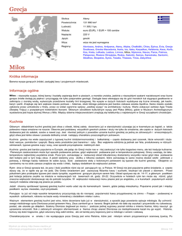 Grecja Stolica: Ateny Powierzchnia: 131 990 km² Ludność: 11 305,1 tys. Waluta: euro (EUR), 1 EUR = 100 centów Napięcie: 220 V Język: grecki Wiza: wiza nie jest wymagana Regiony: Alonissos, Andros, Antiparos, Ateny, Attyka, Chalkidiki, Chios, Epirus, Evia, Grecja Środkowa, Grecka Macedonia, Ikaria, Ios, Itaka, Karpathos, Kefalonia, Keos, Korfu, Kos, Kreta, Lefkada, Lesbos, Limnos, Milos, Mykonos, Naxos, Paros, Patmos, Peloponez, Riwiera Olimpijska, Rodos, Saloniki, Samos, Samotraka, Santorini, Skiathos, Skopelos, Syros, Tesalia, Thassos, Tinos, Zakynthos Milos Krótka informacja Barwna wyspa gorących źródeł, zastygłej lawy i przyjemnych miasteczek. Informacje ogólne Milos – niezwykła wyspa, której barwy i kształty zapierają dech w piesiach, a morskie urwiska, jaskinie z niezwykłymi szatami naciekowymi oraz liczne gorące źródła dodają jej piękna i przyciągają nie tylko pasjonatów geologii. Zastygła lawa wlewająca się do grot morskich lub stygnąca gwałtownie w zetknięciu z morską wodą, wytworzyła przedziwne kształty linii brzegowej. Na wyspie w dużych ilościach wydobywa się liczne minerały, jak kaolin, baryt i perlit. Znajduje się tam większe miasto portowe – Adamas, obok którego położona jest bardzo ciekawa wioska Apollina. Samo miasto zostało założone przez uchodźców z Krety, przez co widać ogromne wpływy „wielkiej wyspy” na architekturę i kulturę. Warto zobaczyć cerkiew Agia Triada (Świętej Trójcy) z przepięknymi kreteńskimi ikonami. Głównym ośrodkiem kulturalnym wyspy jest Plaka (Milos), gdzie w Muzeum Archeologicznym wystawiona jest kopia słynnej Wenus z Milo. Między obiema miejscowościami znajdują się katakumby z najstarszymi w Grecji szczątkami chrześcijan. Kuchnia Głównym składnikiem kuchni greckiej jest oliwa z oliwek, której zalety doceniano już w starożytności używając jej w kosmetyce po kąpieli, a także polewano mięsa smażone na ruszcie. Obecnie jest podstawą wszystkich greckich potraw i służy nie tylko do smażenia, ale często w dużych ilościach dodawana jest do sałatek, sosów a nawet zup. Jest również jednym z powodów uznania kuchni greckiej za jedną ze zdrowszych i smaczniejszych, gdyż oliwa jest lekko strawa i posiada delikatny smak nadający charakteru poszczególnym potrawom. Kuchnia grecka ma wiele zapożyczeń z typowej kuchni śródziemnomorskiej i bałkańskiej – często dodawany jest czosnek, liście winorośli i duża ilość warzyw, pomidorów i papryki. Bazą wielu produktów jest baranina i ryby. Bez wątpienia odróżnia ją jednak ser feta, produkowany w różnych odmianach, typowe greckie zupy i sosy, oraz sposób przyrządzania niektórych dań. Kuchnia grecka jest bardzo popularna w Europie, ale jadąc do Grecji może nas w niej zaskoczyć nie tylko bogactwo menu, ale też tradycje kulinarne. Pierwszym zaskoczeniem może być sposób podawania potraw, gdyż większość podawana jest w temperaturze pokojowej. Grecy uważają, że taka temperatura najbardziej uwydatnia smak. Poza tym, zamawiając w restauracji obiad kilkudaniowy dostaniemy wszystko naraz gdyż idea podawania dań kolejno jest w tym kraju obca. A jeżeli siedzimy przy stoliku z kilkoma osobami, które zamawiają to samo można dostać wielki półmisek z potrawą, z którego każdy nabierze ile sobie życzy. Suto zastawione stoły z kolorowymi potrawami są typowe dla kuchni greckiej. Obojętnie co zamówimy na na stole zawsze znajdzie się woda i chleb, będący dodatkiem do większości potraw. Rytm dnia w Grecji sprawia też, że pory i ilość posiłków różni się od panujących np. w Polsce. W Grecji nie jest popularne pełne śniadanie, a często słyszy się, że w ogóle się go nie jada. Dla Greka śniadaniem jest zazwyczaj filiżanka kawy i sucharki, biszkopt lub placek z dżemem. Przed południem jako przekąska typowe jest ciasto tyropitta, wypełnione gorącym płynnym serem feta. Obiad spożywa się ok. 14-17, a głównym posiłkiem jest kolacja jedzona zwykle na mieście w restauracjach lub tawernach ok. godz. 20-22. Oczywiście w hotelach rytm ten może się różnić, gdyż znaczna większość dostosowuje się do potrzeb turystów. W większości restauracji menu pisane jest po angielsku, a w kurortach popularnych wśród naszych rodaków zdarzają się pisane po polsku. Jeżeli chcemy spróbować typowej greckiej kuchni warto udać się do kameralnych tawern, gdzie jadają mieszkańcy. Popularne przed jak i między posiłkami są tzw. mezedes, czyli przystawki. Panujące tu już od maja wysokie temperatury przyczyniają się do rosnącej popularności kawy przygotowanej na zimno – Frappe – podawanej w wysokich szklankach, robiona na bazie wody mineralnej z dodatkiem mleka i cukru. Ważnym elementem greckiej kuchni jest wino, które doceniane było już w starożytności, a sposób jego powstania opisuje mitologia. By uchronić swego nieślubnego syna Dionizosa przed gniewem Hery, Zeus zamienił go w barana. Bogini jednak nie dała się oszukać i przywróciła mu człowieczą postać, ale ukarała go obłędem. Szalony Dionizos żeglował po morzu i podczas jednej wyprawy poznał rolnika o imieniu Ikarios, który nauczył go uprawiania winorośli. Sok z zebranych winogron sfermentował, a Ikarius chcąc ukarać Dionizosa za niedopilnowanie kazał mu go wypić. Historia, kończy się dość tragicznie, gdyż odurzony bóg zabił rolnika, ale od tamtej pory kojarzony jest w mitologii z winem i zabawą. Charakterystyczne w smaku i nie występujące poza Grecją jest wino Retsina, które jest młodym winem przyprawionym sosnową żywicą. Po Wydruk ze strony http://www.merlinx.pl Informacje przygotowane przez MerlinX Strona 1/4 wytłoczeniu leżakuje zaledwie kilka tygodni i nadaje się do spożycia, jednak po mniej więcej roku, jej smak przypomina ocet. Narodowym trunkiem Grecji jest też „ouso me mese”, znane jako ouzo – 48-procentowy alkohol doprawiany anyż