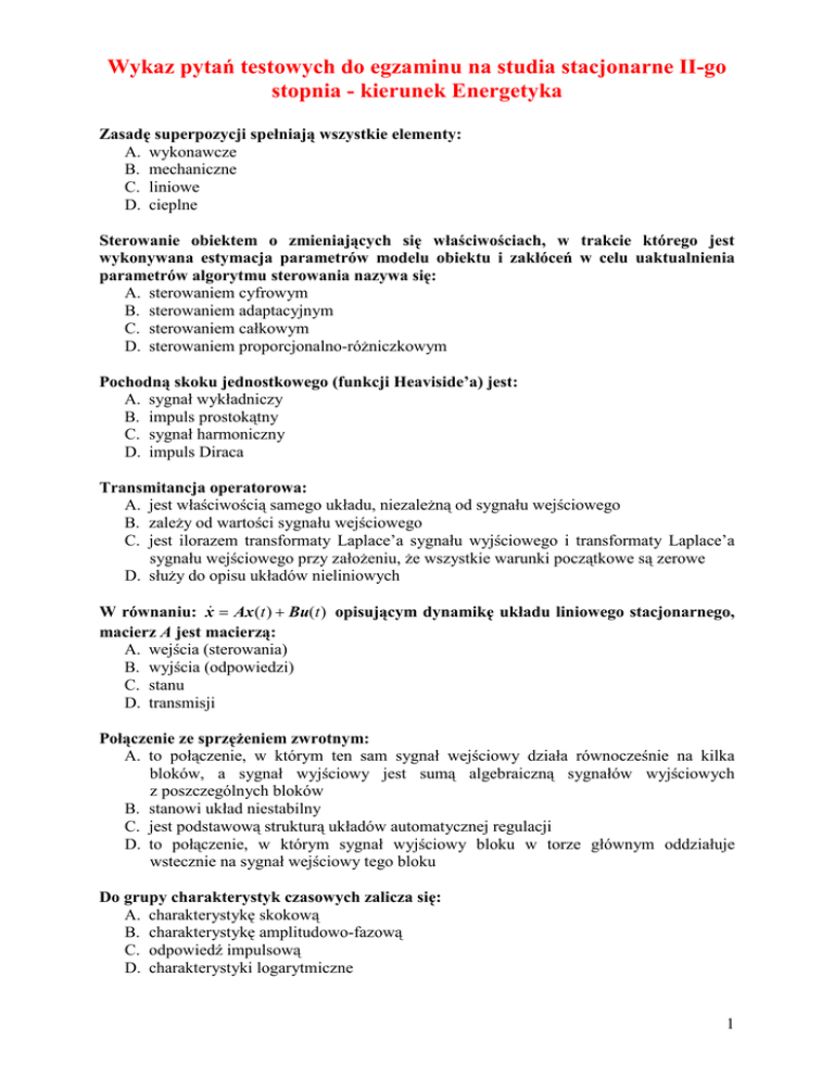 Wykaz pytań testowych do egzaminu na studia stacjonarne II